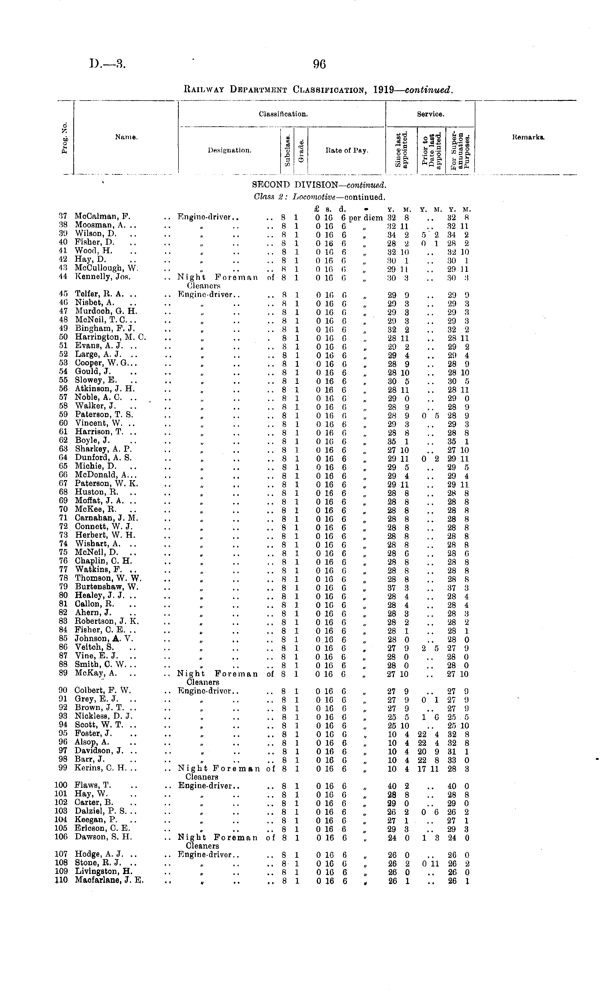 Classification. Service. X. ob Name. o fc ft d X A o >. ft £ . * CD O <D o » <& fi si r ~ i a -- w m Designation. *3 <e Hate of Pay. g-g oa-g x g §, g 5 9 & S* S m a E Keinarka. SECOND DIVISION continued. Class 2: Locomotive —continued, 37 MoCalman, F. 38 Moosman, A. .. 39 Wilson, I). .. 40 Fisher, D. 41 Wood, H. 42 Hay, D. 43 MoCullough, W. 44 Kennelly, Jos. 45 Telfer, R. A. 40 Nisbet, A. 47 Murdoch, G. H. 4.8 McNeil, T. C. .. 49 Bingham, F. J. 50 Harrington, M. C. 51 Evans, A. J. 52 Large, A. J. 53 Cooper, W. G... 54 Gould, J. 55 Slowey, E. 56 Atkinson, J. H. 57 Noble, A. G. 58 Walker, J. .. 59 Paterson, T. S. 60 Vincent, W. .. 61 Harrison, T. .. 62 Boyle, J. 63 Sharkey, A. P. 04 Dunford, A. S. 65 Michie, D. 66 McDonald, A... 67 Paterson, W. K. 68 Huston, R. .. 69 Moffat, J. A. .. 70 McKee, R. .. 71 Carnahan, J. M. 72 Connott, W. J. 73 Herbert, W. H. 74 Wishart, A. .. 75 McNeil, D. .. 76 Chaplin, O. H. 77 Watkins, F. .. 78 Thomson, W. W. 79 Burtenshaw, W. 80 Healey, J. J. 81 Callon, R. 82 Ahem, J. 83 Robertson, J. K. 84 Fisher, O. E. .. 85 Johnson, A. V. 8G Veitch, S. 87 Vine, E.J. .. 88 Smith, C W. .. 89 McKay, A. .. 90 Colbert, F. W. 91 Grey, E. J. 92 Brown, J. T. 93 Niokless, D. J. 94 Scott, W. T. 95 Foster, J. 96 Alsop, A. 97 Davidson, J. .. 98 Barr, J. 99 Kerins, C. H. .. .00 Flaws, T. .01 Hay, W. 02 Carter, B. L03 Dalziel, P. S. .. .04 Keegan, P. .05 Ericson, C. E. LOO Dawson, S. H. 107 Hodge, A. J. L08 Stone, R. J. .. LOO Livingston, H. 110 Maofarlane, J. E. £ s. d. - Y. M. Y. M. Y. M. .. Engine-driver.. ..8 1 0 10 6 per diem 32 8 .. 32 8 ..8 1 0 10 0 „ 32 11 .. 32 11 ..8 1 0 10 6 „ 34 2 5 2 34 2 ..81 0 16 0 „ 28 2 0 1 28 2 ..8 1 0 16 6 , 32 10 .. 32 10 ..81 0 16 (i „ 80 1 .. 80 1 ..810 16 6 „ 29 11 .. 29 11 .. Night Foreman of 8 .1 016 6 , 30 3 .. 30 3 Gleaners .. Engine-driver.. ..8 1 0 10 0 , 29 9 .. 29 9 ..81 0 16 6 „ 29 3 29 3 ..8 1 0 16 0 „ 29 3 .. 29 8 ..8 1 0 16 6 , 29 3 29 3 ..8 1 0 16 6 , 32 2 32 2 .81 0 16 6 „ 28 11 .. 28 11 ..8 1 0 10 0 , 29 2 29 2 ..8 1 0 16 6 „ 29 4 .. 29 4 ..8 1 0 .16 6 , 28 9 28 9 ..81 0166 „ 28 10 28 10 ..8 1 0 10 0 „ 30 5 30 5 ..8 1 0 16 6 , 28 11 .. 28 11 ..810 1.6 6 „ 29 0 29 0 ..8 1 0 16 6 „ 28 9 28 9 ..810 16 6 „ 28 9 0 5 28 9 ..81 0 16 6 , 29 3 29 3 ..8 1 0 16 6 „ 28 8 28 8 ..8 1 0 16 6 „ 35 1 .. 35 1 ..8 1 0 16 6 „ 27 10 27 10 ...8 1 0 16 6 „ 29 11 0 2 29 11 ..8 1 0 16 6 „ 29 5 .. 29 5 ..81 0 16 6 „ 29 4 .. 29 4 ..81 0 16 6 „ 29 II .. 29 11 ..81 0 16 6 „ 28 8 .. 28 8 ..8 1 0 16 6 „ 28 8 28 8 ..8 1 0 10 0 „ 28 8 28 8 ..81 0 16 6 „ 28 8 .. 28 8 ..81 0 16 6 , 28 8 28 8 ..8 1 0 16 6 „ 28 8 .. 28 8 ..8 1 0 16 C „ 28 8 28 8 ..8 1 0 10 6 „ 28 6 28 6 ..81 0 16 6 , 28 8 28 8 ..8 1 0 10 6 „ 28 8 28 8 ..8 1 0 10 6 , 28 8 28 8 ..8 1 0 16 6 , 37 3 37 3 ..81 0 10 0 „ 28 4 .. 28 4 ..81 0 10 0 , 28 4 28 4 ..81 0 16 6 , 28 3 28 3 ..8 1 0 10 0 „ 28 2 .. 28 2 ..81 0 16 6 , 28 1 28 I ..8 1 0 10 6 „ 28 0 .. 28 0 ..8 1 0 16 6 , 27 9 2 5 27 9 ..81 0 16 6 „ 28 0 28 0 ..81 0 10 6 , 28 0 28 0 .. Night Foreman of 8 1 0 16 6 „ 27 10 .. 27 10 Cleaners .. Engine-driver.. ..8 1 0 10 6 „ 27 9 .. 27 9 ..8 1 0 16 0 , 27 9 0 1 27 9 ..8 1 0 16 6 „ 27 9 .. 27 9 ..8 1 0 16 6 „ 25 5 1 0 25 5 ..8 1 0 16 6 , 25 10 ..25 10 ..8 1 0 10 0 „ 10 4 22 4 32 8 ..8 1 0 16 6 „ 10 4 22 4 32 8 ..8 1 0 16 0 „ 10 4 20 9 31 1 ..81 0 16 0 , 10 4 22 8 33 0 .. Night Foreman of 8 1 0 16 6 „ 10 4 17 11 28 3 Cleaners .. Engine-driver.. ..8 1 0 10 6 „ 40 2 .. 40 0 ..8 1 0 16 6 „ 28 8 28 8 ..8 1 0 16 6 „ 29 0 .. 29 0 ..8 1 0 16 6 „ 26 2 0 6 26 2 ..8 1 0 16 6 „ 27 1 27 1 ..8 1 0 16 6 „ 29 3 29 3 .. Night Foreman of 8 1 0 1.6 0 „ 24 0 1 3 24 0 Cleaners .. Engine-driver.. ..8 1 0 10 6 „ 26 0 .. 20 0 ..8 1 0 10 (i , 26 2 0 11 26 2 ..8 1 0 10 6 , 26 0 26 0 , ,. ..8 1 0 16 6 , 26 1 ., 26 1