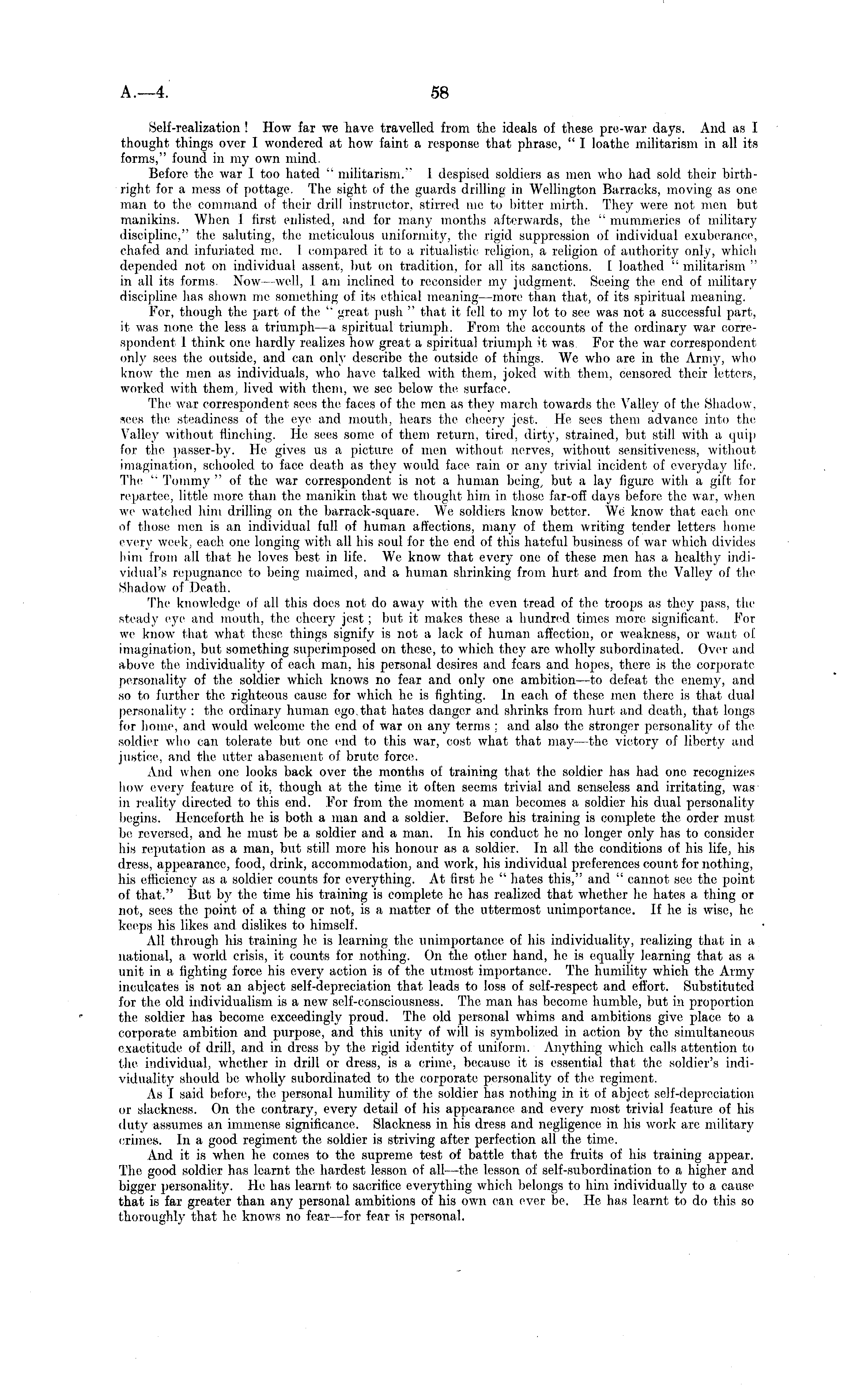 A.—4. Self-realization ! How far we have travelled from the ideals of these pre-war days. And as I thought things over I wondered at how faint a response that phrase, I loathe militarism in all itforms," found in my own mind. Before the war I too hated " militarism." I despised soldiers as men who had sold their birthright for a mess of pottage. The sight of the guards drilling in Wellington Barracks, moving as one man to the command of their drill instructor, stirred me to bitter mirth. They were not men but manikins. When 1 first enlisted, and for many months afterwards, the " mummeries of military discipline," the saluting, the meticulous uniformity, the rigid suppression of individual exuberance, chafed and infuriated me. I compared it to a ritualistic religion, a religion of authority only, which depended not on individual assent, but on tradition, for all its sanctions. 1 loathed " militarism " in all its forms. Now-well, lam inclined to reconsider my judgment. Seeing the end of military discipline has shown me something of its ethical meaning—more than that, of its spiritual meaning. For, though the part of the " great push " that it fell to my lot to see was not a successful part, it was none the less a triumph—a spiritual triumph. From the accounts of the ordinary war correspondent 1 think one hardly realizes how great a spiritual triumph it was. For the war correspondent only sees the outside, and can only describe the outside of things. We who are in the Army, who know the men as individuals, who have talked with them, joked with them, censored their letters, worked with them, lived with them, we see below the surface. The war correspondent sees the faces of the men as they march towards the Valley of the Shadow, sees the steadiness of the eye and mouth, hears the cheery jest. He sees them advance into the Valley without flinching. He sees some of them return, tired, dirty, strained, but still with a quip for the passer-by. He gives us a picture of men without nerves, without sensitiveness, without imagination, schooled to face death as they would face rain or any trivial incident of everyday life, The " Tommy " of the war correspondent is not a human being, but a lay figure with a gift for repartee, little more than the manikin that we thought him in those far-off days before the war, when we watched him drilling on the barrack-square. We soldiers know bettor. We know that each one of those men is an individual full of human affections, many of them writing tender letters home every week, each one longing with all his soul for the end of this hateful business of war which divides him from all that he loves best in life. We know that every one of these men has a healthy individual's repugnance to being maimed, and a human shrinking from hurt and from the Valley of the Shadow of Death. The knowledge of all this docs not do away with the even tread of the troops as they pass, the steady eye and mouth, the cheery jest ; but it makes these a hundred times more, significant. For we know that what these things signify is not a lack of human affection, or weakness, or want of imagination, but something superimposed on these, to which they arc wholly subordinated. Over and above the individuality of each, man, his personal desires and fears and hopes, there, is the corporate personality of the soldier which knows no fear and only one ambition—to defeat the enemy, and so to further the righteous cause for which he is fighting. In each of these men there is that dual personality : the ordinary human ego, that hates danger and, shrinks from hurt and death, that longs for home, and would welcome the end of war on any terms : and also the stronger personality of the soldier who can tolerate but one end to this war, cost what that may —the victory of liberty and justice, and the utter abasement of brute force. And when one looks back over the months of training that the soldier has had one recognizes how every feature of it, though at the time it often seems trivial and senseless and irritating, was in reality directed to this end. For from the moment a man becomes a soldier his dual personality begins. Henceforth he is both a man and a soldier. Before his training is complete the order must be reversed, and he must be a soldier and a man. In his conduct he no longer only has to consider his reputation as a man, but still more his honour as a soldier. In all the conditions of his life, his dress, appearance, food, drink, accommodation, and work, his individual preferences count for nothing, his efficiency as a soldier counts for everything. At first he " hates this," and " cannot sec; the point of that." But by the time his training is complete he has realized that whether he hates a thing or not, sees the point of a thing or not, is a matter of the uttermost unimportance. If he is wise, he keeps his likes and dislikes to himself. All through his training he is learning the unimportance of his individuality, realizing that in a national, a world crisis, it counts for nothing. On the other hand, he is equally learning that as a unit in a fighting force his every action is of the utmost importance. The humility which the Army inculcates is not an abject self-depreciation that leads to loss of self-respect and effort. Substituted for the old individualism is a new self-consciousness. The man has become humble, but in proportion the soldier has become exceedingly proud. The old personal whims and ambitions give place to a corporate ambition and purpose, and this unity of will is symbolized in action by the simultaneous exactitude of drill, and in dress by the rigid identity of uniform. Anything which calls attention to the individual, whether in drill or dress, is a crime, because it is essential that the soldier's individuality should be wholly subordinated to the corporate personality of the regiment. As I said before, the personal humility of the soldier has nothing in it of abject