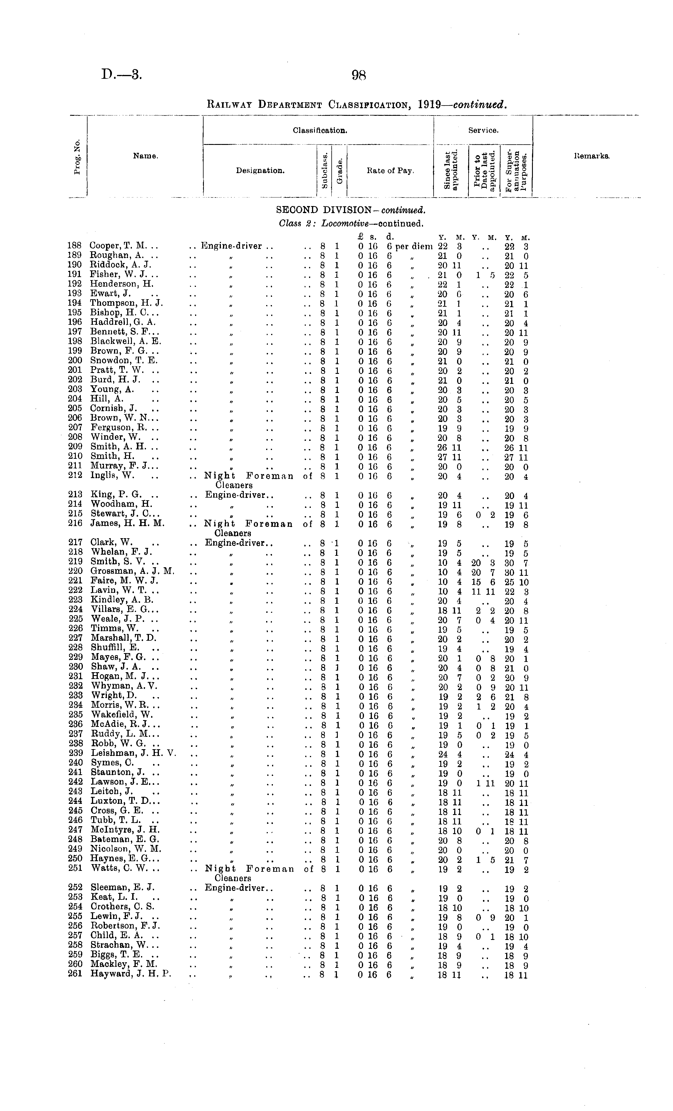 Classification. Service. Service. 6 Sh Name. o 0 65 tr p CM _\ OJ 0j _ .3 tt _ -..-OC O Designation. "3 <a Kate of Pay. g-g o o-g oo § g, JJ "-ol H i$ 6,ojh Itemarke, SECOND DIVISION- continued. Glass 2: Locomotive —oontinued. 188 Cooper, T. M. .. 189 Roughan, A. .. 190 Riddock, A. J. 191 Fisher, W. J. .. 192 Henderson, H. 193 Ewart, J. 194 Thompson, H. J. 195 Bishop, H. C. .. 196 Haddrell.G. A. 197 Bennett, S. F... 198 Blackwell, A. E. 199 Brown, F. G. .. 200 Snowdon, T. E. 201 Pratt, T. W. 202 Burd, H. J. 203 Young, A. 204 Hill, A. 205 Cornish, J. 206 Brown, W.N... 207 Ferguson, R. .. 208 Winder, W. .. 209 Smith, A. H. .. 210 Smith, H. 211 Murray, F. J... 212 Inglis, W. 213 King, P. G. 214 Woodham, H. 215 Stewart, J. C... 216 James, H. H. M. 217 Clark, W. 218 Wbelan, F. J. 219 Smith, S. V. 220 Grossman, A. J. M. 221 Faire, M. W. J. 222 Lavin, W. T. .. 223 Kindley, A. B. 224 Villars, E. G... 225 Weale, J. P. 226 Timms, W. .. 227 Marshall, T. D. 228 Shuffill, E. .. 229 Mayes, F. G. 230 Shaw, J. A. 231 Hogan, M. J. .. 232 Whyman, A.V. 233 Wright, D. .. 234 Morris, W. R. 235 Wakefield, W. 236 McAdie, R. J. .. 237 Ruddy, L. M... 238 Robb, W. G. 239 Leishman, J. H. V. 240 Symes, C. 241 Staunton, J. .. 242 Lawson, J. E... 243 Leitoh.J. 244 Luxton, T. D... 245 Cross, G. E. 246 Tubb, T. L. 247 Molntyre, J. H. 248 Bateman, E. G. 249 Nicolson, W. M. 250 Haynes, E. G... 251 Watts, C. W. .. 252 Sleeman, E. J. 253 Keat, L. I. .. 254 Crothers, C. S. 255 Lewin,F. J. .. 256 Robertson, F. J. 257 Child, E. A. 258 Strachan, W. .. 259 Biggs, T. E. 260 Maokley, F. M. 261 Hayward, J. H. P. £ S. d. Y. M. Y. M. Y. M. ..Engine-driver.. ..8 1 0 10 6 per diem 22 3 .. 22 3 ..8 1 0 16 6 „ 21 0 21 0 ..8 1 0 16 6 „ 20 11 20 11 ..8 1 0 16 6 „. 21 0 1 5 22 5 ..81 0 16 6 „ 22 1 22 1 ..81 0 16 6 „ 20 6 20 6 ..81 0 16 6 „ 21 1 21 1 ..81 0 16 6 . 21 1 21 1 ..81 0 16 6 „ 20 , 20 4 ..81 0 16 6 „ 20 11 20 11 ..810 10 6 „ 20 9 .. 20 9 ..81 0 16 6 „ 20 9 20 9 ..81 0 16 6 „ 21 0 21 0 ..81 0 16 6 „ 20 2 20 2 ..81 0 10 6 „ 21 0 ..210 ..8 1 0 16 6 „ 20 3 20 3 ..8 1 0 10 6 „ 20 5 20 5 ..8 1 0 16 6 „ 20 3 20 3 ..8 1 0 10 6 „ 20 3 20 3 ..81 0 16 6 „ 19 9 19 9 ..81 0 16 6 „ 20 8 20 8 ..81 0 16 6 „ 26 11 26 11 ..8 1 0 16 6 „ 27 11 .. 27 11 ..81 0 16 6 „ 20 0 20 0 .. Night Foreman of 8 1 0 16 6 „ 20 4 20 4 Cleaners .. Engine-driver.. ..8 1 0 10 0 „ 20 4 .. 20 4 ..8 1 0 16 6 „ 19 11 19 11 ..81 0 16 6 „ 19 6 0 2 19 6 .. Night Foreman of 8 1 0 16 6 „ 19 8 19 8 Cleaners .. Engine-driver.. ..8 1 0 16 6 „ 19 5 .. 19 5 ..8 1 0 16 6 „ 19 5 19 5 ..8 1 0 16 6 „ 10 4 20 3 30 7 ..8 1 0 10 6 „ 10 4 20 7 30 11 ..8 1 0 16 6 „ 10 4 15 6 25 10 ..8 1 0 10 6 „ 10 4 11 11 22 3 ..8 1 0 16 6 „ 20 4 20 4 ..8 1 0 10 6 „ 18 11 2 2 20 8 ..8 1 0 16 6 „ 20 7 0 4 20 11 ..81 0 16 6 „ 19 5 19 5 ..81 0 16 6 „ 20 2 20 2 ..8 1 0 16 6 „ 19 4 19 4 ..8 1 0 10 6 „ 20 1 0 8 20 1 ..81 0 16 6 „ 20 4 0 8 21 0 ..81 0 16 6 „ 20 7 0 2 20 9 ..81 0 16 6 „ 20 2 0 9 20 11 ..81 0 10 6 „ 19 2 2 6 21 8 ..81 0 16 6 „ 19 2 1 2 20 4 ..8 1 0 16 6 , 19 2 19 2 ..8 1 0 16 6 „ 19 1 0 1 19 1 ..81 0 16 6 „ 19 5 0 2 19 5 ..8 1 0 16 6 „ 19 0 19 0 ..81 0 16 6 „ 24 4 24 4 ..81 0 16 6 „ 19 2 19 2 ..8 1 0 16 6 „ 19 0 19 0 ..8 1 0 16 6 „ 19 0 1 11 20 11 ..81 0 10 6 „ 18 11 18 11 ..81 0 10 6 , 18 11 18 11 ..81 0 16 6 „ 18 11 18 11 ..8 1 0 16 0 „ 18 11 18 11 ..81 0 16 6 „ 18 10 0 1 18 11 ..81 0 16 6 „ 20 8 20 8 ..8 1 0 10 6 „ 20 0 20 0 ..81 0 10 6 „ 20 2 1 5 21 7 .. Night Foreman of 8 1 0 10 6 „ 19 2 19 2 Cleaners .. Engine-driver.. ..8 1 0 16 6 „ 19 2 .. 19 2 ..81 0 16 6 „ 19 0 19 0 ..8 1 0 16 6 „ 18 10 18 10 ..81 0 16 6 „ 19 8 0 9 20 1 ..8 1 0 16 6 „ 19 0 19 0 ..81 0 10 6 „ 18 9 0 1 18 10 ..8 1 0 16 6 „ 19 4 19 4 ..81 0 16 6 „ 18 9 18 9 ..81 0 16 6 „ 18 9 18 9 ..81 0 16 6 „ 18 11 ., 18 11