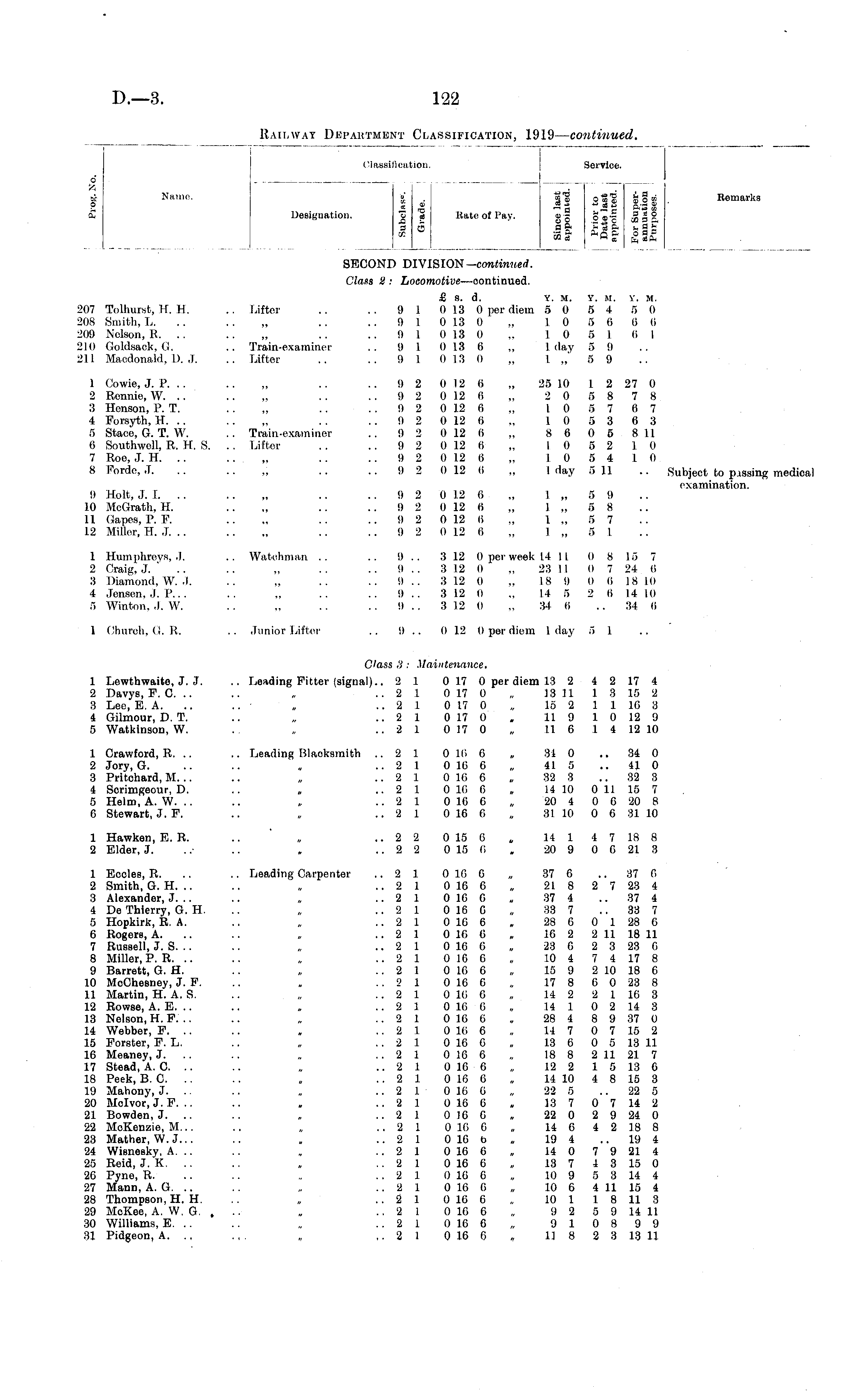 o' A, fjc Name. p ft T ""■"" ' " ~ ' " Classification. Service. i . |o So» Remarks « o * g ■" b B pVs $ ' Designation. o « Rate of Pay. «-g oo-f 3. g 2, 30 aftfc-clafcafc K 8S £Sft SECOND DIVISION—continued. Class 2 : Locomotive —continued. 207 Tolhurst, H. H. 208 Smith, L. 209 Nelson, R. .. 210 Goldsack, G. 211 Macdonald, 1). J. £ S. d. Y. M. Y. M. V. M. .. Lifter .. .. 9 1 0 13 0 per diem 5 0 5 4 5 0 .. 9 1 0 13 0 „ 1 0 5 6 6 6 .. 9 1 0 13 0 „ 10 5 16 1 Train-examiner .. 9 1 0 13 6 ,, 1 day 5 9 .. Lifter .. .. 9 10 13 0 „ I. „' 5 9 1 Cowie, J. P. . . 2 Rennie, W. .. 3 Henson, P. T. 4 Forsyth, H. .. 5 Staco, G. T. W. 6 Southwell, R. H. S. 7 Roe, J. H. 8 Fordo, J. ..920126 „ 25 10 1 2 27 0 9 2 0 12 6 „ 2 0 5 8 7 8 .. „ .. .. 9 2 0 12 6 „ 10 5 7 6 7 9 2 0 12 6 ., 10 5 3 6 3 .. Train-examiner .. 9 2 0 12 6 „ 8 6 0 5 8 II Lifter .. 9 2 0 12 6 „ 10 5 2 1 0 .. „ .. .. 9 2 0 12 6 „ 10 5 4 I 0 • • 9 2 0 12 (i „ I day 5 11 .. Subject to passing medical examination. 9 Holt, J. I. .. 10 McGrath, H. 11 Gapes, P. F. 12 Miller, H. J. .. .. 9 2 0 12 6 „ 1 „ 5 9 9 2 0 12 6 „ 1. „ 5 8 .. 9 2 0 12 6 „ 1 „ 5 7 .. 9 2 0 12 6 „ 1 „ 5 1 1 Humphreys, J. 2 Craig, J. 3 Diamond, W. .1. 4 Jensen, J. P... 5 Wmton, .1. W. . . Watchman .. .. 9 .. 3 12 0 per week 14 11 0 8 15 7 9 .. 3 12 0 „ 23 11 0 7 24 6 9 ., 3 12 0 ,-, 18 9 0 6 18 10 9 . . 3 12 0 „ 14 5 2 6 14 10 9 . . 3 12 0 „ 34 6 .. 34 6 1 Church, G. R. Junior Lifter .. 9 .. 0 12 0 per diem 1 day 5 1 Class ,'l : Maintenance, 1 Lewthwaite, J. J. 2 Davys, F. O. 3 Lee, E. A. 4 Gilmour, D. T. 5 Watkinson, W. .. Leading Fitter (signal).. 2 1 0 17 0 per diem 13 2 4 2 17 4 ..2 1 0 17 0 „ 13 11 1 3 15 2 ..2 1 0 17 0 15 2 1 1 16 3 .. 2 1 0 17 0 11 9 1 0 12 9 ..2 1 0 17 0 „ 11 0 1 4 12 10 1 Crawford, R. .. 2 Jory,G. 3 Pritchard, M. .. 4 Scrimgeour, D. 5 Helm, A. W. .. 6 Stewart, J. F. .. Leading Blacksmith ..2 1 0 16 6 „ 31 0 .. 34 0 ..2 1 0 16 0 „ 41 5 41 0 .. 2 1 0 16 6 32 3 .. 32 3 .. 2 1 0 10 6 14 10 0 11 15 7 .. 2 1 0 16 6 „ 20 4 0 6 20 8 .. 2 1 0 16 6 31 10 0 6 31 10 1 Hawken, E. R. 2 Elder, J. .. 2 2 0 15 6 14 1 4 7 18 8 ..2 2 0 15 6 , 20 9 0 6 21 3 1 Eccles, R. 2 Smith, G. H. .. 3 Alexander, J. .. 4 De Thierry, G. H. 5 Hopkirk, R. A. 6 Rogers, A. 7 Russell, J. S. .. 8 Miller, P. R. 9 Barrett, G. H. 10 McChesney, J. F. 11 Martin, H. A. S. 12 Rowse, A. E. .. 13 Nelson, H. F. .. 14 Webber, F. .. 15 Forster, F. L. 16 Meaney, J. 17 Stead, A. O. 18 Peek, B. 0. 19 Mahony, J. .. 20 Mclvor, J.F. .. 21 Bowden, J. .. 22 McKenzie, M... 23 Mather, W.J... 24 Wisnesky, A. .. 25 Reid, J. K. 26 Pyne, R. 27 Mann, A. G. 28 Thompson, H. H. 29 McKee, A. W. G. , 30 Williams, E. .. 31 Pidgeon, A. .. .. Leading Carpenter ..21 0 16 6 „ 37 6 .. 37 6 .. 2 1 0 16 0 21 8 2 7 23 4 .. 2 1 0 10 6 „ 37 4 37 4 .. 2 1 0 16 0 .33 7 .. 33 7 .. 2 1 0 16 6 28 6 0 1 28 6 .. 2 1 0 16 6 „ 16 2 2 11 18 11 .. 2 1 0 16 6 „ 23 6 2 3 23 6 .. 2 1 0 16 6 „ 10 4 7 4 17 8 .. 2 1 0 16 6 15 9 2 10 18 6 .. 2 1 0 16 6 „ 17 8 6 0 23 8 .. 2 1 0 10 6 14 2 2 1 16 3 .. 2 1 0 16 6 14 1 0 2 14 3 ., 2 1 0 16 6 28 4 8 9 37 0 .. 2 1 0 16 6 „ 11 7 0 7 15 2 .. 2 1 0 16 6 13 6 0 5 13 11 .. 2 1 0 10 6 18 8 2 11 21 7 .. 2 1 0 16 6 12 2 1 5 13 6 ..21 0 16 6 „ 14 10 4 8 15 3 .. 2 1 0 16 6 22 5 .. 22 5 ..2 1 0 16 6 „ 13 7 0 7 14 2 .. 2 1 0 10 6 „ 22 0 2 9 24 0 .. 2 1 0 16 6 14 6 4 2 18 8 .. 2 1 0 16 b „ 19 4 19 4 ..21 0 16 6 „ 14 0 7 9 2.1 4 ..210 10 6 „ 13 7 4 3 15 0 . . 2 1 0 16 6 „ 10 9 5 3 14 4 ..2 1 0 16 6 „ 10 6 4 11 15 4 .. 2 1 0 16 6 10 1 1 8 11 3 ..21 0 16 6 92 5 9 14 11 .. 2 1 6 16 6 9 10 8 9 9 ,.21 0 16 6 „ 1] 8 2 3 13 11