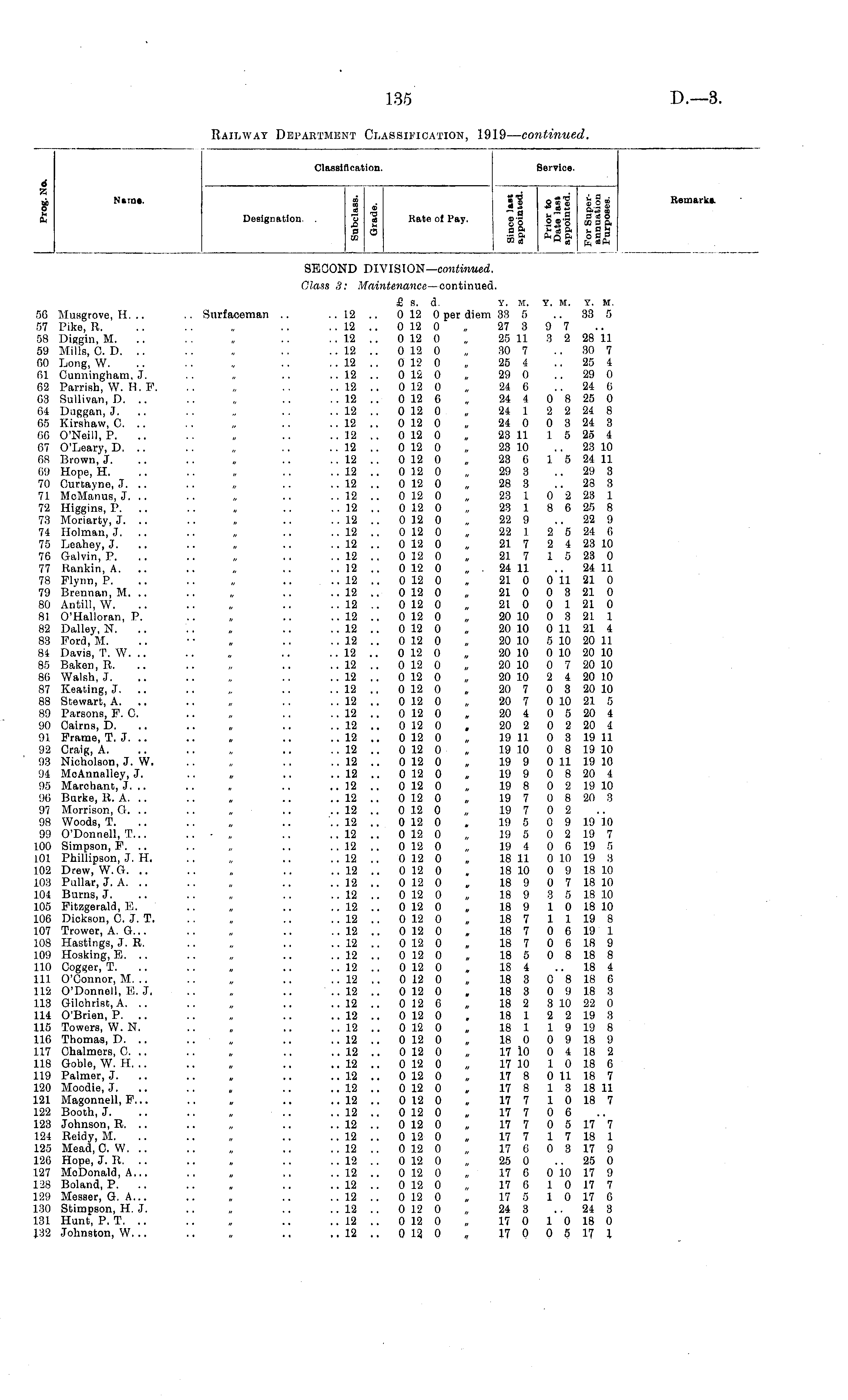 Classification, Service. 4 A, fc o, Name. Designation. . CO " 4 f~f ■a 2 B 22s fc 3 O CO Hate of Pay. • -a >. H»cd 52 a%~ 75 fc°o go oo-g oft fc « a ■623 fc R& i. a ■ gjo 3 *aS O co s a fc a fc 3 a 3 h "ft Remarks. SECOND DIVISION— continued. Class 3: Maintenance— continued. 56 Musgrove, H. .. 57 Pike, R. 58 Diggin, M. .. 59 Mills, CD. 60 Long, W. 61 Cunningham, J. 62 Parrish, W. H. F. 63 Sullivan, D. .. 64 Duggan, J. 65 Kirshaw, C .. 66 O'Neill, P. 67 O'Leary, D. .. 08 Brown, J. 69 Hope, H. 70 Ourtayne, J. .. 71 McManus, J. .. 72 Higgins, P. .. 73 Moriarty, J. .. 74 Holman, J. 75 Leahey, J. 76 Galvin, P. 77 Rankin, A. 78 Flynn, P. 79 Brennan, M. .. 80 Antill, W. 81 O'Halloran, P. 82 Dalley, N. 83 Ford, M. 84 Davis, T. W. .. 85 Baken, R. 86 Walsh, J. 87 Keating, J. .. 88 Stewart, A. .. 89 Parsons, F. 0. 90 Cairns, D. 91 Frame, T. J. 92 Craig, A. 93 Nicholson, J. W. 94 MoAnnalley, J. 95 Marchant, J. .. 90 Burke, R. A. .. 97 Morrison, G. .. 98 Woods, T. 99 O'Donnell, T... 1.00 Simpson, F. .. 101 Phillipson, J. H. 102 Drew.W.G. .. 103 Pullar, J. A. 104 Burns, J. 105 Fitzgerald, E. 106 Dickson, O, J. T. 107 Trower, A. G... 108 Hastings, J. R. 109 Hosking, E, .. 110 Cogger, T. 111 O'Connor, M. .. 112 O'Donnell, E. J. 113 Gilchrist, A. .. 114 O'Brien, P. .. 115 Towers, W. N. 116 Thomas, D. .. 1.17 Chalmers, C .. 118 Goble, W. H. .. 119 Palmer, J. 120 Moodie, J. 121 Magonnell, F... 122 Booth, J. 123 Johnson, R. .. 124 Reidy, M. 125 Mead, O. W. .. 126 Hope, J. R. 127 MoDonald, A... 128 Boland, P. 129 Messer, G. A... 1.30 Stimpson, H. J. 131 Hunt, P. T. 132 Johnston, W. .. .. Surfaceman .. £ s. d. Y. M. ..12 .. 0 12 0 per diem 33 5 .. 12 .. 0 12 0 „ 27 3 .. 1.2 .. 0 12 0 „ 25 11 .. 12 .. 0 12 0 „ 30 7 .. 12 .. 0 12 0 „ 25 4 .. 12 .. 0 12 0 „ 29 0 .. 12 .. 0 12 0 „ 24 6 .. 12 .. 0 12 6 „ 24 4 .. 12 .. 0 12 0 „ 24 1 .. 12 .. 0 12 0 „ 24 0 .. 12 .. 0 12 0 „ 23 11 .. 12 .. 0 12 0 „ 23 10 .. 12 .. 0 12 0 „ 23 6 .. 12 .. 0 12 0 29 3 .. 12 .. 0 12 0 „ 28 3 .. 12 .. 0 12 0 „ 23 1 .. 12 .. 0 12 0 „ 23 1 .. 12 .. 0 12 0 „ 22 9 .. 12 .. 0 12 0 „ 22 1 .. 12 .. 0 12 0 „ 21 7 .. 12 .. 0 12 0 „ 21 7 ..12 .. 0 12 0 „ . 24 11 .. 12 .. 0 12 0 „ 210 .. 12 .. 0 12 0 „ 21 0 .. 12 .. 0 12 0 „ 21 0 .. 12 .. 0 12 0 „ 20 10 .. 12 .. 0 12 0 „ 20 10 .. 12 .. 0 12 0 „ 20 10 ..12 .. 0 12 0 „ 20 10 .. 12 .. 0 12 0 „ 20 10 .. 12 .. 0 12 0 „ 20 10 .. 12 .. 0 12 0 „ 20 7 .. 12 .. 0 12 0 „ 20 7 .. 12 .. 0 12 0 „ 20 4 .. 12 .. 0 12 0 . 20 2 .. 12 .. 0 12 0 „ 19 11 .. 12 .. 0 12 0 „ 19 10 .. 12 .. 0 12 0 „ 19 9 .. 12 .. 0 12 0 „ 19 9 .. 12 .. 0 12 0 „ 19 8 .. 12 .. 0 12 0 „ 19 7 .. 12 .. 0 12 0 „ 19 7 .. 12 .. 0 12 0 „ 19 5 .. 12 .. 0 12 0 „ 19 5 ..12 .. 0 12 0 „ 19 4 .. 12 .. 0 12 0 „ 18 11 .. 12 .. 0 12 0 . 18 10 .. 12 .. 0 12 0 „ 18 9 .. 12 .. 0 12 0 „ 18 9 .. 12 .. 0 12 0 „ 18 9 .. 12 .. 0 12 0 „ 18 7 .. 12 .. 0 12 0 „ 18 7 .. 12 .. 0 12 0 „ 18 7 .. 12 .. 0 12 0 „ 18 5 .. 12 .. 0 12 0 „ 18 4 .. 12 .. 0 12 0 „ 18 3 .. 12 .. 0 12 0 „ 18 3 .. 12 .. 0 12 0 „ 18 2 .. 12 .. 0 12 0 , 18 1 .. 12 .. 0 12 0 „ 18 1 .. 12 .. 0 12 0 „ 18 0 .. 12 .. 0 12 0 „ 17 10 .. 12 .. 0 12 0 „ 17 10 .. 12 .. 0 12 0 „ 17 8 .. 12 .. 0 12 0 „ 17 8 .. 12 .. 0 12 0 „ 17 7 .. 12 .. 0 12 0 „ 17 7 .. 12 .. 0 12 0 „ 17 7 .. 12 .. 0 12 0 „ 17 7 .. 12 .. 0 12 0 „ 17 0 .. 12 .. 0 12 0 „ 25 0 .. 12 .. 0 12 0 „ 17 0 .. 12 .. 0 12 0 „ 17 6 .. 12 .. 0 12 0 „ 17 5 .. 12 .. 0 12 0 „ 24 3 .. 12 .. 0 12 0 „ 17 0 .. 12 .. 0 12 0 „ 17 0 Y. M. Y. M. .. 33 5 9 7 3 2 28 11 30 7 25 4 29 0 24 (i 0 8 25 0 2 2 24 8 0 3 24 3 1 5 25 4 .. 23 10 1 5 24 11 29 3 28 3 0 2 23 1 8 0 25 8 .. 22 9 2 5 24 6 2 4 23 10 1 5 23 0 .. 24 11 0 11 21 0 0 3 21 0 0 1 21 0 0 3 21 1 0 11 21 4 5 10 20 11 0 10 20 10 0 7 20 10 2 4 20 10 0 3 20 10 0 10 21 5 0 5 20 4 0 2 20 4 0 3 19 11 0 8 19 10 0 11 19 10 0 8 20 4 0 2 19 10 0 8 20 3 0 2 0 9 19 10 0 2 19 7 0 6 19 5 0 10 19 3 0 9 18 10 0 7 18 10 3 5 18 10 1 0 18 10 1 1 19 8 0 6 19 1 0 6 18 9 0 8 18 8 18 4 0 8 18 6 0 9 18 3 3 10 22 0 2 2 19 3 1 9 19 8 0 9 18 9 0 4 18 2 1 0 18 0 0 11 18 7 1 3 18 11 1 0 18 7 0 0 0 5 17 7 1 7 18 1 0 3 17 9 .. 25 0 0 10 17 9 1 0 17 7 1 0 17 6 24 3 1 0 18 0 0 5 17 I