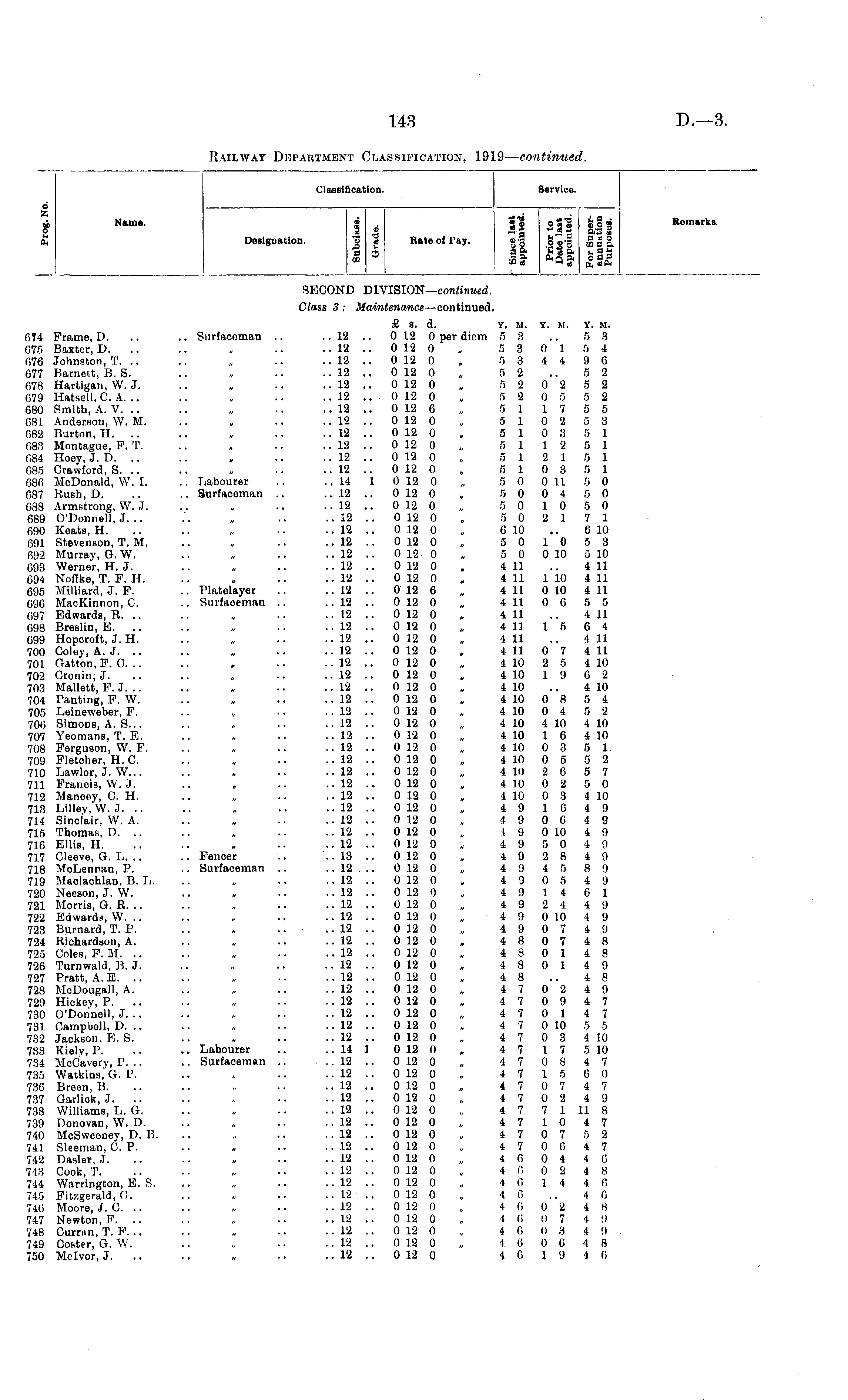 Classification. Service. 55 oi Name. o fc ft 6 A A o fc ft Name. Designatic Designation. a 4 Ij S M III on. J | Rate of Pay. «| .§.•§ Sag. CO -n? " l D a <>Sf? w 02 a w cd Li. BPh 1 4 2 2 i * Rate of Pay. Remarks SECOND DIVISION— continued. Class 3 : Maintenance —continued. 0T4 Frame, D. 675 Baxter, D. 676 Johnston, T. .. 677 Barnett, B. S. 678 Hartigan, W. J. 679 Hatsell.C A. .. 680 Smith, A. V. .. 081 Anderson, W. M. 682 Burton, H. .. 683 Montague, F. T. 684 Hoey, J. D. .. 685 Crawford, S. .. 686 McDonald, W. I. 087 Rush, D. 688 Armstrong, W. J. 689 O'Donnell, J. .. 690 Keats, H. 691 Stevenson, T. M. 692 Murray, G. W. 693 Werner, H. J. 694 Noffke, T. F. H. 695 Milliard, J. F. 696 MacKinnon, C. 697 Edwards, R. .. 698 Breslin, E. 699 Hoporoft, J. H. 700 Coley, A. J. .. 701 Gatton.F. C. .. 702 Cronin, J. 703 Mallett, F. J. .. 704 Panting, F. W. 705 Leineweber, F. 706 Simons, A. S... 707 Yeomans, T. E. 708 Ferguson, W. F. 709 Fletcher, H. 0. 710 Lawlor, J. W... 711 Francis, W. J. 712 Mancey, C. H. 713 Lilley, W. J. .. 714 Sinclair, W. A. 715 Thomas, D. .. 716 Ellis, H. 717 Cleeve, G. L. .. 718 McLenran, P. 719 Maolachlan, B. L. 720 Neeson, J. W. 721 Morris, G. R. .. 722 Edwards, W. .. 723 Burnard, T. P. 724 Richardson, A. 725 Coles, F. M. .. 726 Turnwald, B. J. 727 Pratt, A. E. 728 McDougall, A. 729 Hickey, P. 730 O'Donnell, J. .. 731 Campbell, D. .. 732 Jackson, E. S. 733 Kiely, P. 734 McCavery, P. .. 735 Watkins, G. P. 736 Breon, B. 737 Garliok, J. 738 Williams, L. G. 739 Donovan, W. D. 740 McSweeney, D. B. 741 Sleeman, C P. 742 Dasler, J. 743 Cook, T. 744 Warrington, E. S. 745 Fitzgerald, G. 740 Moore, J. C. .. 747 Newton, F. .. 748 Gurrsn, T. P. .. 749 Coster, G. W. 750 Mclvor, J. .. Surfacoman .. .. Labourer .. Surfaceman .. .. Platelayer .. Surfaceman .. .. Fencer .. Surfaceman .. .. Labourer .. Surfaceman .. £ S. d. Y. M. Y. M. Y. M. .. 12 .. 0 12 0 per diem 5 3 .. 5 3 .. 12 .. 0 12 0 „ 5 3 0 1 5 4 .. 12 .. 0 12 0 , 5 3 4 4 9 0 .. 12 .. 0 12 0 „ 5 2 .. 5 2 .. 12 .. 0 12 0 , 5 2 0 2 5 2 .. 12 .. 0 12 0 „ 5 2 0 5 5 2 .. 12 .. 0 12 0 „ 5 1 17 5 5 .. 12 .. 0 12 0 „ 5 1 0 2 5 3 .. 12 .. 0 12 0 „ 5 1 0 3 5 1 .. 12 .. 0 12 0 „ 5 1 12 5 1 .. 12 .. 0 12 0 „ 5 1 2 1 5 1 .. 12 .. 0 12 0 „ 5 1 0 3 5 1 ..14 1 0 12 0 „ 5 0 0 11 5 0 .. .12 .. 0 12 0 „ 5 0 0 4 5 0 .. 12 .. 0 12 0 „ 5 0 10 5 0 .. 12 .. 0 12 0 „ 5 0 2 1 7 1 .. 12 .. 0 12 0 „ 0 10 .. 6 10 .. 12 .. 0 12 0 „ 5 0 10 5 3 .. 12 .. 0 12 0 „ 5 0 0 10 5 10 .. 12 .. 0 12 0 , 4 11 .. 4 11 .. 12 .. 0 12 0 . 4 11 1 10 4 11 .. 12 .. 0 12 6 „ 4 1.1 0 10 4 11 .. 12 .. 0 12 0 „ 4 11 0 0 5 5 .. 12 .. 0 12 0 » 4 11 .. 4 11 .. 12 .. 0 12 0 „ 4 11 15 6 4 .. 12 .. 0 12 0 „ 4 11 .. 4 11 .. 12 .. 0 12 0 , 4 11 0 7 4 11 .. 12 .. 0 12 0 „ 4 10 2 5 4 10 .. 12 .. 0 12 0 , 4 10 19 0 2 .. 12 .. 0 12 0 » 4 10 .. 4 10 .. 12 .. 0 12 0 . 4 10 0 8 5 4 .. 12 .. 0 12 0 , 4 10 0 4 5 2 .. 12 .. 0 12 0 „ 4 10 4 10 4 10 .. 12 .. 0 12 0 „ 4 10 16 4 10 .. 12 .. 0 12 0 „ 4 10 0 3 5 1 .. 12 .. 0 12 0 „ 4 10 0 5 5 2 .. 12 .. 0 12 0 „ 4 10 2 0 5 7 .. 12 .. 0 12 0 „ 4 10 0 2 5 0 .. 12 .. 0 12 0 „ 4 10 0 3 4 10 .. 12 .. 0 12 0 „ 4 9 10 4 9 .. 12 .. 0 12 0 „ 4 9 0 0 4 9 .. 12 .. 0 12 0 „ 4 9 0 10 4 9 .. 12 .. 0 12 0 „ 4 9 5 0 4 9 '.. 13 .. 0 12 0 . 4 9 2 8 4 9 .. 12 . .. 0 12 0 „ 4 9 4 5 8 9 .. 12 .. 0 12 0 . 4 9 0 5 4 9 .. 12 .. 0 12 0 „ 4 9 14 6 1 .. 12 .. 0 12 0 „ 4 9 2 4 4 9 .. 12 .. 0 12 0 „ - 4 9 0 10 4 9 .. 12 .. 0 12 0 , 4 9 0 7 4 9 ..12.. 0 12 0 , 48 07 48 ..12.. 0 12 0 „ 48 01 48 .. 12 .. 0 12 0 „ 4 8 0 1 4 9 .. 12 .. 0 12 0 , 4 8 .. 4 8 .. 12 .. 0 12 0 „ 4 7 0 2 4 9 .. 12 .. 0 12 0 „ 4 7 0 9 4 7 .. 12 .. 0 12 0 „ 4 7 0 1 4 7 .. 12 .. 0 12 0 „ 4 7 0 10 5 5 .. 12 .. 0 12 0 „ 4 7 0 3 4 10 .. 14 1 0 12 0 „ 4 7 1 7 5 10 .. 12 .. 0 12 0 „ 4 7 0 8 4 7 .. 12 .. 0 12 0 „ 4 7 15 6 0 .. 12 .. 0 12 0 , 4 7 0 7 4 7 .. 12 .. 0 12 0 „ 4 7 0 2 4 9 .. 12 .. 0 12 0 „ 4 7 7 1 11 8 .. 12 .. 0 12 0 „ 4 7 10 4 7 .. 12 .. 0 12 0 » 4 7 0 7 5 2 .. 12 .. 0 12 0 „ 4 7 0 0 4 7 .. 12 .. 0 12 0 „ 4 6 0 4 4 6 .. 12 .. 0 12 0 „ 4 6 0 2 4 8 .. 12 .. 0 12 0 „ 1 (i 14 4 0 .. 1.2 .. 0 12 0 „ 4 6 .. 4 6 .. 12 .. 0 12 0 „ 4 0 0 2 4 8 .. 12 .. 0 12 0 „ 4 6 0 7 4 9 .. 12 .. 0 12 0 „ 4 0 0 8 4 9 .. 12 .. O 12 0 „ 4 0 0 0 4 8 .. 12 .. 0 12 0 4 6 19 4 6