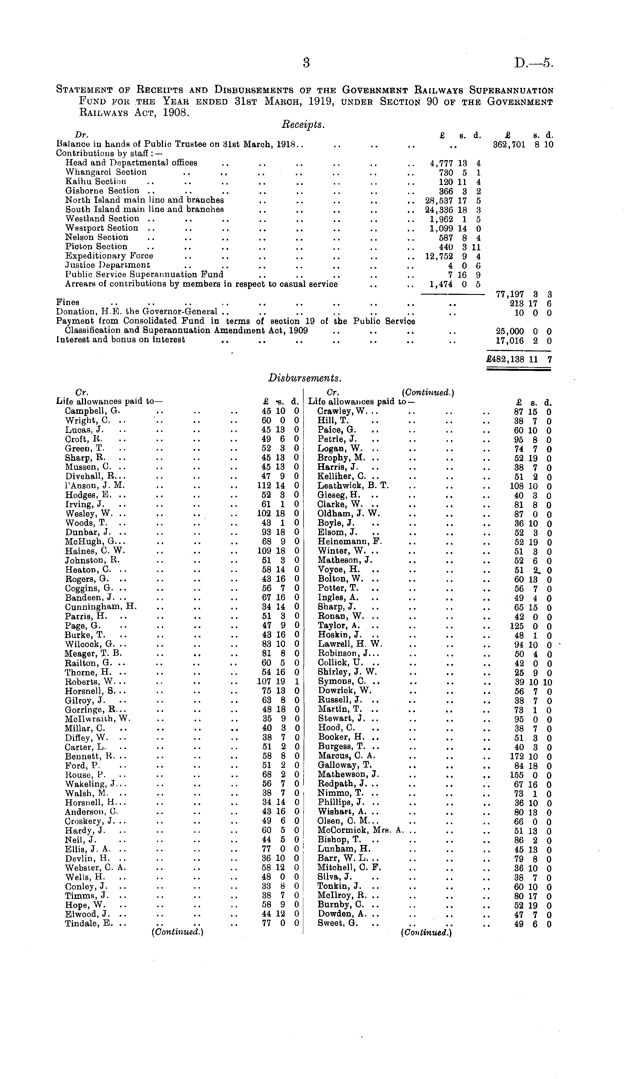Statement of Receipts and Disbursements of the Government Railways Superannuation Fund for the Year ended 31st March, 1919, under Section 90 of the Government Railways Act, 1908. Receipts. Dr. £ s. d. £ s. d. Balance in hands of Public Trustee on 31st Maroh, 1918.. .. .. .. .. 362,701 8 10 Contributions by staff :— Head and Departmental offioes .. .. .. .. .. .. 4,777 13 4 Whangaroi Seotion .. .. .... .. .. .. 730 5 1 Kaihu Section .. .. .. .. .. .. .. .. 120 11 4 Gisborne Section .. .. .. .. .. .. .. .. 366 3 2 North Island main lino and branohes .. .. .. .. .. 28,537 17 5 South Island main line and branohes .. .. .. .. .. 24,336 18 3 Westland Section .. .. .. .. .. .. .. 1,962 1 5 Westport Seotion .. .. .. .. .. .. .. .. 1,099 14 0 Nelson Section .. .. .. .. .. .. .. .. 587 8 4 Pioton Section .. .. .. .. .. .. .. .. 440 3 11 Expeditionaty Force .. .. .. .. .. .. .. 12,752 9 4 Justice Department .. .. .. .. .. .. .. 406 Public Service Superannuation Fund .. .. .. .. .. 7 16 9 Arrears of contributions by members in respect to casual servioo .. .. 1,474 0 5 77,197 3 3 Fines .. .. .. .. .. .. .. .. .. .. 213 17 6 Donation, H.E. the Governor-General .. .. .. .. .. .. .. 10 0 0 Payment from Consolidated Fund in terms of seotion 19 of the Publio Service Classification and Superannuation Amendment Aot, 1909 .. .. .. .. 25,000 0 0 Interest and bonus on interest .. .. .. .. .. .. .. 17,016 2 0 £482,138 11 7 Disbursements. Cr. Cr. (Continued.) Life allowances paid to— £ -s. d. Life allowances paid to— £ b. d. Campbell, G. .. .. .. 45 10 0 Crawley, W... .. .. .. 87 15 0 Wright, C. .. '.. .. .. 60 0 0 Hill, T. .. .. .. .. 38 7 0 Luoas, J. .. .. .. 45 13 0 Paice, G. .. .. .. .. 60 10 0 Croft, R. .. .. .. .. 49 6 0 Petrie, J. .. .. .. 95 8 0 Green, T. .. .. .. .. 52 3 0 Logan, W. .. .. .. .. 74 7 0 Sharp, R. .. .. .. .. 45 13 0 Brophy, M. .. .. .. .. 52 19 0 Mussen, C. .. .. .. .. 45 13 0 Harris, J. .. .. .. 38 7 0 Divehall, R... .. .. .. 47 9 0 Kelliher, C. .. .. .. .. 51 2 0 l'Anson, J. M. .. .. .. 112 14 0 Leathwick, B. T. .. .. .. 108 10 0 Hodges, E. .. .. .. .. 52 3 0 Gieseg, H. .. .. .. .. 40 3 0 Irving, J. .. .. .. 61 1 0 Clarke, W. .. .. .. .. 818 0 Wesley, W. .. .. .. .. 102 18 0 Oldham, J. W. .. .. .. 87 0 0 Woods, T. .. .. .. .. 43 1 0 Boyle, J. .. .. .. .. 36 10 0 Dunbar, J. .. .. .. .. 93 18 0 Elsom, J. .. .. .. .. 52 3 0 MoHugh, G... .. .. .. 68 9 0 Heinemann, F. .. .. .. 52 19 0 Haines, C. W. .. .. .. 109 18 0 Winter, W. .. .. .. .. 51 3 0 Johnston, R. .. .. .. 51 3 0 Matheson, J. .. .. .. 52 6 0 Heaton, C. .. .. .. .. 58 14 0 Voyoe, H. .. .. .. .. 51 2, 0 Rogers, G. .. .. .. .. 43 16 0 Bolton, W. .. .. .. .. 60 13 0 Coggins, G. .. .. .. .. 56 7 0 Potter, T. .. .. .. .. 56 7 0 Bandeen, J. .. .. .. .. 67 16 0 Ingles, A. .. .. .. .. 49 4 0 Cunningham, H. .. .. .. 34 14 0 Sharp, J. .. .. .. .. 65 15 0 Parris, H. .. .. .. .. 51 3 0 Ronan, W. .. .. .. .. 42 0 0 Page, G. .. .. .. .. 47 9 0 Taylor, A. .. .. .. .. 125 0 0 Burke, T. .. .. .. .. 43 16 0 Hoskin, J. .. .. .. .. 48 1 0 Wiloook, G. .. .. .. .. 83 10 0 Lawrell, H. W. .. .. .. 94 10 0 Meager, T. B. .. .. .. 81 8 0 Robinson, J... .. .. .. 50 4 0 Railton, G. .. .. .. .. 60 5 0 Colliek, U. .. .. .. .. 42 0 0 Thome, H. .. .. .. .. 54 16 0 Shirley, J. W. .. .. .. 25 9 0 Roberts, W... .. .. .. 107 19 1 Symons, C. .. .. .. .. 39 10 10 Horsnell, 8. .. .. .. .. 75 13 0 Dowrick, W. .. .. .. 56 7 0 Gilroy, J. .. .. .. .. 63 8 0 Russell, J. .. .. .. .. 38 7 0 Gorringe, R... .. .. .. 48 18 0 Martin, T. .. .. .. .. 73 1 0 Mollwraith, W. .. .. .. 36 9 0 Stewart, J. .. .. .. .. 95 0 0 Millar, C. .. .. .. .. 40 3 0 Hood, C. .. .. .. .. 38 7 0 Difioy, W. .. .. .. .. 38 7 0 Booker, H. .. .. .. .. 51 3 0 Carter, L. .. .. .. .. 51 2 0 Burgess, T. .. .. .. .. 40 3 0 Bennett, R... .. .. .. 58 8 0 Marous, C. A. .. .. .. 172 10 0 Ford, P. .. .. .. .. 51 2 0 Galloway, T. .. .. .. 84 18 0 Rouse, P. .. .. .. .. 68 2 0 Mathewson, J. .. .. .. 155 0 0 Wakeling, J... .. .. .. 56 7 0 Redpath, J. .. .. .. .. 67 16 0 Walsh, M. .. .. .. .. 38 7 0 j Nimmo, T. .. .. .. .. 73 1 0 Horsnell, H... .. .. .. 34 14 0 j Phillips, J. .. .. .. .. 36 10 0 Anderson, C. .. .. .. 43 16 0 i Wishart, A. .. .. .. .. 80 13 0 Croskery, J. .. .. .. .. 49 6 0 j Olsen, C. M... .. .. .. 66 0 0 Hardy, J. .. .. .. .. 60 5 0 j McCormick, Mrs. A. .. .. .. 51 13 0 Neil, J. .. .. .. .. 44 5 0 Bishop, T. .. .. .. .. 86 2 0 Ellis, J. A. .. .. .. .. 77 0 0 Lunham, H. .. .. .. 45 13 0 Devlin, H. .. .. .. .. 36 10 0 Barr, W. L. .. .. .. .. 79 8 0 Webster, C. A. .. .. .. 58 12 0 Mitohell, C. F. .. .. .. 86 10 0 Wells, H. .. .. .. .. 48 0 0 Silva, J. .. .. .. .. 38 7 0 Conley, J. .. .. .. .. 33 8 0 Tonkin, J. .. .. .. .. 60 10 0 Timms, J. .. .. .. .. 38 7 0 Mollroy, R. .. .. .. .. 80 17 0 Hope, W. .. .. .. .. 58 9 0 Burnby, C. .. .. .. .. 52 19 0 Elwood, J. .. .. .. .. 44 12 0 Dowden, A. .. .. .. .. 47 7 0 Tindale, E. .. .. .. .. 77 0 0 Sweet, G. .. .. .. .. 49 6 0 (Continued.) (Continued.)