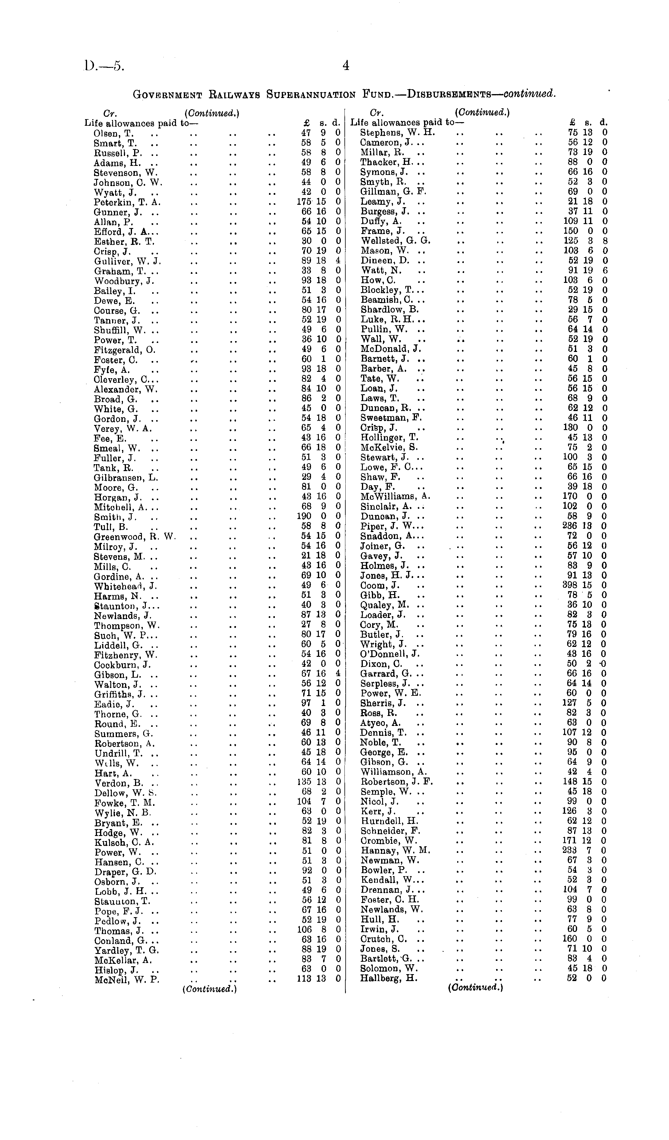 Government Railways Superannuation I^und.—-Disbursements — continued. Cr. (Continued.) Cr. (Continued.) Life allowances paid to — £ s. d. Life allowances paid to— £ s. d. Olsen, T. .. .. .. .. 47 9 0 Stephens, W. H. .. .. .. 75 13 0 Smart, T. .. .. .. .. 58 5 0 Cameron, J... .. .. .. 56 12 0 Russell, P. .. .. .. .. 58 8 0 Millar, R. .. .. .. .. 73 19 0 Adams, H. .. .. .. .. 49 6 0 Thacker, H. .. .. .. .. 88 0 0 Stevenson, W. .. .. .. 58 8 0 Symons, J. .. .. .. .. 66 16 0 Johnson, C. W. .. .. .. 44 0 0 Smyth, R. .. .. .. .. 52 3 0 Wyatt, J. .. .. .. .. 42 0 0 Gillman, G. F. .. .. .. 69 0 0 Peterkin, T. A. .. .. .. 175 15 0 Leamy, J. .. .. .. .. 21 18 0 Gunner, J. .. .. .. .. 66 16 0 Burgess, J. .. .. .. .. 37 11 0 Allan, P. .. .. .. 54 10 0 Duffy, A. .. .. .. .. 109 11 0 Efiord, J. A... .. .. .. 65 15 0 Frame, J. .. .. .. .. 150 0 0 Esther, R. T. .. .. .. 30 0 0 Wellsted, G. G. .. .. .. 125 3 8 Crisp, J. .. .. .. .. 70 19 0 Mason, W. .. .. .. .. 103 6 0 Gulliver, W. J. .. .. .. 89 18 4 Dineen, D. .. .. .. .. 52 19 0 Graham, T... .. .. .. 33 8 0 Watt, N. .. .. .. .. 91 19 6 Woodbury, J. .. .. .. 93 18 0 How, C. .. .. .. .. 103 6 0 Bailey, I. .. .. .. .. 51 3 0 Blockley, T. .. .. .. .. 52 19 0 Dewe, E. .. .. .. .. 54 16 0 Beamish, C... .. .. .. 78 5 0 Course, G. .. .. .. .. 80 17 0 Shardlow, B. .. .. .. 29 15 0 Tanner, J. .. .. .. .. 52 19 0 Luke, R.H. .. .. .. .. 56 7 0 Shuffill, W. .. .. .. .. 49 6 0 Pullin, W. .. .. .. .. 64 14 0 Power, T. .. .. .. .. 36 10 0 Wall, W. .. .. .. .. 52 19 0 Fitzgerald, O. .. .. .. 49 6 0 McDonald, J. .. .. .. 51 3 0 Foster, C. .. ~ .. .. 60 1 0 Barnett, J. .. .. .. .. 60 1 0 Fyfe, A. .. .. .. .. 93 18 0 Barber, A. .. .. .. .. 45 8 0 Oleverley, C... .. .. .. 82 4 0 Tate, W. .. .. .. .. 56 15 0 Alexander, W. .. .. .. 84 10 0 Loan, J. .. .. .. .. 56 15 0 Broad, G. .. .. .. .. 86 2 0 Laws, T. .. .. .. .. 68 9 0 White, G. .. .. .. .. 45 0 0 Dunoan, R. .. .. .. .. 62 12 0 Gordon, J. .. .. .. .. 54 18 0 : Sweetman, F. .. .. .. 46 11 0 Verey, W. A. .. .. .. 65 4 0 Crisp, J. .. .. .. .. 130 0 0 Fee, E. .. .. .. .. 43 16 0 ' Hollinger, T. .. .. .. 45 13 0 Smeal, W. .. .. .. .. 66 18 0 ' MoKelvie, S. .. ..' .. 75 2 0 Fuller, J. .. .. .. .. 51 3 0 Stewart, J. .. .. .. .. 100 3 0 Tank, R. .. .. .. .. 49 6 0 Lowe, F. C... .. .. .. 65 15 0 Gilbransen, L. .. .. .. 29 4 0 Shaw, F. .. • • • • 66 16 0 Moore, G. .. .. .. .. 81 0 0 Day, F. .. .. . • •. 39 18 0 Horgan, J. .. .. .. .. 43 10 0 McWilliams, A. .. .. .. 170 0 0 Mitchell, A. .. .. .. .. 68 9 0 Sinolair, A. .. .. .. .. 102 0 0 Smith, J. .. .. .. .. 190 0 0 Duncan, J. .. .. .. .. 58 9 0 Tull, B. .. .. .. .. 58 8 0 Piper, J. W... .. .. .. 236 13 0 Greenwood, R. W. .. .. .. 54 15 0 Snaddon, A... .. .. .. 72 0 0 Milroy, J. .. .. .. .. 54 16 0 Joiner, G. .. ... .. .. 56 12 0 Stevens, M... .. .. .. 21 18 0 Gavey, J. .. ■• •• •• 57 10 0 Mills, C. .. .. • • • • 43 16 0 Holmes, J. .. .. .. .. 83 9 0 Gordine, A. .. .. .. .. 69 10 0 Jones, H. J. .. .. .. .. 91 13 0 Whitehead, J. .. .. .. 49 6 0 Coom, J. .. .. .. .. 398 15 0 Harms, N 51 3 0 Gibb, H. .. .. .. .. 78 5 0 Staunton, J .. .. 40 3 0 Qualey, M. .. .. .. .. 36 10 0 Newlands, J. .. .. .. 87 13 0 Loader, J. .. .. .. .. 82 3 0 Thompson, W. .. .. .. 27 8 0 Cory, M. .. .. .. .. 75 13 0 Such, W. P... .. •• •• 80 17 0 Butler, J. .. .. •• .. 79 16 0 Liddell, G. .. .. .. .. 60 5 0 Wright, J. .. .. .. .. 62 12 0 Fitzhenry, W. .. .. .. 54 16 0 O'Donnell, J. .. .. .. 43 16 0 Cookburn, J. .. .. .. 42 0 0 Dixon, 0. .. .. .. .. 50 2 0 Gibson, L. .. .. .. .. 67 16 4 Garrard, G. .. .. .. .. 66 16 0 Walton, J. .. .. .. .. 56 12 0 Serpless, J. .. .. ■ • • • 64 14 0 Griffiths, J. .. .. .. .. 71 15 0 Power, W. E. .. .. .. 60 0 0 Sadie, J. .. .. .. .. 97 1 0 Sherris, J. .. .. .. .. 127 5 0 Thome, G. .. .. .. .. 40 3 0 Ross, R. .. .. •• .. 82 3 0 Round, E. .. .. .. .'. 69 8 0 Atyeo, A. .. .. .. .. 63 0 0 Summers, G. .. .. .. 46 11 0 Dennis, T. .. .. .. .. 107 12 0 Robertson, A. .. .. .. 60 13 0 Noble, T 90 8 0 Undrill, T. .. .. .. .. 45 18 0 George, E. .. .. .. .. 95 0 0 Wills, W. .. .. .. .. 64 14 0 Gibson, G. .. .. .. .. 64 9 0 Hart, A. .. .. .. .. 60 10 0 Williamson, A. .. .. .. 42 4 0 Verdon, B. .. .. .. .. 135 13 0 Robertson, J. F. .. .. .. 148 15 0 Dellow, W. iS. .. .. .. 68 2 0 Semple, W. .. .. .. .. 45 18 0 Fowke, T. M. .. .. .. 104 7 0 Nicol, J 99 0 0 Wylie N. B. .. .. .. 63 0 0 Kerr, J. .. .. .. .. 126 3 0 Bryant E. .. .. .. .. 52 19 0 Hurndell, H. .. .. .. 62 12 0 Hodge W. .. •• ■• .. 82 3 0 Schneider, F. .. .. .. 87 13 0 Kulsoh, C. A. .. .. .. 81 8 0 Orombie, W. .. .. .. 171 12 0 Power W. .. .. .. .. 51 0 0 Hannay, W. M. .. .. .. 233 7 0 Hansen, C. .. •. ■■ • • 51 3 0 Newman, W. .. .. .. 67 3 0 Draper, G. D. .. .. .. 92 0 0 Bowler, P. .. .. .. .. 54 3 0 Osborn, J. .. •• •• •• 51 3 0 Kendall, W... .. .. .. 52 3 0 Lobb J H. .. .. .. .. 49 6 0 Drennan, J. .. .. .. .. 104 7 0 Staunton, T. .. .. .. 56 12 0 Foster, C. H. .. .. .. 99 0 0 Pope F. J. .. .. • • .. 67 16 0 Newlands, W. .. .. .. 63 8 0 Pedlow, J. .. •■ ■• •• 52 19 0 Hull, H. .. .. .. .. 77 9 0 Thomas, J. .. .. . • .. 106 8 0 Irwin, J. .. .. .. 60 5 0 Oonland, G 63 16 0 Crutch, C 160 0 0 Yardley, T. G. .. .. .. 88 19 0 Jones, S. .. ... .. .. 71 10 0 MoKellar, A. .. .. .. 83 7 0 Bartlett.G. .. .. .. .. 83 4 0 Hislop, J. .. •• •• •• 63 0 0 Solomon, W. .. .. .. 45 18 0 McNeil, W. P. .. .. •. 113 13 0 Hallberg, H. .. .. .. 52 0 0 (Continued.) (Continued.)