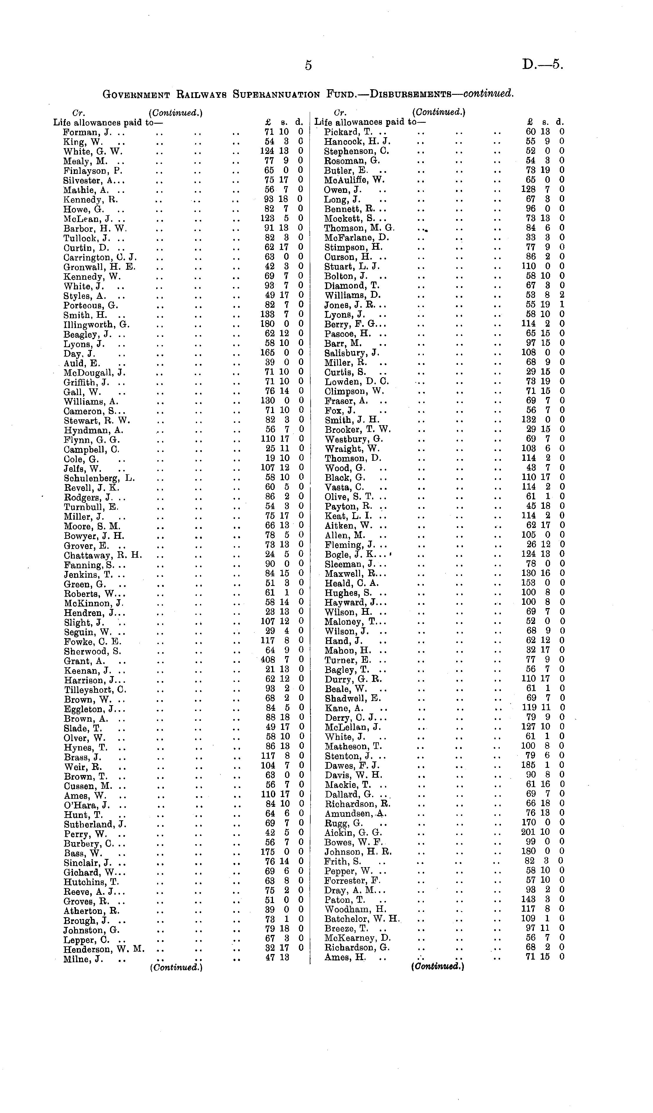 Government Railways Superannuation Fund.—Disbursements — continued. Cr. (Continued.) Cr. (Continued.) Life allowances paid to— £ s. d. Life allowances paid to — £ s. d. Forman, J. .. .. .. .. 71 10 0 Pickard, T. .. .. .. .. 60 13 0 King, W. .. .. .. .. 54 3 0 Hanoook, H. J. .. .. .. 55 9 0 White, G. W. .. .. .. 124 13 0 Stephenson, C. .. .. .. 52 0 0 Mealy, M. .. .. .. .. 77 9 0 Rosoman, G. .. .. .. 54 3 0 Finlayson, P. .. .. .. 65 0 0 Butler, E. .. .. .. .. 73 19 0 Silvester, A... .. .. .. 75 17 0 MoAuliffe, W. .. .. .. 65 0 0 Mathie, A. .. .. .. .. 56 7 0 Owen, J. .. . • .. 128 7 0 Kennedy,!.. .. .. .. 93 18 0 Long, J. .. .. •• .. 67 3 0 Howe, G. .. .. .. .. 82 7 0 Bennett, R. .. .. .. .. 96 0 0 McLean, J. .. .. .. .. 123 5 0 Mookett, 8. .. .. .. .. 73 13 0 Barbor, H. W. .. .. .. 91 13 0 Thomson, M, G .. 84 6 0 Tullook, J. .. .. .. .. 82 3 0 MoFarlane, D. .. .. .. 33 3 0 Curtin, D. .. .. .. .. 62 17 0 Stimpson, H. .. .. .. 77 9 0 Carrington, 0. J. .. .. .. 63 0 0 Curson, H. .. .. .. .. 86 2 0 Gronwall, H. E. .. .. .. 42 3 0 Stuart, Ij. J. .. .. .. 110 0 0 Kennedy, W. .. .. .. 69 7 0 Bolton, J. .. .. .. .. 58 10 0 White, J. .. .. .. .. 93 7 0 Diamond, T. .. .. .. 67 3 0 Styles, A. .. .. .. .. 49 17 0 Williams, D. .. .. .. 53 8 2 Porteous, G. .. .. .. 82 7 0 Jones, J. R. .. .. .. .. 55 19 1 Smith, H. .. .. .. .. 133 7 0 Lyons, J. .. .. .. .. 58 10 0 Illingworth, G. .. .. .. 180 0 0 Berry, F. G... .. .. .. 114 2 0 Beagley, J. -. .. • • • • 62 12 0 Pasooe, H. .. .. .. .. 65 15 0 Lyons, J. .. .. .. .. 58 10 0 Barr, M. .. .. .. .. 97 15 0 Day, J. .. .. .. • • 165 0 0 Salisbury, J. .. .. .. 108 0 0 Auld, E. .. .. .. .. 39 0 0 Miller, R. .. .. .. .. 68 9 0 MoDougall, J. .. .. .. 71 10 0 Curtis, S. .. .. .. .. 29 15 0 Griffith, J. .. .. .. .. 71 10 0 Lowden, D. C. .. .. .. 73 19 0 Gall, W. .. .. .. ■• 76 14 0 Climpson, W. .. .. .. 71 15 0 Williams, A. .. .. .. 130 0 0 Fraser, A. .. .. .. .. 69 7 0 Cameron, 5... .. .. .. 71 10 0 Fox, J. .. .. .. ■• 56 7 0 Stewart, R. W. .. .. .. 82 3 0 Smith, J. H. .. .. .. 132 0 0 Hyndman, A. ... .. .. 56 7 0 Brooker, T. W. .. .. .. 29 15 0 Flynn, G. G. .. .. .. 110 17 0 Westbury, G. .. .. .. 69 7 0 Campbell, C. .. .. .. 25 11 0 Wraight, W. .. .. .. 103 6 0 Cole, G. .. . ■ ■ • • • 19 10 0 Thomson, D. .. .. .. 114 2 0 Jelfs, W. .. .. .. • • 107 12 0 Wood, G. .. .. .. .. 43 7 0 Sohulenberg, L. .. .. .. 58 10 0 Black, G. .. .. .. .. 110 17 0 Revell.J. K. .. .. .. 60 5 0 Vasta, C. .. .. .. .. 114 2 0 Rodgers, J. .. .. .. • • 86 2 0 Olive, S. T. .. .. .. .. 61 1 0 Turnbull, E. .. .. .. 54 3 0 Payton, R. .. .. .. .. 45 18 0 Miller, J. .. .. .. .. 75 17 0 Keat, L. I. .. .. .. .. 114 2 0 Moore, S. M. .. .. .. 66 13 0 Aitken, W. .. .. .. .. 62 17 0 Bowyer, J. H. .. .. .. 78 5 0 Allen, M. .. .. .. .. 105 0 0 Grover, E. .. .. .. ■ • 73 13 0 Fleming, J. .. .. .. .. 26 12 0 Chattaway, R. H. .. .. .. 24 5 0 Bogle, J. X... - .. .. .. 124 13 0 Fanning, 5... .. •• •• 90 0 0 Sleeman, J. .. .. .. .. 78 0 0 Jenkins, T... .. .. .. 84 15 0 Maxwell, R... .. .. .. 130 16 0 Green, G .. • • 51 3 0 Heald, C. A. .. .. .. 153 0 0 Roberts, W... .. .. •• 61 1 0 Hughes, S. .. .. .. .. 100 8 0 MoKinnon, J. .. .. •• 58 14 0 Hay ward, J... .. .. .. 100 8 0 Hendren, J... .. .. •• 23 13 0 Wilson, H. .. .. .. .. 69 7 0 Slight, J. '.. .. .. •• 107 12 0 Maloney, T... .. .. .. 52 0 0 Sequin, W. .. .. .. .. 29 4 0 Wilson, J. .. .. .. .. 68 9 0 Fowke, C. E. .. .. .. 117 8 0 Hand, J. .. .. .. .. 62 12 0 Sherwood, S. .. .. .. 64 9 0 Mahon, H. .. .. .. .. 32 17 0 Grant, A. .. .. .. •. 408 7 0 Turner, E. .. .. .. .. 77 9 0 Keenan, J 21 13 0 Bagley, T 56 7 0 Harrison, J... .. .. •• 62 12 0 Durry, G. R. .. .. .. 110 17 0 Tilleyshort, C. .. .. ■ • 93 2 0 Beale, W. .. .. .. .. 61 1 0 Brown, W. .. .. •• •• 68 2 0 Shadwell, E. .. .. .. 69 7 0 Eggleton, J... .. •■ •• 84 5 0 Kane, A. .. .. .. .. 119 11 0 Brown, A. .. .. .. • • 88 18 0 Derry, C. J. .. .. .. .. 79 9 0 Slade, T. .. .. .. .. 49 17 0 McLellan, J. ... .. .. 127 10 0 Olver, W. .. .. • • • • 58 10 0 White, J. .. .. .. .. 61 1 0 Hynes, T. .. .. .. ' .. 86 13 0 Matheson, T. .. .. .. 100 8 0 Brass, J. .. .. .. 117 8 0 Stenton, J. .. .. .. .. 79 6 0 Weir, R. .. .. .. • • 104 7 0 Dawes, F. J. .. .. .. 185 1 0 Brown, T. .. .. .. .. 63 0 0 Davis, W. H. .. .. .. 90 8 0 Cussen, M. .. .. .. .. 56 7 0 Maokie, T. .. .. .. .. 61 16 0 Ames, W. .. .. .. • • 110 17 0 Dallard, G. .. .. .. .. 69 7 0 O'Hara, J. .. .. .. .. 84 10 0 Richardson, R. .. .. .. 66 18 0 Hunt, T. .. .. .. •• 64 6 0 Amundsen, A. .. .. .. 76 13 0 Sutherland, J. .. .. .. 69 7 0 Rugg, G. .. .. .. .. 170 0 0 Perry W. .. • • • • • • 42 5 0 Aickin, G. G. .. .. .. 201 10 0 Burbery, C. .. ■ • • ■ • • 56 7 0 Bowes, W. F. .. .. .. 99 0 0 Bass, W. .. .. •• ■• 175 0 0 Johnson, H. R. .. .. .. 180 0 0 Sinclair.J 76 14 0 Frith, S 82 3 0 Giohard, W... .. .. •• 69 6 0 j Pepper, W. .. .. .. .. 58 10 0 Hutehins, T. .. .. .. 63 8 0 Forrester, F. .. .. .. 57 10 0 Reeve, A. J 75 2 0 Dray, A. M 93 2 0 Groves, R. .. .. • ■ • • 51 0 0 Paton, T. .. .. .. .. 143 3 0 Atherton, R. .. .. .. 39 0 0 Woodham, H. .. .. .. 117 8 0 Brough J .. .. • • • • 73 1 0 Batchelor, W. H. .. .. .. 109 1 0 Johnston, G. .. .. .. 79 18 0 Breeze, T. .. 97 11 0 Lepper, C. .. . • ■ • • • 67 3 0 McKearney, D. .. .. .. 56 7 0 Henderson, W. M. .. .. .. 32 17 0 ! Richardson, G. .. .. .. 68 2 0 Milne, J. .. •■ •• •• 47 13 Ames, H. .. .'. .. .. 71 15 0 (Continued.) (Continued.)