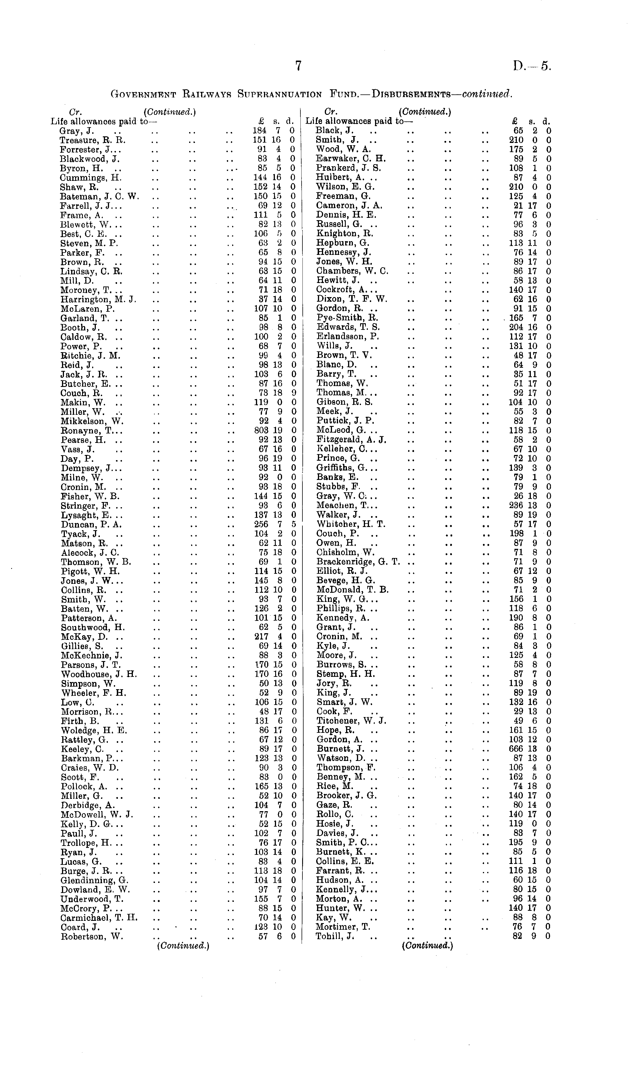 Government Railways Superannuation Fund. —Disbursements — continued. Gr. (Continued.) Gr. (Continued.) Life allowances paid to - £ s. d. Life allowances paid to— £ s. d. Gray, J. .. .. .. .. 184 7 0 Black, J. .. .. .. .. 65 2 0 Treasure, R. R. .. .. .. 151 16 0 Smith, J. .. .. .. .. 210 0 0 Forrester, J... .. .. .. 91 4 0 Wood, W. A. .. .. .. 175 2 0 Blackwood, J. .. .. .. 83 4 0 Earwaker, C. H. .. .. .. 89 5 0 Byron, H. .. .. .. ... 85 5 0 Prankerd, J. S. .. .. .. 108 1 0 Cummings, H. .. .. .. 144 16 0 Hulbert, A. .. .. .. .. 87 4 0 Shaw, R. .. .. .. .. 152 14 0 Wilson, E. G. .. .. .. 210 0 0 Bateman, J. C. W. .. .. .. 150 15 0 Freeman, G. .. .. .. 125 4 0 Farrell, J. J... .. .. .. 69 12 0 Cameron, J. A. .. .. .. 21 17 0 Frame, A. .. .. .. .. 11l 5 0 Dennis, H. E. .. .. .. 77 6 0 Blewett, W. .. .. .. .. 82 13 0 Russell, G. .. .. .. .. 96 3 0 Best, C. E. .. .. .. .. 106 5 0 Knighton, R. .. .. .. 83 5 0 Steven,M. P. .. .. .. 63 2 0 Hepburn,G. .. .. .. 113 11 0 Parker, F. .. .. .. .. 65 8 0 Hennessy, J. .. .. .. 76 14 0 Brown, R. .. .. .. .. 94 15 0 Jones, W. H. .. .. .. 89 17 0 Lindsay, C. R. .. .. .. 63 15 0 Chambers, W, C. .. .. .. 86 17 0 Mill, D. .. .. .. .. 64 11 0 Hewitt, J. .. .. .. .. 58 13 0 Moroney, T. .. .. .. .. 71 18 0 Cockroft, A. .. .. .. 140 17 0 Harrington, M. J. .. .. .. 37 14 0 Dixon, T. F. W. .. .. .. 62 16 0 MoLaren, P. .. .. .. 107 10 0 Gordon, R. .. .. .. .. 91 15 0 Garland, T. .. .. .. .. 85 1 0 Pye-Smith, R. .. .. .. 165 7 0 Booth, J. .. .. ~ 98 8 0 Edwards, T. S. .. .. .. 204 16 0 Caldow, R. .. .. .. .. 100 2 0 Erlandsson, P. .. .. .. 112 17 0 Power, P. .. .. .. .. 68 7 0 Wills, J. .. .. .. .. 131 10 0 Ritchie, J. M. .. .. .. 99 4 0 Brown, T. V. .. .. .. 48 17 0 Reid, J. .. .. .. .. 98 13 0 Blano, D. .. .. .. .. 64 9 0 Jaok, J. R. .. .. .. .. 103 6 0 Barry, T. .. .. .. .. 35 11 0 Butcher, E. .. .. .. .. 87 16 0 Thomas, W. .. .. .. 51 17 0 Couoh, R. .. .. .. .. 73 18 9 Thomas, M. .. .. .. .. 92 17 0 Makin, W. .. .. .. .. 119 0 0 Gibson, R. S. .. .. .. 104 10 0 Miller, W. .-. .. .. .. 77 9 0 Meek, J. .. .. .. 55 3 0 Mikkelson, W. .. .. .. 92 4 0 Puttick, J. P. .. .. .. 82 7 0 Ronayne, T... .. .. .. 803 19 0 McLeod, G. .. .. .. .. 118 15 0 Pearse, H. .. .. .. .. 92 13 0 Fitzgerald, A.J. .. .. .. 58 2 0 Vass, J. .. .. .. .. 67 16 0 Kelleher, O. .. .. .. .. 67 10 0 Day, P. .. .. .. .. 96 19 0 Prince, G. .. .. .. .. 72 10 0 Dempsey, J... .. .. .. 93 11 0 Griffiths, G. .. .. .. .. 139 3 0 Milne, W. .. .. .. .. 92 0 0 Banks, E. .. .. .. .. 79 1 0 Cronin, M. .. .. .. .. 93 18 0 Stubbs, F. .. 79 9 0 Fisher, W. B. .. .. .. 144 15 0 Gray, W. C. .. .. .. .. 26 18 0 Stringer, F. .. .. .. .. 93 6 0 Moachen, T... .. .. .. 236 13 0 Lysaght, E. .. .. .. .. 137 13 0 Walker, J. .. .. .. .. 89 19 0 Duncan, P. A. .. .. .. 256 7 5 Whitoher, H. T. .. .. .. 57 17 0 Tyack, J. .. .. .. .. 104 2 0 Couoh, P. .. .. .. .. 198 1 0 Matson.R. .. .. .. .. 62 11 0 Owen, H. .. .. .. .. 87 9 0 Aleoock, J. C. .. .. .. 75 18 0 Chisholm, W. .. .. .. 71 8 0 Thomson, W. B. .. .. .. 69 1 0 Brackenridge, G. T. .. .. .. 71 9 0 Pigott, W. H. .. .. .. 114 15 0 Elliot, R. J. .. .. .. 67 12 0 Jones, J. W... .. .. .. 145 8 0 Bevege, H. G. .. .. .. 85 9 0 Collins, R. .. .. .. .. 112 10 0 MoDonald, T. B. .. .. .. 71 2 0 Smith, W. .. .. .. .. 93 7 0 King, W. G. .. .. .. .. 156 1 0 Batten, W. .. .. .. .. 126 2 0 Phillips, R. .. .. .. .. 118 6 0 Patterson, A. .. .. .. 10115 0 Konnody, A. .. .. .. 190 8 0 Southwood, H. .. .. .. 62 5 0 Grant, J. .. .. .. .. 86 1 0 McKay, D. .. .. .. .. 217 4 0 Cronin, M. .. .. .. .. 69 1 0 Gillies, S. .. .. .. .. 69 14 0 Kyle, J. .. .. .. .. 84 3 0 MoKechnie, J. .. .. .. 88 3 0 Moore, J. .. .. .. .. 125 4 0 Parsons, J. T. .. .. .. 170 15 0 Burrows, S. .. .. .. .. 58 8 0 Woodhouse, J. H. .. .. .. 170 16 0 Stemp, H. H. .. .. .. 87 7 0 Simpson, W. .. .. .. 50 13 0 Jory, R. .. .. .. .. 119 8 0 Wheeler, F. H. .. .. .. 52 9 0 King, J. .. .. .. .. 89 19 0 Low, C. .. .. .. .. 106 15 0 Smart, J. W. .. .. .. 132 16 0 Morrison, R... .. .. .. 48 17 0 Cook, F. .. .. .. .. 29 13 0 Firth, B. .. .. .. .. 131 6 0 Titohoner, W. J. .. .. .. 49 6 0 Woledge, H. E. .. .. .. 86 17 0 Hope, R. .. .. .. .. 161 15 0 Rattley, G. .. .. .. .. 67 12 0 Gordon, A. .. .. .. .. 103 12 0 Keeley, C. .. .. .. .. 89 17 0 Burnett, J. .. .. .. .. 666 13 0 Barkman, P... .. .. .. 123 13 0 Watson, D. .. .. .. .. 87 13 0 Craies, W. D. .. .. .. 90 3 0 Thompson, F. .. .. .. 106 4 0 Scott, F. .. .. .. .. 83 0 0 Benney, M. .. .. .. .. 162 5 0 Pollock, A. .. .. .. .. 165 13 0 Rice, M. .. .. .. .. 74 18 0 Miller, G. .. .. .. .. 52 10 0 Brooker, J. G. .. .. .. 140 17 0 Derbidge, A. .. .. .. 104 7 0 Gaze, R. .. .. .. .. 80 14 0 McDowell, W.J. .. .. .. 77 0 0 Rollo, C. .. .. .. .. 140 17 0 Kelly, D. G. .. .. .. .. 52 15 0 Hosie, J. .. .. .. .. 119 0 0 Paull, J. .. .. .. .. 102 7 0 Davies, J. .. .. .. .. 83 7 0 Trollope, H. .. .. .. .. 76 17 0 Smith, P. C... .. .. .. 195 9 0 Ryan, J. .. .. .. .. 103 14 0 Burnett, X... .. .. .. 85 5 0 Lucas, G. .. .. .. .. 83 4 0 Collins, E. E. .. .. .. 11l 1 0 Burge, J. R. .. .. .. .. 113 18 0 Farrant, R. .. .. .. .. 116 18 0 Glendinning, G. .. .. .. 104 14 0 Hudson, A. .. .. .. .. 00 15 0 Dowland, E. W. .. .. .. 97 7 0 Kennelly, J... .. .. .. 80 15 0 Underwood, T. .. .. .. 155 7 0 Morton, A. .. .. .. .. 96 14 0 McCrory, P. .. .. .. .. 88 15 0 Hunter, W. .. .. .. 140 17 0 Carmichael, T. H. .. .. .. 70 14 0 Kay, W. .. .. .. .. 88 8 0 Coard, J. .. • .. .. 123 10 0 Mortimer, T. .. .. .. 76 7 0 Robertson, W. .. .. .. 57 6 0 Tohill, J. .. .. .. 82 9 0 (Continued.) (Continued.)