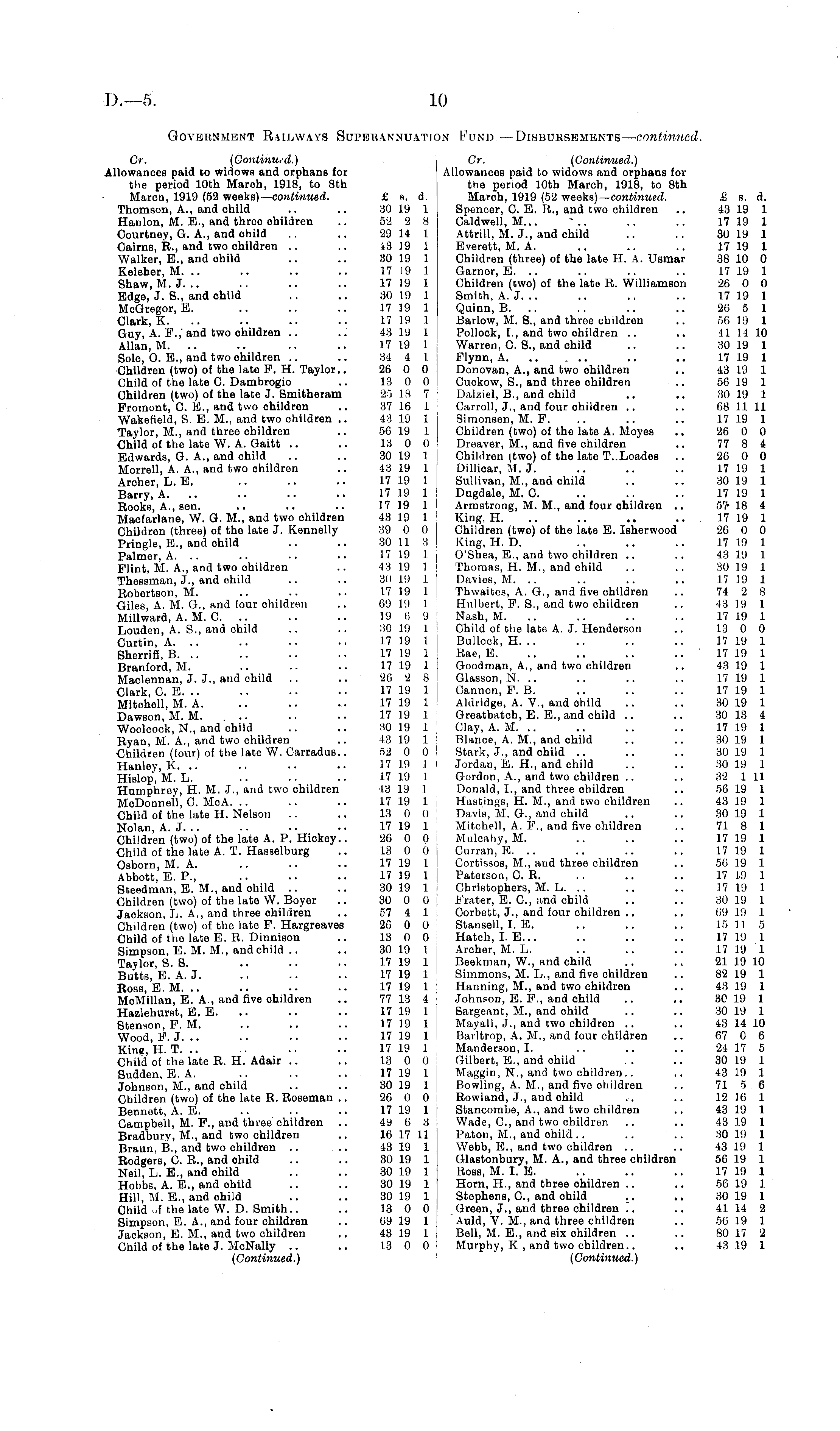 Government Railways Superannuation Fund—Disbursements— continued. Cr. (Continued.) Cr. (Continued.) Allowances paid to widows and orphans for Allowances paid to widows and orphans for the period 10th Maroh, 1918, to Bth the period 10th March, 1918, to Bth Maroo, 1919 (52 weeks) — continued. £ s. d. March, 1919 (52 weoks)— continued. £ s. d. Thomson, A., and ohild .. .. 30 19 1 Spencer, C. E. R., and two children .. 43 19 1 Hanlon, M. E., and three ohildren .. 52 2 8 Caldwell, M... ~.. .. .. 17 19 1 Courtney, G. A., and ohild .. .. 29 14 1 Attrill, M. J., and child .. .. 30 19 1 Cairns, R., and two ohildren .. .. i 3 19 1 Everett, M. A. .. .. .. 17 19 1 Walker, E., and ohild .. .. 30 19 1 Children (three) of the late H. A. Usmar 38 10 0 Keleher, M. .. .. .. .. 17 19 1 Garnor, E. .. .. .. .. 17 19 1 Shaw, M.J. .. .. .. .. 17 19 1 Children (two) of the late R. Williamson 26 0 0 Edge, J. S., and ohild .. .. 30 19 1 Smith, A. J... .. .. .. 17 19 1 McGregor, E. .. .. .. 17 19 1 Quinn, B. .. .. .. .. 26 5 1 Clark, K. .. .. .. .. 17 19 1 Barlow, M. 8., and three children .. 56 19 1 Guy, A. P.,' and two ohildren .. ..' 43 19 1 Pollook, 1., and two ohildren .. .. 41 14 10 Allan, M. .. .. .. .. 17 19 1 Warren, C. S., and ohild .. .. 30 19 1 Sole, O. E., and two ohildren .. .. 34 4 1 Flynn, A .. .. 17 19 1 Children (two) of the late P. H. Taylor.. 26 0 0 Donovan, A., and two ohildren .. 43 19 1 Child of the late C. Dambrogio .. 13 0 0 Cuckow, S., and three ohildren .. 56 19 1 Children (two) of the late J. Smitheram 25 18 7 Dalziel, 8., and child .. .. 30 19 1 Fromont, C. E., and two ohildren .. 37 16 1 ' Carroll, J., and four ohildren .. .. 68 11 11 Wakefield, S. E. M., and two children .. 43 19 1 Simonsen, M. P. .. .. .. 17 19 1 Taylor, M., and three ohildren .. 56 19 1 Children (two) of the late A. Moyes .. 26 0 0 Child of the late W. A. Gaitt .. .. 13 0 0 Dreaver, M., and five children .. 77 8 4 Edwards, G. A., and ohild .. .. 30 19 1 Children (two) of the late T..Loades .. 26 0 0 Morrell, A. A., and two ohildren .. 43 19 1 Dillicar, M. J. .. .. .. 17 19 1 Archer, L. E. .. .. .. 17 19 1 Sullivan, M., and ohild .. .. 30 19 1 Barry, A. .. .. .. •• 17 19 1 Dugdale, M. O. .. .. .. 17 19 1 Rooks, A., sen. .. .. .. 17 19 1 Armstrong, M. M, and four ohildren .. 57-18 4 Maofarlane, W. G. M., and two ohildren 43 19 1 King, H. .. .. .. .. 17 19 1 Ohildren (three) of the late J. Kennelly 39 0 0 Children (two) of the late E. Isherwood 26 0 0 Pringle, E., and ohild .. .. 30 11 3 King, H. D. .. .. .. 17 19 1 Palmer, A. .. .. .. .. 17 19 1 O'Shea, E., and two children .. .. 43 19 1 Flint, M. A., and two ohildren .. 43 19 1 Thomas, H. M., and child .. .. 30 19 1 Thessman, J., and child .. .. 30 19 1. Davies, M. .. .. .. .. 17 19 1 Robertson, M. .. .. .. 17 19 1 Thwaites, A. G., and five children .. 74 2 8 Giles, A. M. G., and (our children .. 69 19 1 Hulbert, P. S., and two children .. 43 19 1 Millward, A. M. C. .. .. .. 19 6 9 Nash, M. .. .. .. .. 17 19 1 Louden, A. S., and ohild .. .. 30 19 1 Child of the late A. J. Henderson .. 13 0 0 Curtin, A. .. .. .. •• 17 19 1 Bullock, H... .. .. .. 17 19 1 Sherriff, B. .. .. .. •• 17 19 1 Rae, E. .. .. .. .. 17 19 1 Branford, M. .. •■ •• 17 19 1 Goodman, A., and two ohildren .. 43 19 1 Maclonnan, J. J., and child .. .. 26 2 8 Glasson, N. .. .. .. .. 17 19 1 Clark, C. E. .. .. .. •• 17 19 1 Cannon, P. B. .. .. .. 17 19 1 Mitchell, M. A. .. .. .. 17 19 1 Aldridge, A. V., and ohild .. .. 30 19 1 Dawson, M. M. .. .. .. 17 19 1 Greatbatcb, E. E., and child .. .. 30 13 4 Woolcock, N., and child .. .. 30 19 1 Clay, A. M. .. .. .. .. 17 19 1 Ryan, M. A., and two children .. 43 19 1 ! Blance, A. M,, and child .. .. 30 19 1 Children (four) of the late W. Carradus.. 52 0 0 Stark, J., and child .. .. .. 30 19 1 Hanley, K. .. .. .. .. 17 19 1 Jordan, E. H., and child .. .. 30 19 1 Hislop, M. L. .. .. .. 17 19 1 ; Gordon, A., and two children .. .. 32 1 11 Humphrey, H. M. J., and two ohildren 43 19 1 Donald, 1., and three children .. 56 19 1 McDonnell, C. MoA. .. .. .. 17 19 1 I Hastings, H. M., and two children .. 43 19 1 Child of the late H. Nelson .. .. 13 0 0 Davis, M. G., and child .. .. 30 19 1 Nolan, A. J... .. •• •• 17 19 1 Mitchell, A. P., and five children .. 71 8 1 Children (two) of the late A. P. Hiokey.. 26 0 0 Mulcahy, M. .. .. .. 17 19 1 Child of the late A. T. Hasselburg .. 13 0 0 Curran, E. .. .. .. .. 17 19 1 Osbom, M. A. .. .. .. 17 19 1 Cortissos, M., and three children .. 56 19 1 Abbott, E. P., .. .. .. 17 19 1 Paterson, C. R. .. .. .. 17 19 1 Steedman, E. M., and ohild .. .. 30 19 1 Christophers, M. L. .. .. .. 17 19 1 Children (two) of the late W. Boyer .. 30 0 0 i Prater, E. C, and child .. .. 30 19 1 Jackson, L. A., and three ohildren .. 57 4 1 Corbett, J., and four ohildren .. .. 69 19 1 Children (two) of the late P. Hargreaves 26 0 0 Stansell, I. E. .. .. .. 15 11 5 Child of the late E. R. Dinnison .. 13 0 0 Hatch, 1.E... .. .. .. 17 19 1 Simpson, E. M. M., and child .. .. 30 19 1 Archer, M. L. .. .. .. 17 19 1 Taylor, S. 8. .. .. .. 17 19 1 Beekman, W., and child .. .. 2119 10 Butts, E. A. J. .. .. .. 17 19 1 Simmons, M. L., and fivo children .. 82 19 1 Ross, E. M. .. .. •• ■• 17 19 1 Harming, M., and two children .. 43 19 1 MoMillan, E. A., and five ohildren .. 77 13 4 | Johnson, E. P., and ohild .. .. 30 19 1 Hazlehurst, E. E. .. .. .. 17 19 1 Bargeant, M., and child .. .. 30 19 1 Stennon, F. M. .. .. .. 17 19 1 Mayall, J., and two children .. .. 43 14 10 Wood, F.J. .. .. .. .. 17 19 1 Barltrop, A. M., and four children .. 67 0 6 King, H. T. .. •• •• 17 19 1 Manderson, I. .. .. .. 24 17 5 Child of the late R. H. Adair .. .. 13 0 0 Gilbert, E., and child .. .. 30 19 1 Sudden, E. A. .. .. .. 17 19 1 Maggin, N., and two children.. .. 43 19 1 Johnson, M., and ohild .. .. 30 19 1 Bowling, A. M., and five children .. Jl 5.6 Children (two) of the late R. Roseman .. 26 0 0 Rowland, J., and ohild .-. .. 12