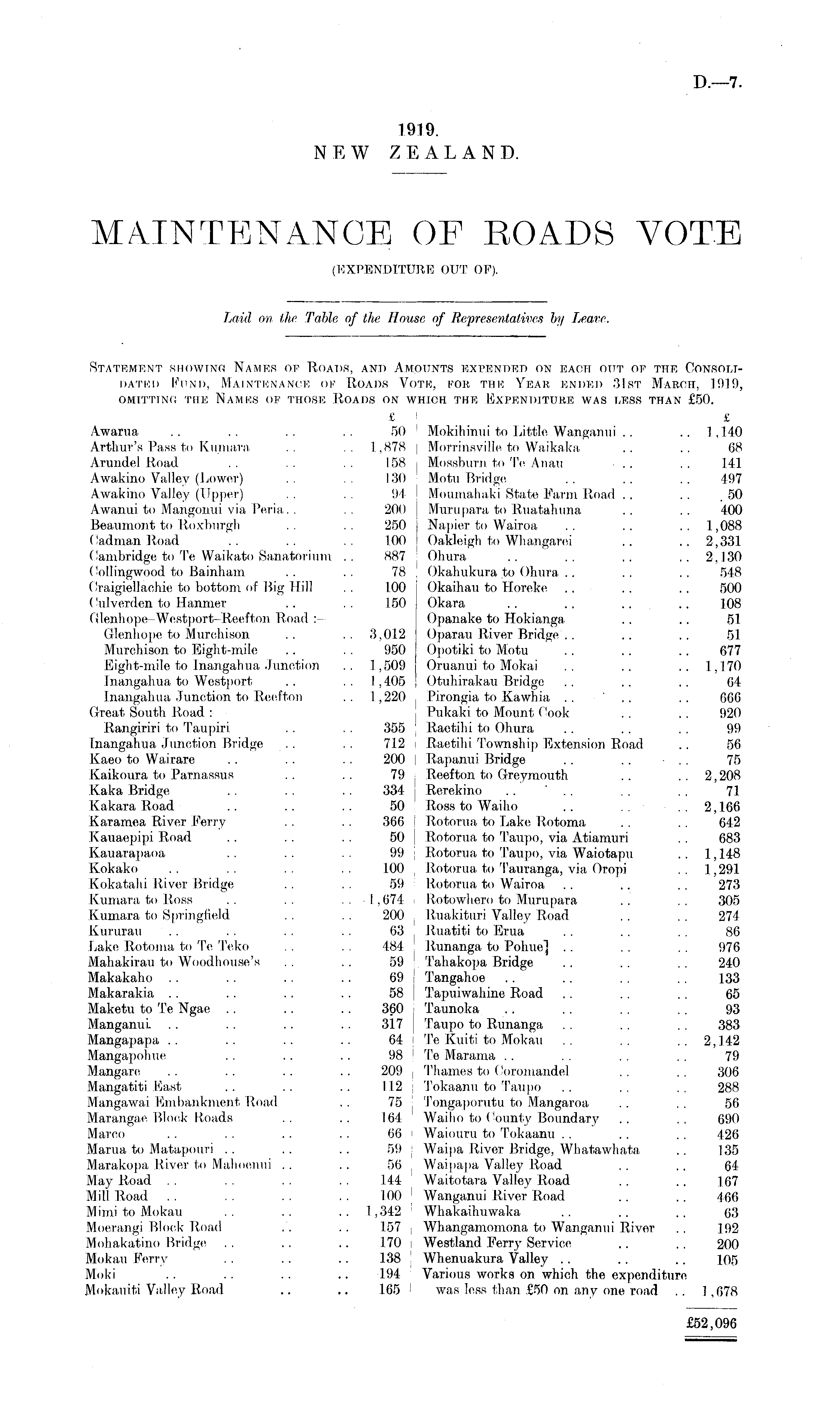 Statement showing Names of Roads, and Amounts expended on each out op the Consolidated Fund, Maintenance of Roads Vote, for thk Year ended 31st March, 1919, omitttng the names of those roads on which the expenditure was less than £50. £ £ Awarua .. .. .. 50 Mokihinui to Little Wanganui . . .. 1,140 Arthur's Pass to Kumara .. .. 1,878 Morrinsville to Waikaka .. .. 68 Arundel Road .. .. 158 Mossburn to Te Anau .. .. 141 Awakino Valley (Lower) . . . . 130 Motu Bridge .. . . . . 497 Awakino Valley (Upper) . . . . 94 Moumahaki State Farm Road .. .. .50 Awanui to Mangonui via Peria. . .. 200 Murupara to Ruatahuna .. .. 400 Beaumont to Roxburgh .. 250 Napier to Wairoa .. .. .. 1,088 Cadmanßoad .. .. .. 1.00 Oakleigh to Whangarei .. ~ 2,331 Cambridge to Te Waikato Sanatorium .. 887 Ohura .. .. .. ..2,130 Collingwood to Bainham .. .. 78 Okahukura to Ohura .. .. .. 548 Craigiellaohie to bottom of Rig Hill . . 1.00 Okaihau to Horeke .. . . .. 500 ('ulverden to Hanmer .. . . 150 Okara .. .. .. .. 108 Glenhope-Westport-Reefton Road :- Opanake to Hokianga . . .. 51 Glenhope to Murchison .. .. 3,012 Oparau River Bridge . . .. .. 51 Murohison to Eight-mile .. . . 950 Opotiki to Motu . . .. .. 677 Eight-mile to Inangahua Junction .. 1,509 Oruanui to Mokai .. .. .. 1,170 Inangahua to Westport . . .. . 1,405 | Otuhirakau Bridge .. .. . . 04 Inangahua Junction to Reefton .. 1,220 , Pirongia to Kawhia .. ~ .. G6O Great South Road : Pukaki to Mount Cook . . .. 920 Rangiriri to Taupiri . . .. 355 Raetilii to Ohura . . .. .. 99 Inangahua Junction Bridge . . .. 712 Raetihi Township Extension Road .. 56 Kaeo to Wairare . . .. . . 200 Rapanui Bridge .. . . ■ . . 75 Kaikoura to Parnassus . . . . 79 Reefton to Greymouth .. . . 2,208 Kaka Bridge .. .. . . 334 Rerekino . . . . . . . . 71 Kakara Road .. .. .. 50 Ross to Waiho .. .. .. 2,166 Karamea River Ferry . . . . 366 Rotorua to Lake Rotoma .. . . 642 Kauaepipi Road .. . . . . 50 Rotorua to Taupo, via Atiamuri . . 683 Kauarapaoa .. . . . . 99 Rotorua to Taupo, via Waiotapu .. 1,148 Kokako .. .. .. .. 100 Rotorua to Tauranga, via Oropi . . 1,291 Kokatahi River Bridge . . . . 59 Rotorua to Wairoa . . .. . . 273 Kumara to Ross .. .. .. 1,674 j Rotowhero to Murupara .. .. 305 Kumara to Springfield .. 200 Ruakituri Valley Road .. 274 Kururau .. .. . . . . 63 Ruatiti to Erua . . .. . . 86 Lake Rotoma to Te Teko . . . . 484 Runanga to Pohue] . . .. 976 Mahakirau to Woodhouse's . . . . 59 Tahakopa Bridge . . .. . . 240 Makakaho .. . . .. .. 69 Tangahoe . . .. . . . . 133 Makarakia .. .. .. .. 58 Tapuiwahine Road .. .. .. 65 Maketu to Te Ngae .. .. .. 360 Taunoka .. .. .. .. 93 Manganui. .. .. .. .. 317 Taupo to Runanga .. 383 Mangapapa .. .. .. .. 64 Te Kuiti to Mokau .. .. .. 2,142 Mangapohue . . .. . . 98 Te Marama . . . . .. . . 79 Mangare .. .. .. .. 209 Thames to C'oromandel .. .. 306 Mangatiti East .. .. .. 112 Tokaanu to Taupo .. .. . . 288 Mangawai Embankment Road .. 75 Tongaporutu to Mangaroa . . . . 56 Marangae Block Roads .. .. 1.64 Waiho to County Boundary .. .. 690 Marco . . . . . . .. 66 Waiouru to Tokaanu . . .. .. 426 Marua to Matapouri .. .. .. 59 i Waipa River Bridge, Whatawhata .. 135 Marakopa River to Mahoenui . . .. 56 Waipapa Valley Road . . .. 64 May Road .. .. .. .. 144 Waitotara Valley Road .. .. 167 Mill Road .. .. .. .. 100 J Wanganui River Road .. . . 466 Mimi to Mokau .. .. 1,342 ! Whakaihuwaka .. .. .. 63 Moerangi Block Road ,', . . 157 | Whangamomona to Wanganui River . . 192 Mohakatino Bridge . . .. .. 170 i Westland Ferry Service .. . , 200 Mokau Ferry .. . . .. 138 ! Whenuakura Valley .. .. .. 105 Moki .. .. .. .. 194 Various works on which the expenditure Mokauiti Valley Road .. .. 165 I was less than £50 on any one road .. 1,678 £52,096