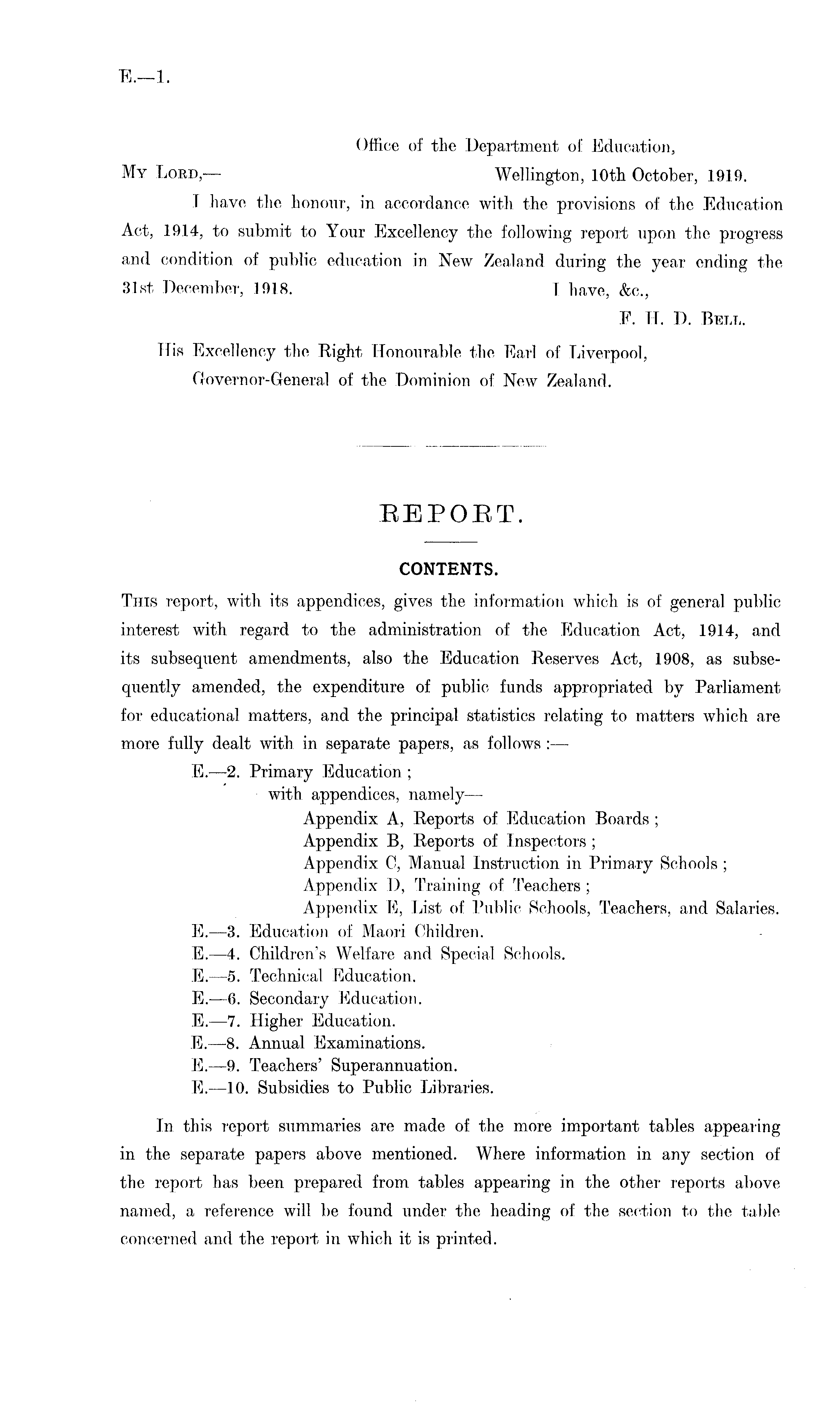 Office of the Department of Education, My Lord,— Wellington, 10th October, 1919. T have the honour, in accordance with the provisions of the Education Act, 1914, to submit to Your Excellency the following report upon the progress and condition of public education in New Zealand during the year ending the 31, st December, 1918. T have, &c, F. IT. D. Bell. His Excellency the Right Honourable the Earl of Liverpool, Governor-General of the Dominion of New Zealand.