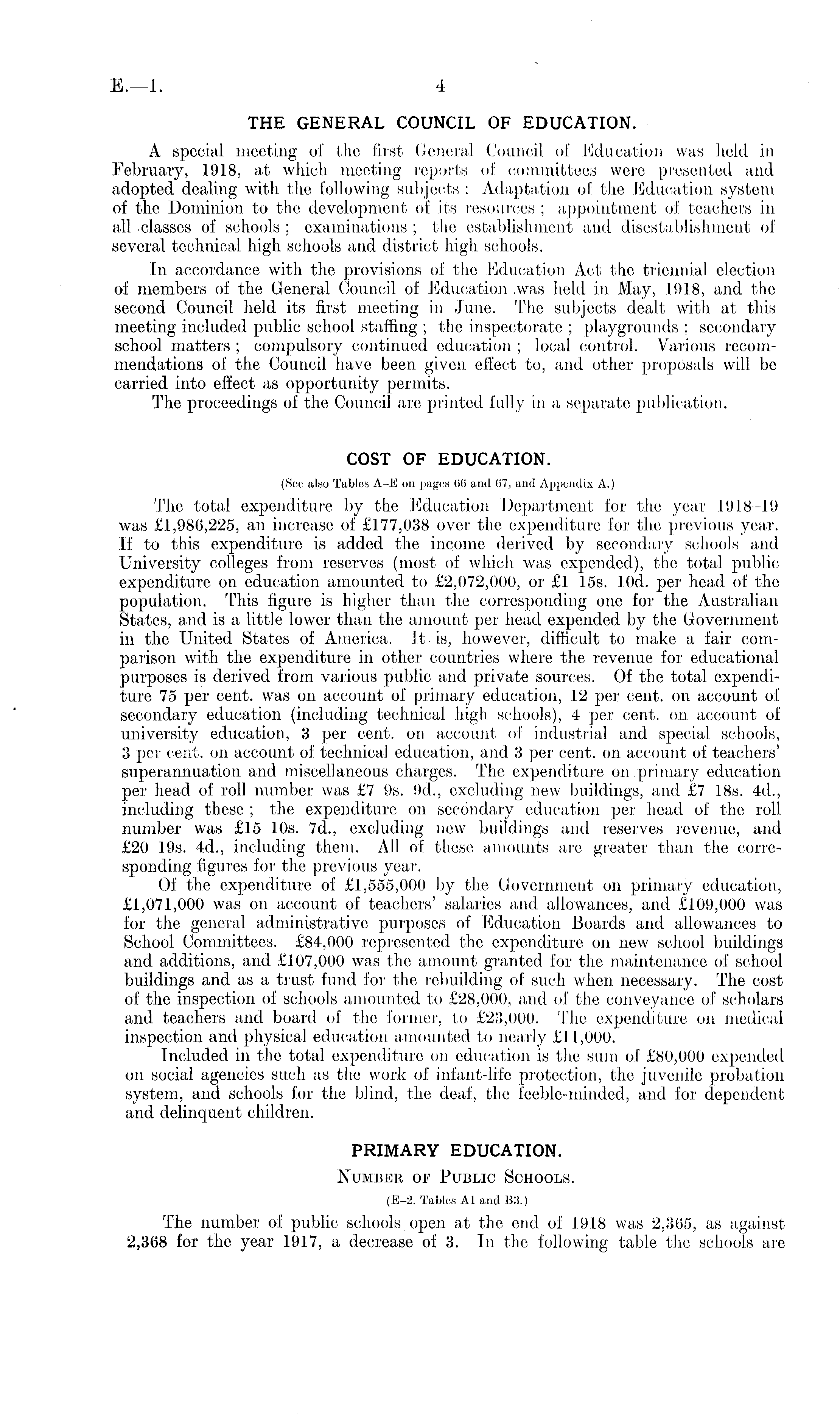 THE GENERAL COUNCIL OF EDUCATION. A special meeting of the first General Council of Education was held in February, 1918, at which meeting reports of committees were presented and adopted dealing with the following subjects : Adaptation of the Education system of the Dominion to the development of its resources ; appointment of teachers in all classes of schools ; examinations ; the establishment and disestablishment of several technical high schools and district high schools. In accordance with the provisions of the Education Act the triennial election of members of the General Council of Education was held in May, 1918, and the second Council held its first meeting in June. The subjects dealt with at this meeting included public school staffing ; the inspectorate ; playgrounds ; secondary school matters ; compulsory continued education ; local control. Various recommendations of the Council have been given effect to, and other proposals will be carried into effect as opportunity permits. The proceedings of the Council are printed fully in a separate publication. COST OF EDUCATION. (See also Tables A-E on pages (i(i and U7, and Appendix A.) The total expenditure by the Education Department for the year 1918-19 was £1,980,225, an increase of £177,038 over the expenditure for the previous year. If to this expenditure is added the income derived by secondary schools and University colleges from reserves (most of which was expended), the total public expenditure on education amounted to £2,072,000, or £l 15s. lOd. per head of the population. This figure is higher than the corresponding one for the Australian States, and is a little lower than the amount per head expended by the Government in the United States of America. It is, however, difficult to make a fair comparison with the expenditure in other countries where the revenue for educational purposes is derived from various public and private sources. Of the total expenditure 75 per cent, was on account of primary education, 12 per cent, on account of secondary education (including technical high schools), 4 per cent, on account of university education, 3 per cent, on account of industrial and special schools, 3 per cent, on account of technical education, and 3 per cent, on account of teachers' superannuation and miscellaneous charges. The expenditure on primary education per head of roll number was £7 9s. 9d., excluding new buildings, and £7 18s. 4d., including these ; the expenditure on secondary education per head of the roll number was £15 10s. 7d., excluding new buildings and reserves revenue, and £20 19s. 4d., including them. All of these amounts are greater than the corresponding figures for the previous year. Of the expenditure of £1,555,000 by the Government on primary education, £1,071,000 was on account of teachers' salaries and allowances, and £109,000 was for the general administrative purposes of Education Boards and allowances to School Committees. £84,000 represented the expenditure on new school buildings and additions, and £107,000 was the amount granted for the maintenance of school buildings and as a trust fund for the rebuilding of such when necessary. The cost of the inspection of schools amounted to £28,000, and ol the conveyance of scholars and teachers and board of the former, to £23,000. The expenditure on medical inspection and physical education amounted to nearly £11,000. Included in the total expenditure on education is the sum of £80,000 expended on social agencies such as the work of infant-life protection, the juvenile probation system, and schools for the blind, the deaf, the feeble-minded, and for dependent and delinquent children. PRIMARY EDUCATION. Number of Public Schools. (E-2. Tables Al and 83.) The number of public schools open at the end of .1918 was 2,365, as against 2,368 for the year 1917, a decrease of 3. In the following table the schools arc