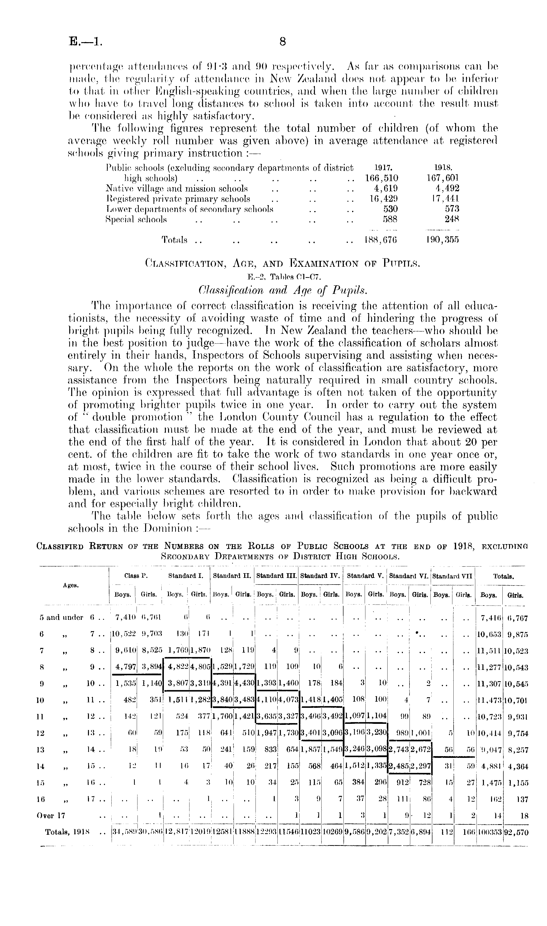 percentage attendances of 91-3 and 90 respectively. As far as comparisons can be made, the regularity of attendance in New Zealand does not appear to be inferior to that in other English-speaking countries, and when the large number of children who have to travel long distances to school is taken into account the result must be considered as highly satisfactory. The following figures represent the total number of children (of whom the average weekly roll number was given above) in average attendance at registered schools giving primary instruction : — Public schools (excluding secondary departments of district 1917. 1918. high schools) .. .. .. .. ..166,510 167,601 Native village and mission schools .. .. .. 4,619 4,492 Registered private primary schools .. .. .. 1.6,429 17,441 Lower departments of secondary schools .. .. 530 573 Special schools .. .. .. .. .. 588 248 Totals .. .. .. .. ..188,676 190,355 Classification, Age, and Examination oe Pupils. E.-2, Tahlcs 01-C7. Classification and Age of Pupils. The importance of correct classification is receiving the attention of all educationists, the necessity of avoiding waste of time and. of hindering the progress of bright pupils being fully recognized. In New Zealand the teachers —who should be in the best position to judge—have the work of the classification of scholars almost entirely in their hands, Inspectors of Schools supervising and assisting when necessary. On the whole the reports on the work of classification are satisfactory, more assistance from the inspectors being naturally required in small country schools. The opinion is expressed that full advantage is often not taken of the opportunity of promoting brighter pupils twice in one year. In order to carry out the system of " double promotion " the London County Council has a regulation to the effect that classification must be made at the end of the year, and must be reviewed at the end of the first half of the year. It is considered in London that about 20 per cent, of the children are fit to take the work of two standards in one year once or, at most, twice in the course of their school lives. Such promotions are more easily made in the lower standards. Classification is recognized as being a difficult problem, and various schemes are resorted to in order to make provision for backward and for especially bright children. The table below sets forth the ages and classification of the pupils of public schools in the Dominion : —