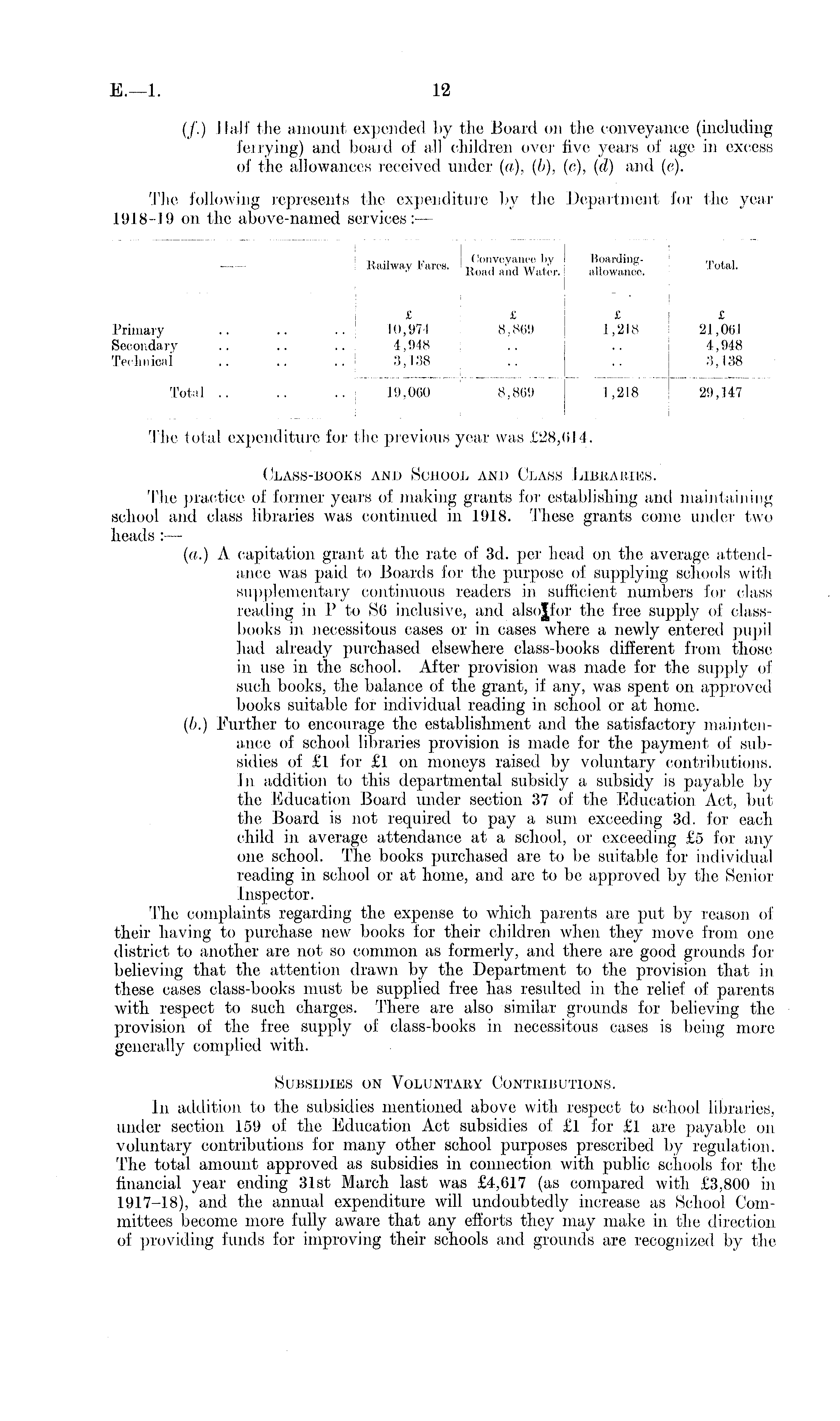 (/.) Half the amount expended by the Board on the conveyance (including ferrying) and board of all children over five years of age in excess of the allowances received under (a), (b), (c), (d) and (c). The following represents the expenditure by the Department for the year 1918-19 on the above-named services:—