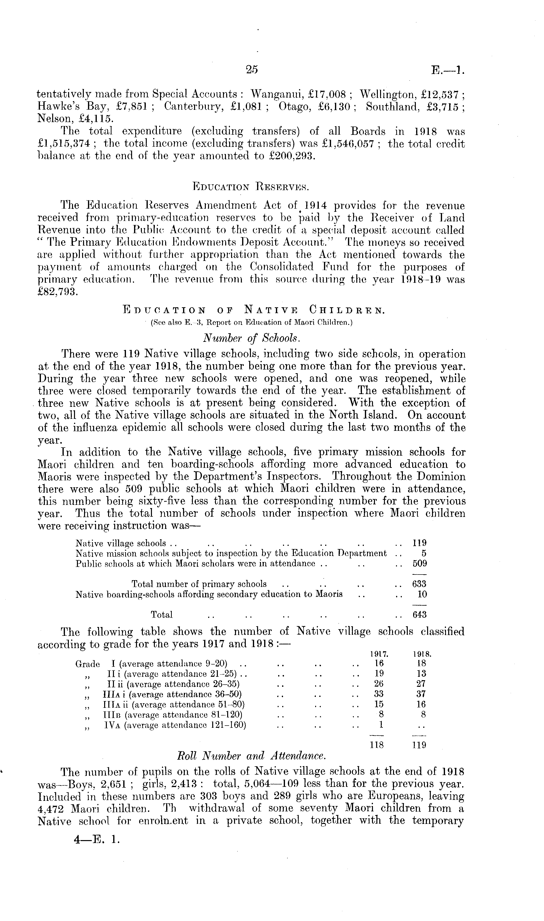 tentatively made from Special Accounts : Wanganui, £17,008 ; Wellington, £12,537 ; Hawke's Bay, £7,851; Canterbury, £1,081; "Otago, £6,130; Southland, £3,715; Nelson, £4,115. The total expenditure (excluding transfers) of all Boards in 1918 was £1,515,374 ; the total income (excluding transfers) was £1,540,057 ; the total credit balance at the end of the year amounted to £200,293. Education Reserves. The Education Reserves Amendment Act of 1914 provides for the revenue received from primary-education reserves to be paid by the Receiver of Land Revenue into the Public Account to the credit of a special deposit account called 1 The Primary Education Endowments Deposit Account." The moneys so received are applied without further appropriation than the Act mentioned towards the payment of amounts charged on the Consolidated Fund for the purposes of primary education. The revenue from this source during the year 1918—19 was £82,793. Education of Native Children. (Sco also E.-8, Report on Education of Maori Children.) Number of Schools. There were 119 Native village schools, including two side schools, in operation at the end of the year 1918, the number being one more than for the previous year. During the year three new schools were opened, and one was reopened, while three were closed temporarily towards the end of the year. The establishment of three new Native schools is at present being considered. With the exception of two, all of the Native village schools are situated in the North Island. On account of the influenza epidemic all schools were closed during the last two months of the year. In addition to the Native village schools, five primary mission schools for Maori children and ten boarding-schools affording more advanced education to Maoris were inspected by the Department's Inspectors. Throughout the Dominion there were also 509 public schools at which Maori children were in attendance, this number being sixty-five less than the corresponding number for the previous year. Thus the total number of schools under inspection where Maori children were receiving instruction was — Native village schools .. .. .. .. .. .. 119 Native mission schools subject to inspection by the Education Department .. 5 Public schools at which Maori scholars were in attendance .. .. .. 509 Total number of primary schools .. .. .. .. 633 Native boarding-schools affording secondary education to Maoris .. .. 10 Total .. .. .. .. .. ..643 The following table shows the number of Native village schools classified according to grade for the years 1917 and 1918 : — 1.917. 1918. Grade I (average attendance 9-20) .. .. .. ..16 18 ~ II i (average attendance 21-25) .. .. .. ..19 13 ~ II ii (average attendance 26-35) .. .. 26 27 „ IIIa i (average attendance 36-50) .. .. 33 37 ~ IIIa ii (average attendance 51-80) .. .. 15 16 „ IIIb (average attendance 81-120) .. .. ..8 8 ~ IVa (average attendance 121-160) .. .. .. 1 118 119 Roll Number and Attendance. The number of pupils on the rolls of Native village schools at the end of 1918 was —-Boys, 2,651 ; girls, 2,413 : total, 5,064 —109 less than for the previous year. Included in these numbers are 303 boys and 289 girls who are Europeans, leaving 4,472 Maori children. Th withdrawal of some seventy Maori children from a Native school for enrolment in a private school, together with the temporary