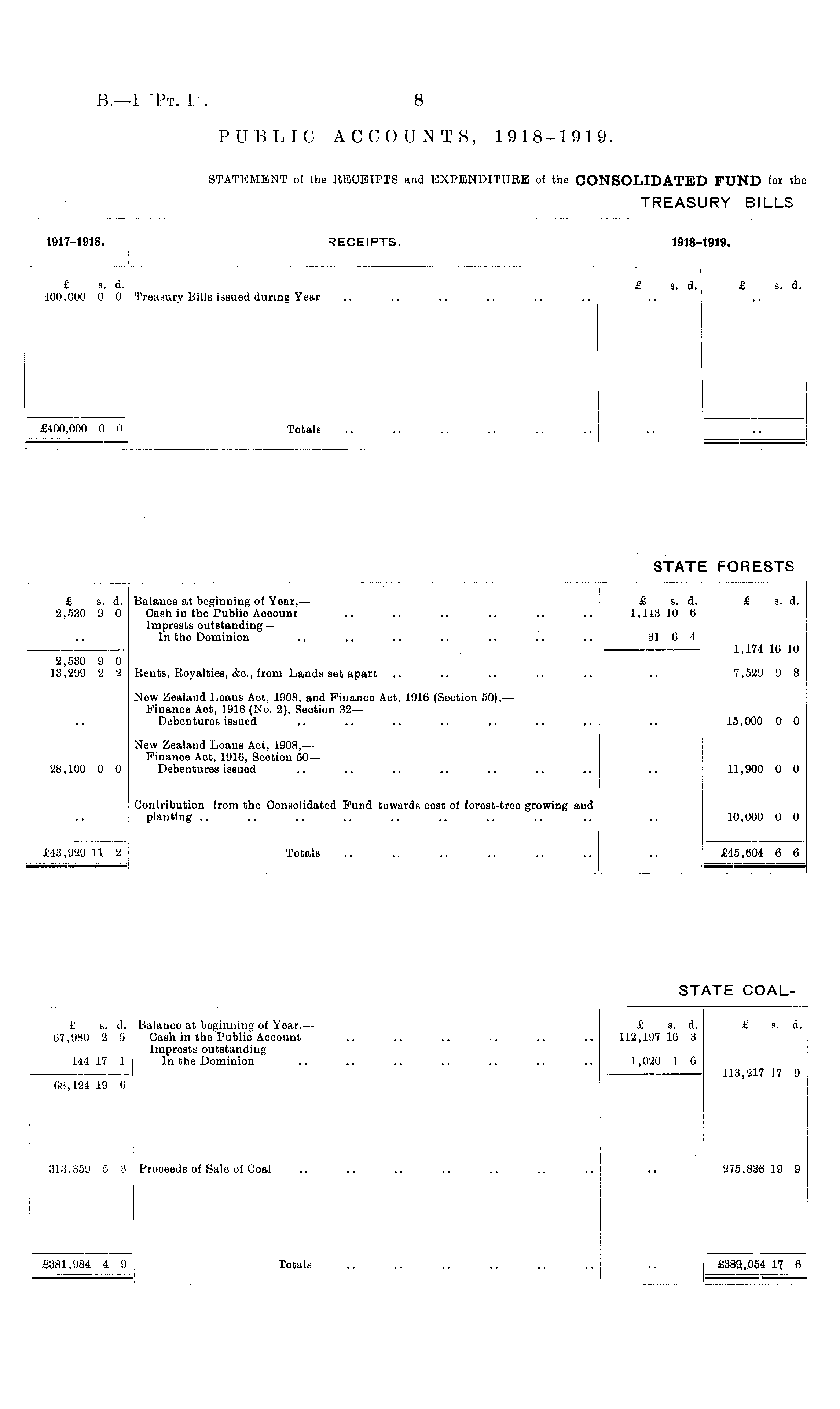 1917-1918. RECEIPTS. 1918-1919. £ a. d. 400,000 0 0 j Treasury Bills issued during Year £ s. d. £ s. d. £400,000 0 0 Totals £400,000 0 0 STAT I .TATE FG E FORESTS HRES STS i £ s. d. Balanoe at beginning of Year, — 2,530 9 0 Cash in the Public Account Imprests outstanding— In the Dominion £ s. d. 1,143 10 6 £ 1,143 31 s. d. 1 10 6 [ 0 4 ] £ s. d. £ 1,174 s. d. 10 10 31 0 4 1,174 10 10 2,530 9 0 13,299 2 2 Rents, Royalties, &c, from Lands set apart 2,530 9 0 13,299 2 2 7,529 9 8 7,529 9 8 New Zealand Loans Act, 1908, and Finance Act, 1916 (Section 50),— Finance Aot, 1918 (No. 2), Seotion 32— Debentures issued 11 15,000 0 0 5,000 0 0 New Zealand Loans Aot, 1908, — Finance Aot, 1916, Section 50— 28,100 0 0 Debentures issued 28,100 0 0 ,. 11 11,900 0 0 1,900 0 0 Contribution from the Consolidated Fund towards cost of forest-tree growing and planting .. I I I I I 1( 10,000 0 0 0,000 0 0 £43,929 11 2 Totals £43,929 11 2 £4{ £45,604 6 6 ,5,604 6 6 ST STATE TE COAL- ; CO/ AL- £ s. d. Balauco at hoginning of Year, — 67,980 2 5 Cash in the Public Account Imprests outstanding— 144 17 1 In the Dominion .. .. .. ., .. .. 11! £ s. d. 112,197 10 y £ 2,197 1,020 s. d. J 16 3 ) 1 6 111 £ s. d. £ .3,217 s. d. 17 9 08,124 19 6 1,020 1 6 113,217 17 9 275,836 19 9 313,859 5 3 Proceeds of Sale of Coal 27! f5,836 19 9 £381,984 4 9 Totals £38' £389,054 17 6 39,054 17 6