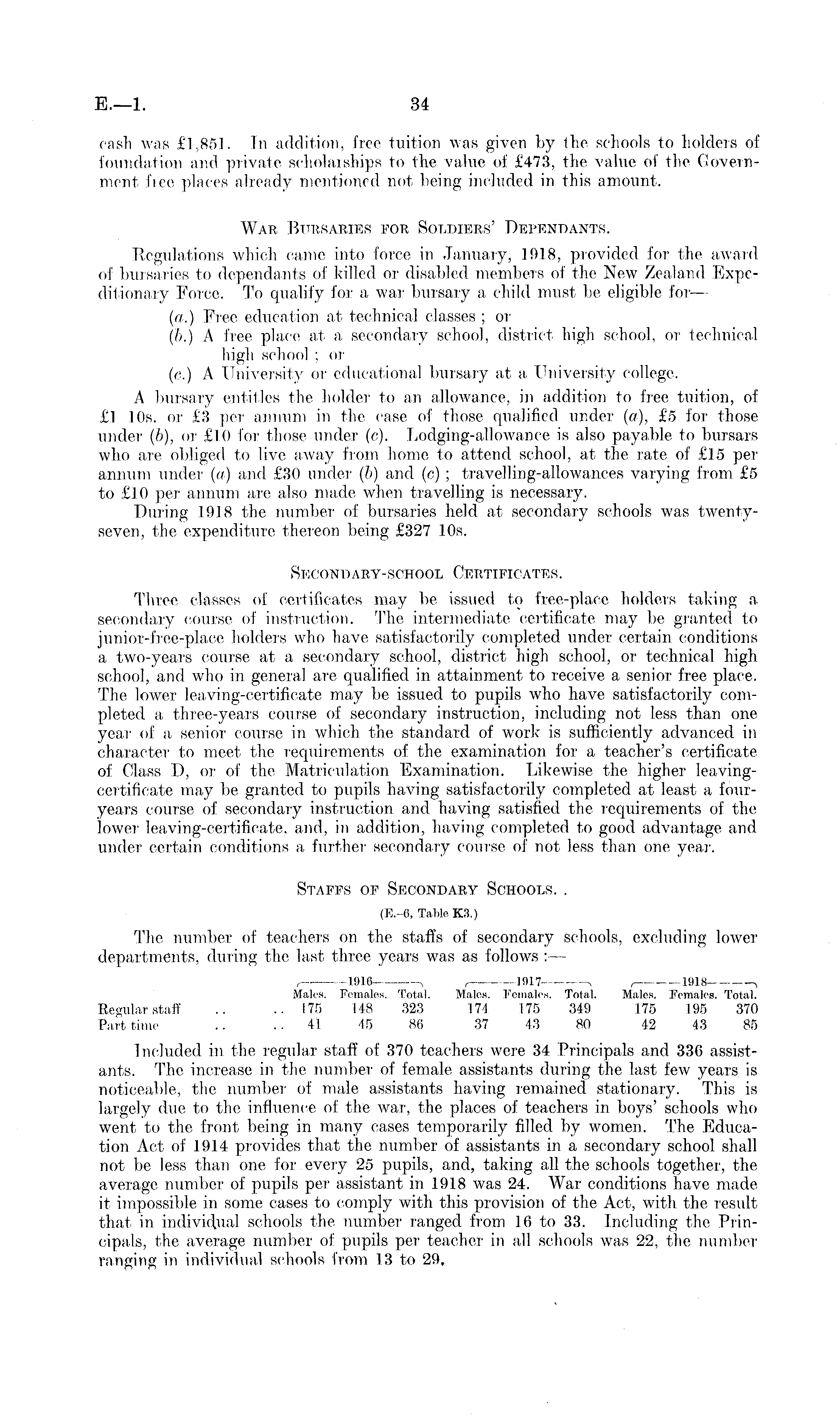 cash was £1,851. In addition, free tuition was given by the schools to holders of foundation and private scholarships to the value of £473, the value of the Government fiee places already mentioned not being included in this amount. War Bursaries for Soldiers' Dependants. Regulations which came into force in January, 1918, provided for the award of bursaries to dependants of killed or disabled members of the New Zealand Expeditionary Force. To qualify for a war bursary a child must be eligible for* — (a.) Free education at technical classes ; or (b.) A free place at a secondary school, district high school, or technical high school ; or (c.) A University or educational bursary at a University college. A bursary entitles the holder to an allowance, in addition to free tuition, of £l 10s. or £3 per annum in the case of those qualified under (a), £5 for those under (b), or £10 for those under (c). Lodging-allowance is also payable to bursars who are obliged to live away from home to attend school, at the rate of £15 per annum under (a) and £30 under (b) and (c) ; travelling-allowances varying from £5 to £10 per annum are also made when travelling is necessary. During 1918 the number of bursaries held at secondary schools was twentyseven, the expenditure thereon being £327 10s. Secondary-school Certificates. Three classes of certificates may be issued to free-place holders taking a secondary course of instruction. The intermediate certificate may be granted to junior-free-place holders who have satisfactorily completed under certain conditions a two-years course at a secondary school, district high school, or technical high school, and who in general are qualified in attainment to receive a senior free place. The lower leaving-certificate may be issued to pupils who have satisfactorily completed a three-years course of secondary instruction, including not less than one year of a senior course in which the standard of work is sufficiently advanced in character* to meet the requirements of the examination for a teacher's certificate of Class D, or of the Matriculation Examination. Likewise the higher leavingcertificate may be granted to pupils having satisfactorily completed at least a fouryears course of secondary instruction and having satisfied the requirements of the lower leaving-certificate, and, in addition, having completed to good advantage and under certain conditions a further secondary course of not less than one year. Staffs of Secondary Schools. . (E.-6, Table K3.) The number of teachers on the staffs of secondary schools, excluding lower departments, during the last three years was as follows : — , 1916 , , 1917 , , 1918 , Males. Females. Total. Males. Female's. Total. Males. Females. Total. Regular staff .. ..175 148 323 174 175 349 175 195 370 Part time .. .. 41 45 86 37 43 80 42 43 85 Included in the regular staff of 370 teachers were 34 Principals and 336 assistants. The increase in the number of female assistants during the last few years is noticeable, the number of male assistants having remained stationary. This is largely due to the influence of the war, the places of teachers in boys' schools who went to the front being in many cases temporarily filled by women. The Education Act of 1914 provides that the number of assistants in a secondary school shall not be less than one for.every 25 pupils, and, taking all the schools together, the average number of pupils per assistant in 1918 was 24. War conditions have madeit impossible in some cases to comply with this provision of the Act, with the result that in individual schools the number ranged from 16 to 33. Including the Principals, the average number of pupils per teacher in all schools was 22, the number ranging in individual schools from 13 to 29,