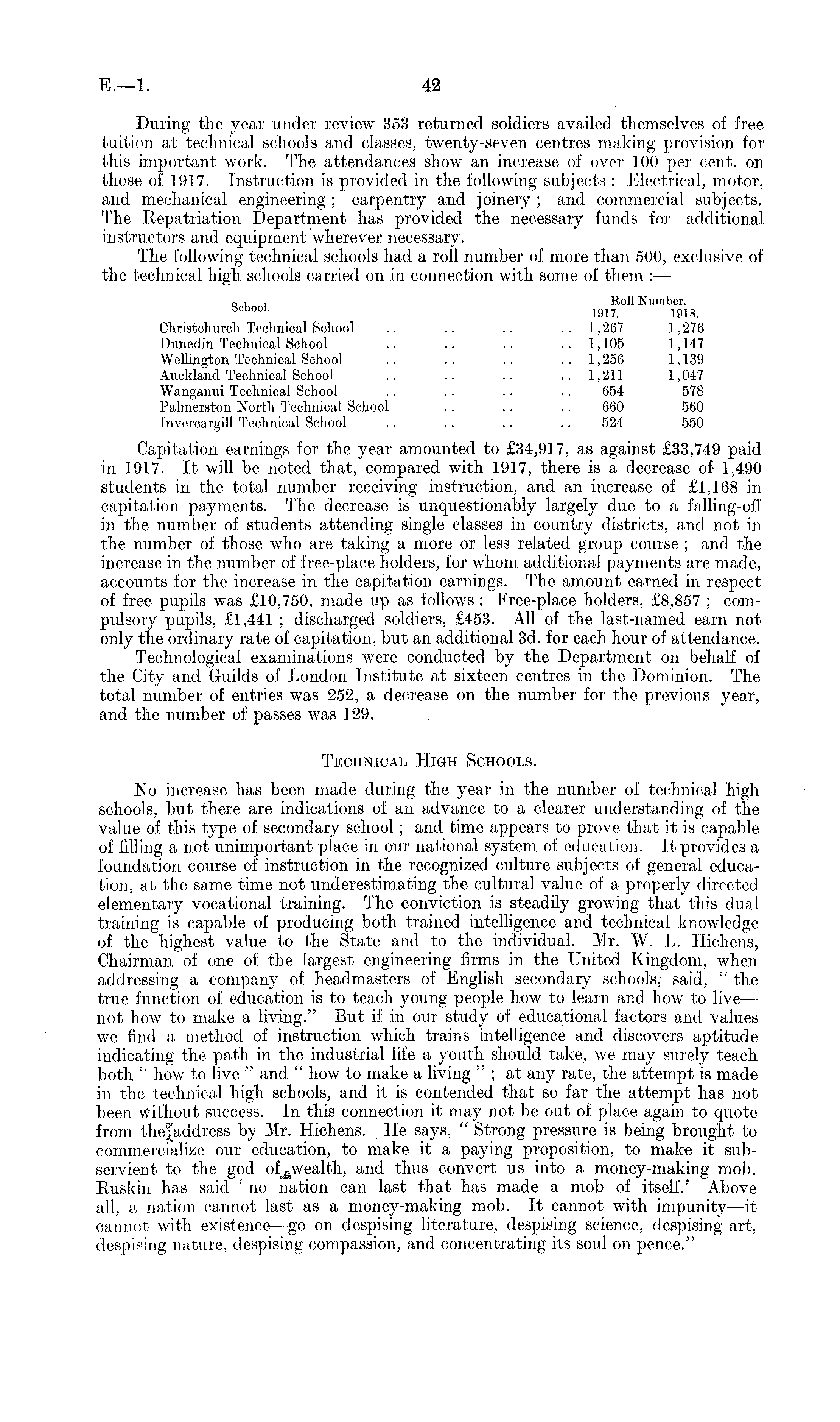 During the year under review 353 returned soldiers availed themselves of free tuition at technical schools and classes, twenty-seven centres making provision for this important work. The attendances show an increase of over' 100 per cent, on those of 1.917. Instruction is provided in the following subjects : Electrical, motor, and mechanical engineering ; carpentry and joinery ; and commercial subjects. The Repatriation Department has provided the necessary funds for additional instructors and equipment wherever necessary. The following technical schools had a roll number of more than 500, exclusive of the technical high, schools carried on in connection with some of them : — „ , . Roll Number. SchooL 1917. 1918. Christchurch Technical School .. .. .. ..1,267 1,276 Dunedin Technical School .. .. .. 1,105 1,147 Wellington Technical School .. .. .. ..1,256 1,139 Auckland Technical School .. .. .. ..1,211 1,047 Wanganui Technical School . . .. .. .. 654 578 Palmerston North Technical School. .. .. .. 660 560 Invercargill Technical School . . .. .. .. 524 550 Capitation earnings for the year amounted to £34,917, as against £33,749 paid in .1917. It will be noted that, compared with 1917, there is a decrease of 1,490 students in the total number receiving instruction, and. an increase of £1,168 in capitation payments. The decrease is unquestionably largely due to a falling-off in the number* of students attending single classes in. country districts, and not in the number of those who are taking a more or less related group course ; and the increase in the number of free-place holders, for whom additional payments are made, accounts for the increase in the capitation earnings. The amount earned in respect of free pupils was £10,750, made up as follows : Free-place holders, £8,857 ; compulsory pupils, £1,441 ; discharged soldiers, £453. All of the last-named earn not only the ordinary rate of capitation, but an additional 3d. for each hour of attendance. Technological examinations were conducted by the Department on behalf of the City and Guilds of London Institute at sixteen centres in the Dominion. The total number of entries was 252, a decrease on the number for the previous year, and the number of passes was 129. Technical High Schools. No increase has been made during the year in the number of technical high schools, but there are indications of an advance to a clearer understanding of the value of this type of secondary school; and time appears to prove that it is capable of filling a not unimportant place in our national system of education. It provides a foundation course of instruction in the recognized culture subjects of general education, at the same time not underestimating the cultural value of a properly directed elementary vocational training. The conviction is steadily growing that this dual training is capable of producing both trained intelligence and technical knowledge of the highest value to the State and to the individual. Mr. W. L. Hichens, Chairman of one of the largest engineering firms in the United Kingdom, when addressing a company of headmasters of English secondary schools, said, " the true function of education is to teach young people how to learn and how to live — not how to make a living." But if in our study of educational factors and values we find a method of instruction which trains intelligence and discovers aptitude indicating the path in the industrial life a youth should take, we may surely teach both " how to live " and " how to make a living " ; at any rate, the attempt is made in the technical high schools, and it is contended that so far the attempt has not been without success. In this connection it may not be out of place again to quote from the|address by Mr. Hichens. He says, " Strong pressure is being brought to commercialize our education, to make it a paying proposition, to make it subservient to the god and thus convert us into a money-making mob. Buskin has said 'no nation can last that has made a mob of itself.' Above all, a nation cannot last as a money-making mob. It cannot with impunity—it cannot with existence —go on despising literature, despising science, despising art, despising nature, despising compassion, and concentrating its soul on pence."