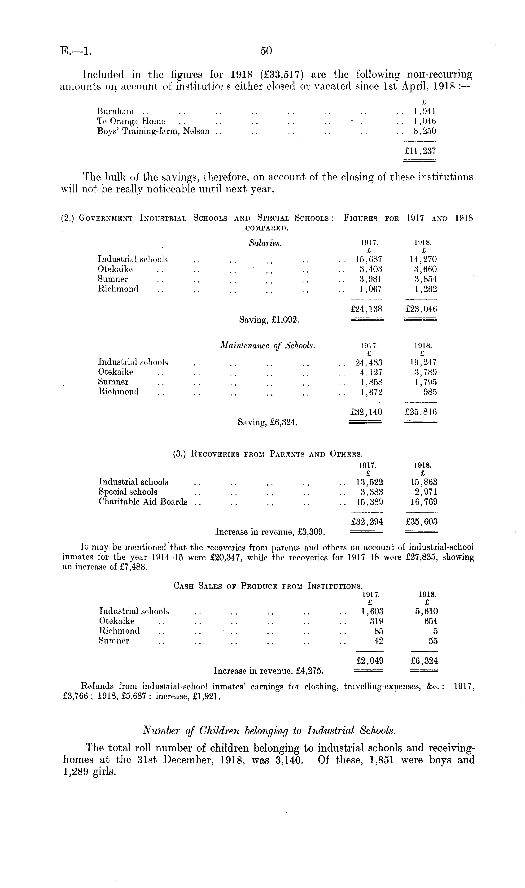 Included in the figures for 1918 (£33,517) are the following non-recurring amounts on account of institutions either closed or vacated since Ist April, 19.18 :— £ Burnham .. .. .. .. .. .. 1,941 Te Oranga Home .. .. .. .. .. * .. .. 1,046 Boys' Training-farm, Nelson .. .. .. .. .. .. 8,250 £11,237 The bulk of the savings, therefore, on account of the closing of these institutions will not be really noticeable until next year. (2.) Government Industrial Schools and Special Schools : Figures for 1917 and 1918 compared. Salaries. 1917. 1.918. £ £ Industrial schools .. .. .. .. .. 15,687 14,270 Otekaike .. .. .. .. .. 3,403 3,660 Sumner .. .. .. .. .. 3,981 3,854 Richmond .. .. .. .. 1,067 1,262 £24,138 £23,046 Saving, £1,092. ---■- = ■■'■■■■-■-- Maintenance of Schools. 1917. 1918. J £ £ Industrial schools '.'. .. .. .. .. 24,483 19,247 Otekaike .. .. ..4,127 3,789 Sumner .. .. .. .. .. 1,858 1,795 Richmond .. .. .. ..1,672 985 £32,140 £25,816 Saving, £6,324. —- ' " (3.) Recoveries from Parents and Others. 1917. 1918. £ £ Industrial schools .. .. .. .. ..13,522 15,863 Special schools .. .. .. .. .. 3,383 2,971 Charitable Aid Boards .. .. ... .. ..15,389 16,769 £32,294 £35,603 Increase in revenue, £3,309. ' It may be mentioned that the recoveries from parents and others on account of industrial-school inmates for the year 1914-15 were £20,347, while the recoveries for 1917-18 were £27,835, showing an increase of £7,488. Cash Sales of Produce from Institutions. 1917. 1918. £ £ Industrial schools .. .. .. .. .. 1,603 5,610 Otekaike .. .. .. .. ... .. 319 654 Richmond .. .. ~ .. .. .. 85 5 Sumner .. .. .. .. .. .. 42 55 £2,049 £6,324 Increase in revenue, £4,275. Refunds from industrial-school inmates' earnings for clothing, travelling-expenses, &c. : 1917, £3,766 ; 1918, £5,687 : increase, £1,921. Number of Children belonging to Industrial Schools. The total roll number of children belonging to industrial schools and receivinghomes at the 31st December, 1918, was 3,140. Of these, 1,851 were boys and 1,289 girls.