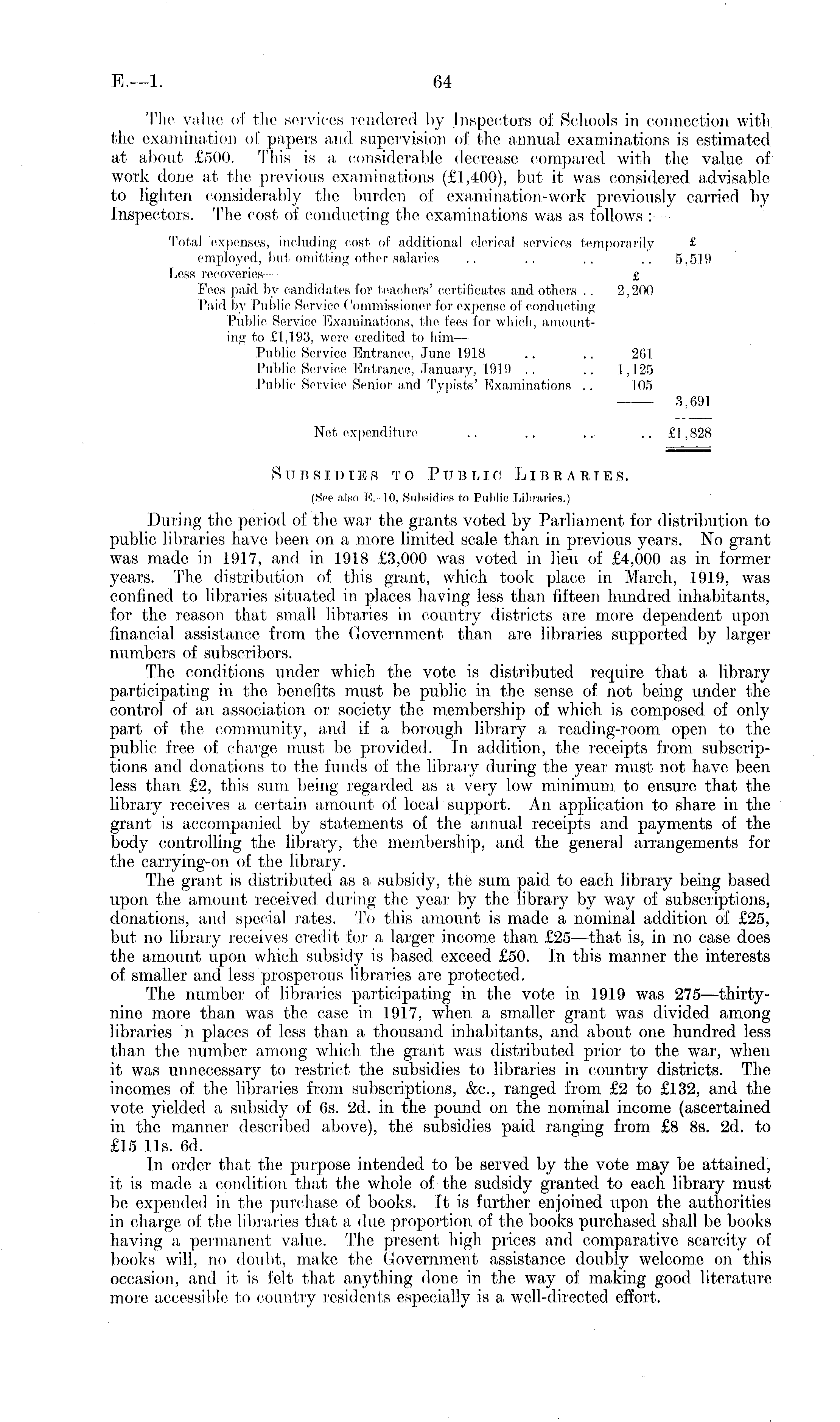 The value of the services rendered, by Inspectors of Schools in connection with the examination of papers and supervision of the annual examinations is estimated at about £500. This is a considerable decrease compared with the value of work done at the previous examinations (£1,400), but it was considered advisable to lighten considerably the burden of examination-work previously carried by Inspectors. The cost of conducting the examinations was as follows : — Total expenses, including cost of additional, clerical services temporarily £ employed, but omitting other salaries .. .. .. .. 5,519 Less recoveries--- £ Pees paid by candidates for teachers' certificates and others . . 2,200 Paid by Public Service Commissioner for expense of conducting Public Service Examinations, the fees for which, amounting to £1,193, were credited to him— Public Service Entrance, June 1918 .. .. 261. Public Service Entrance, January, 1919 .. .. 1,125 Public Service Senior and Typists' Examinations .. 105 3,691 Net, expenditure .. .. .. .. £1,828 Subs to ie ,s to Publio Libeaeies. (See also 10. 10, Subsidies to Pnlilie Libraries.) During the period of the war the grants voted by Parliament for distribution to public libraries have been on a more limited scale than in previous years. No grant was made in 1917, and in 1918 £3,000 was voted in lieu of £4,000 as in former years. The distribution of this grant, which took place in March, 1.9.19, was confined to libraries situated in places having less than fifteen hundred inhabitants, for the reason that small libraries in country districts are more dependent upon financial assistance from the Government than are libraries supported by larger numbers of subscribers. The conditions under which the vote is distributed require that a library participating in the benefits must be public in the sense of not being under the control of an association or society the membership of Avhich is composed of only part of the community, and if a borough library a reading-room open to the public free of charge must be provided. In addition, the receipts from subscriptions and donations to the funds of the library during the year must not have been less than £2, this sum being regarded as a very low minimum to ensure that the library receives a certain amount of local support. An application to share in the grant is accompanied by statements of the annual receipts and payments of the body controlling the library, the membership, and the general arrangements for the carrying-on of the library. The grant is distributed as a subsidy, the sum paid to each library being based upon the amount received during the year* by the library by way of subscriptions, donations, and special rates. To this amount is made a nominal addition of £25, but no library receives credit for a larger income than £25' —that is, in no case does the amount upon which subsidy is based exceed £50. In this manner the interests of smaller and less prosperous libraries are protected. The number of libraries participating in the vote in 1919 was 275 —thirtynine more than was the case in 1917, when a smaller grant was divided among libraries n places of less than a thousand inhabitants, and about one hundred less than the number among which the grant was distributed prior to the war, when it was unnecessary to restrict the subsidies to libraries in country districts. The incomes of the libraries from subscriptions, &c, ranged from £2 to £132, and the vote yielded a subsidy of 6s. 2d. in the pound on the nominal income (ascertained in the manner described above), the subsidies paid ranging from £8 Bs. 2d. to £15 lis. 6d. In order that the purpose intended to be served by the vote may be attained, it is made a, condition that the whole of the sudsidy granted to each library must be expended in the purchase of books. Tt is further enjoined upon the authorities in charge of the libraries that a due proportion of the books purchased shall lie books having a permanent value. The present high prices and comparative scarcity of books will, no doubt, make the Government assistance doubly welcome on this occasion, and it is felt that anything done in the way of making good literature more accessible to country residents especially is a well-directed effort.