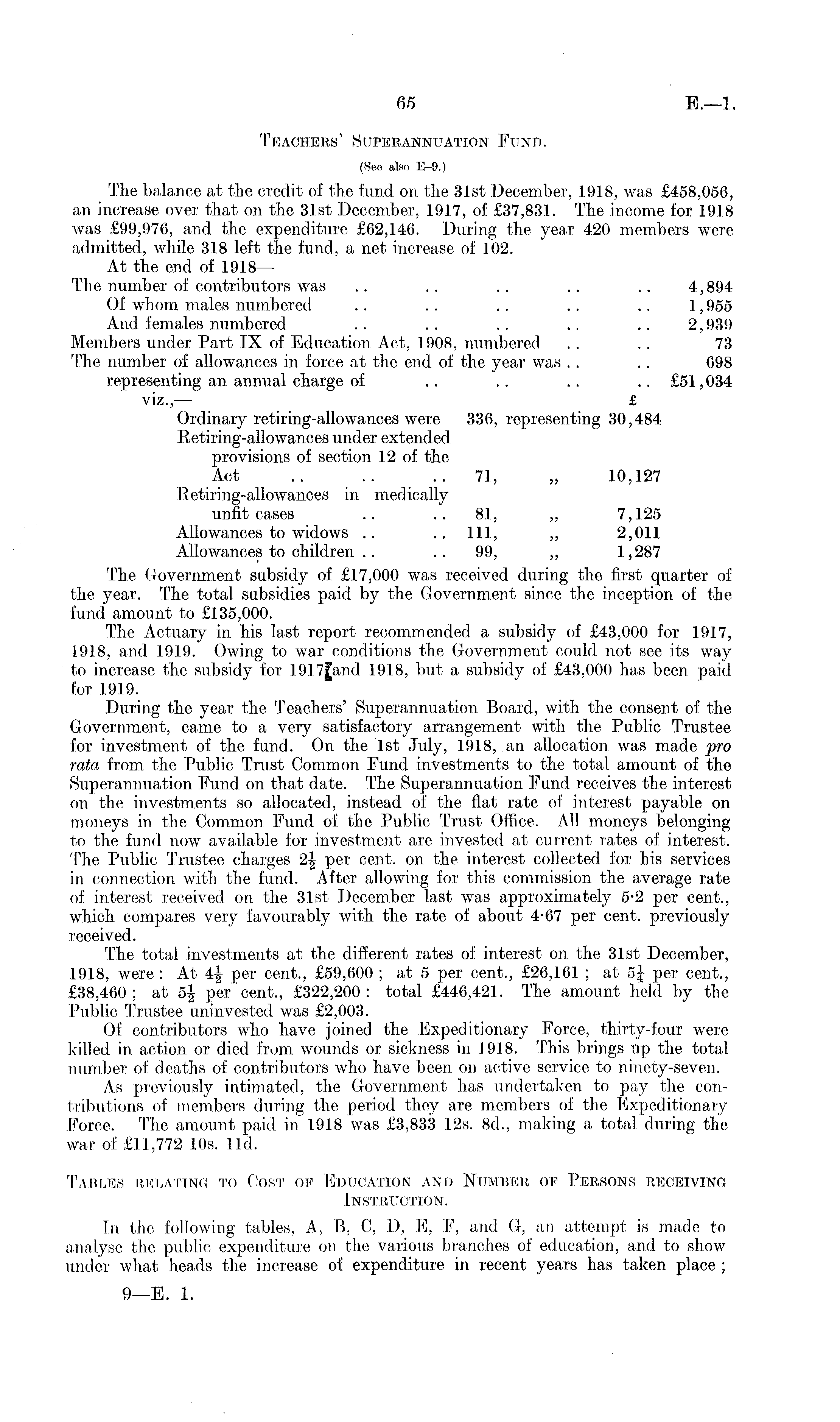 Teachers' Superannuation Fund. (Sco also E-9.) The balance at the credit of the fund on the 31st December*, 1918, Avas £458,056, an increase over that on the 31st December, 1917, of £37,831. The income for 1918 was £99,976, and the expenditure £62,146. During the year 420 members were admitted, while 318 left the fund, a net increase of 102. At the end of 1918Th c number of contributors was .. .. .. .. .. 4,894 Of whom males numbered .. .. .. .. .. 1,955 And females numbered .. .. .. .. .. 2,939 Members under Part IX of Education Act, 1908, numbered . . . . 73 The number of allowances in force at the end of the year was . . .. 698 representing an annual charge of .. .. .. .. £51,034 viz., — £ Ordinary retiring-allowances were 336, representing 30,484 Retiring-allowances under extended provisions of section 12 of the Act .. .. ..71, „ 10,127 Retiring-allowances in medically unfit cases .. ..81, „ 7,125 Allowances to widows .. ~111, ~ 2,011 Allowances to children . . . . 99, ~ 1,287 The Government subsidy of £17,000 was received during the first quarter of the year. The total subsidies paid by the Government since the inception of the fund amount to £135,000. The Actuary in his last report recommended a subsidy of £43,000 for 1917, 1918, and 1919. Owing to war conditions the Government could not see its way to increase the subsidy for 1917|jand 1918, but a subsidy of £43,000 has been paid for 1919. During the year the Teachers' Superannuation Board, with the consent of the Government, came to a very satisfactory arrangement with the Public Trustee for investment of the fund. On the Ist July, 1918, an allocation was made pro rata from the Public Trust Common Fund investments to the total amount of the Superannuation Fund on that date. The Superannuation Fund receives the interest on the investments so allocated, instead of the flat rate of interest payable on moneys in the Common Fund of the Public Trust Office. All moneys belonging to the fund now available for investment are invested at current rates of interest. The Public Trustee charges 2\ per cent, on the interest collected for his services in connection with the fund. After allowing for this commission the average rate of interest received on the 31st December last was approximately 5*2 per cent., which compares very favourably with the rate of about 4-67 per cent, previously received. The total investments at the different rates of interest on the 31st December, 1918, were : At 4| per cent., £59,600 ; at 5 per cent., £26,161 ; at 5-f- per cent., £38,460; at 5\ per cent., £322,200: total £446,421. The amount held by the Public Trustee uninvested was £2,003. Of contributors who have joined the Expeditionary Force, thirty-four were killed in action or died from Avounds or sickness in 1918. This brings up the total number of deaths of contributors who have been on active service to ninety-seven. As previously intimated, the Government has undertaken to pay the contributions of members during the period they are members of the Expeditionary Force. The amount paid in 1.918 Avas £3,833 12s. Bd., making a total during the war of £11,772 10s. lid. Tables relating to Cost ok Education anb Number of Persons receivinci i nstruction. In the following tables, A, B, C, 1), E, F, and G, an attempt is made to analyse the public expenditure on the various branches of education, and to slioav under Avhat heads the increase of expenditure in recent years has taken place ;
