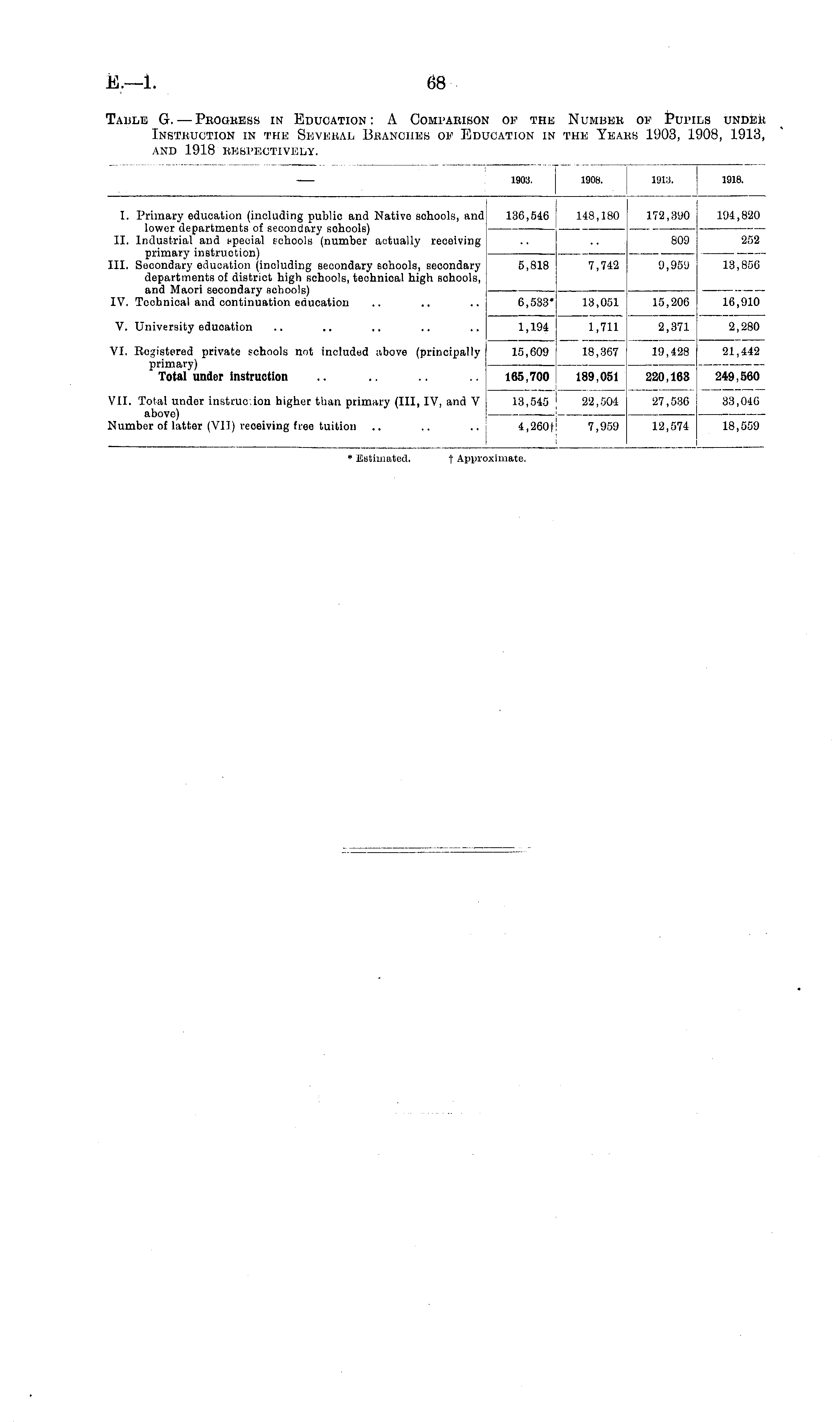 1903. 1908. 1913. 1918. I. Primary education (including public and Native schools, and lower departments of secondary sohools) II. Industrial and special rchools (number actually reooiving primary instruction) III. Secondary education (including secondary schools, secondary departments of district high schools, teohnieal high schools, and Maori secondary schools) IV. Technical and continuation education 136,546 148,180 172,390 191,820 809 252 5,818 ; 7,742 9,959 13,850 16,910 6,583*i 13,051 15,206 V. University eduoation 1,194 15,609 1,711 18,367 2,371 19,428 2,280 21,442 249,560 VI. Registered private schools not included above (principally primary) Total under instruction 165,700 189,051 220,163 VII. Total under Instruction higher than primary (III, IV, and V above) Number of latter (VI I) reoeiving free tuition 13,545 4,260f 22,504 27,536 12,574 33,040 7,959 18,509 * Estimated. in ixlmate.