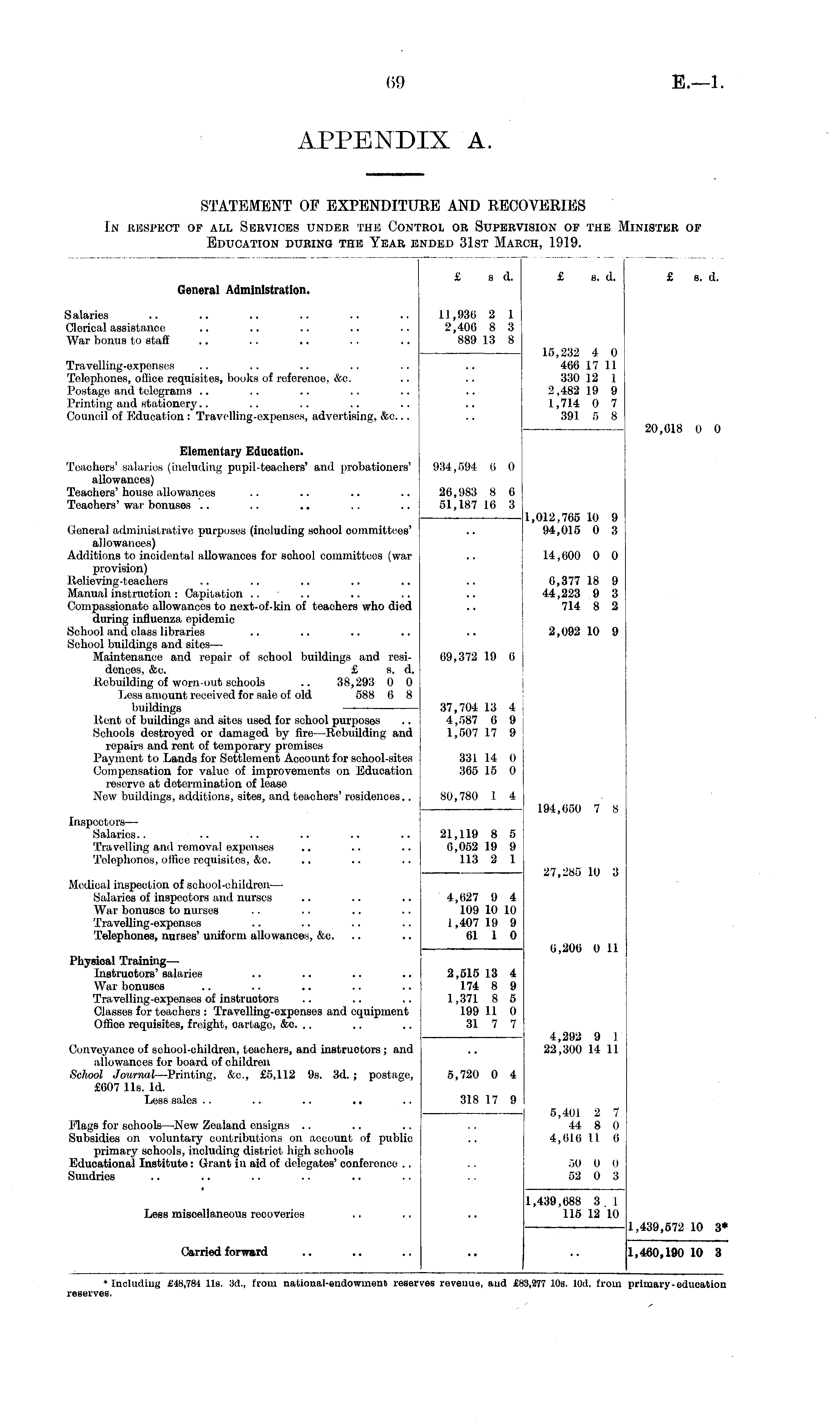 General Administration. £ s d. £ s. d. £ s. d. Salaries Clerical assistance War bonus to staff 11,930 2 1 2,406 8 3 889 13 8 15,232 4 0 466 17 11 330 12 I 2,482 19 9 1,714 0 7 39.1 5 8 Travelling-expenses Telephones, office requisites, books of reference, <fcc. Postage and telegrams Printing and stationery Council of Education : Travelling-expenses, advertising, &c... 20,018 0 0 Elementary Education. 934,594 6 0 Teachers' salaries (including pupil-teachers' and probationers' allowances) Teachers' house allowances Teachers' war bonuses 26,983 8 6 51,187 16 3 General administrative purposes (including school committees' allowances) Additions to incidental allowances for school committees (war provision) Relieving-teachers Manual instruction : Capitation Compassionate allowances to next-of-kin of teachers who died during influenza epidemic School and class libraries School buildings and sites— Maintenance and repair of school buildings and residences, &c. £ s. d. Rebuilding of worn-out schools .. 38,293 0 0 Less amount received for sale of old 588 6 8 buildings —-— Rent of buildings and sites used for school purposes Schools destroyed or damaged by fire —Rebuilding and repairs and rent of temporary premises Payment to Lands for Settlement Account for school-sites Compensation for value of improvements on Education resorvo at determination of lease New buildings, additions, sitos, and teachers' residences.. 1,012,765 10 9 94,015 0 3 14,000 0 0 0,377 18 9 44,223 9 3 714 8 2 2,092 10 9 69,372 19 0 37,704 13 4 4,587 6 9 1,507 17 9 331 14 0 365 15 0 80,780 1 4 Inspectors— Salaries.. Travelling and removal expenses Telephones, office requisites, &c. 194,650 7 8 21,119 8 5 0,052 19 9 113 2 1 27,285 10 3 Medical inspection of school-children — Salaries of inspectors and nurses War bonusos to nurses Travelling-expenses Telephones, nurses' uniform allowances, &c. 4,027 9 4 109 10 10 I,407 19 9 61 1 0 Physioal Training— Instructors' salaries War bonuses Travelling-expenses of instructors Classes for teachers : Travelling-expenses and equipment Office requisites, freight, cartage, &c. 0,200 0 11 2,515 13 4 174 8 9 1,371 8 5 199 11 0 31 7 7 4,292 9 J 22,300 14 11 Conveyance of school-children, teachers, and instructors; and allowances for board of children School Journal —Printing, &c., £5,112 9s. 3d. ; postage, £607 lis. Id. Less sales 5,720 0 4 Flags for schools—New Zoaland ensigns Subsidies on voluntary contributions on account, of public primary schools, including district high schools Educational Institute: Grant in aid of delegates' conference .. Sundries 318 17 9 5,401. 2 7 44 8 0 4,01.0 II 0 50 0 0 52 0 3 Less miscellaneous recoveries 1,439,688 3 1 115 12 10 1,439,572 10 3* Carried forward 1,460,190 10 3 * Including £48,784 lis. 3d., from national-endowment reserves revenue, and £83,277 10s. lOd. from primary -education