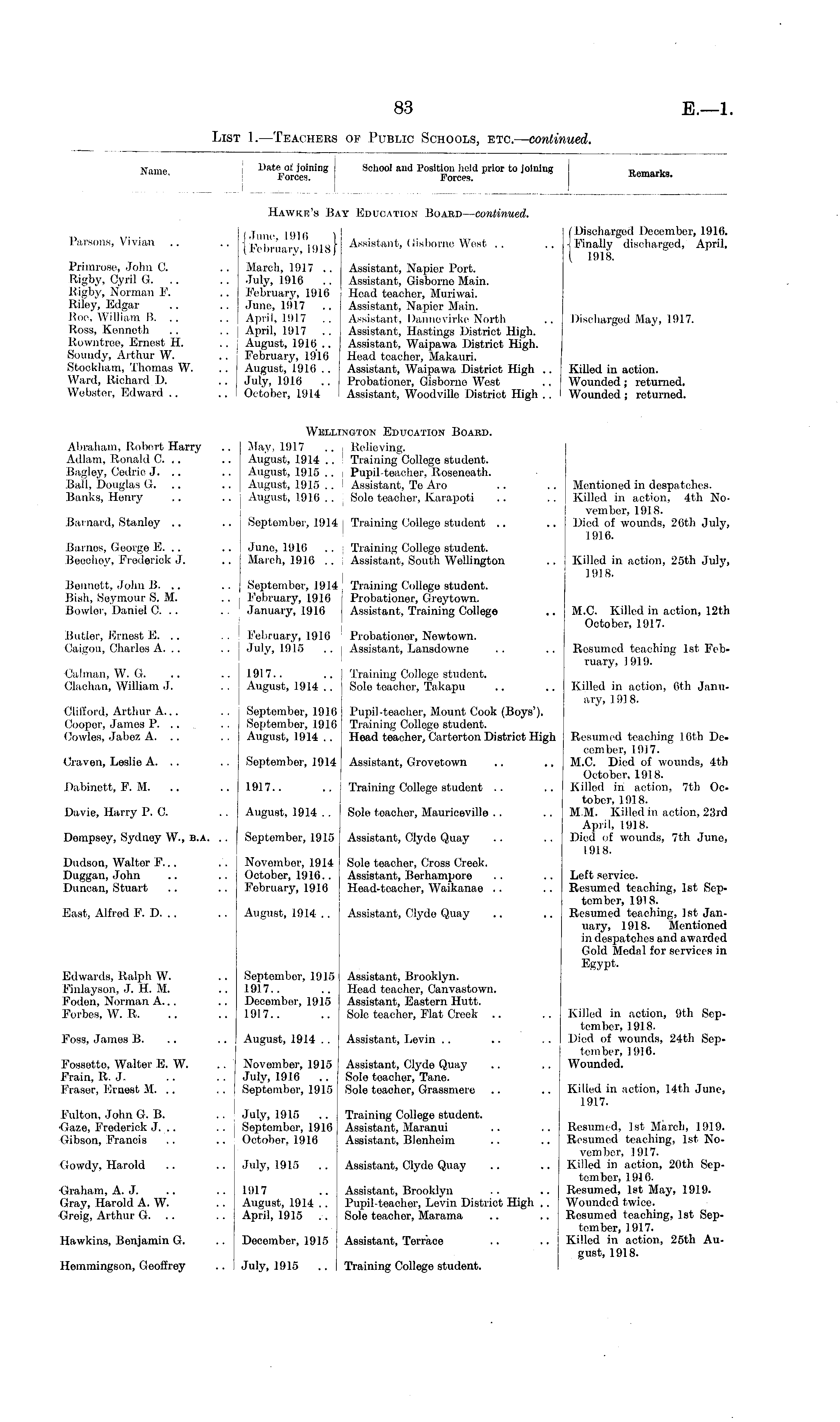 Name, Date of joining School and Position held prior to joining Forces. Forces. Remarks. Hawke's Bay Education Board— continued. Parsons, Vivian Primrose, John C. Rigby, Cyril G. .. Rigby, Norman F. Riley, Edgar Roe, William B. .. Ross, Kenneth Rowntree, Ernest H. Soundy, Arthur W. Stockham, Thomas W. Ward, Richard D. Webster, Edward (June, 1916 1 . • , , ,,. , ... , (February, 1918/ ■ A « stant > Gbsbome West . . March, 1917 .. Assistant, Napier Port. July, 1916 .. Assistant, Gisborne Main. February, 1916 Head teacher, Muriwai. June, 19.17 .. Assistant, Napier Minn. April, 1917 .. Assistant, Dannevirke North April, 1917 .. Assistant, Hastings District High. August, 1916 .. Assistant, Waipawa District High. February, 1916 Head teachor, Makauri. August, 1916 .. Assistant, Waipawa District High .. July, 1916 .. Probationer, Gisborne Wost I October, 1914 Assistant, Woodville District High .. (Discharged December, 1916. ■i Finally discharged, April, I 1918. Discharged May, 1917. Killed in action. Wounded; returned. I Wounded ; returned. Wellington Education Board. Abraham, Robert Harry Aillam, Ronald C. .. Bagley, Cedric J. .. Ball, Douglas G. Banks, Henry Barnard, Stanley . May, 1917 .. , Believing. August, 1914 .. ' Training College studont. August, 1915 .. i Pupil-teaeher, Roseneath. August, 1915 .. I Assistant, Te Aro August, 1916 .. Solo teacher, Karapoti September, 1914 . Training Collego studont Mentioned in despatches. Killed in action, 4th November, 1918. Died of wounds, 20th July, 1910. Barnes, George E. .. Beeohey, Frederick J. June, 1916 .. Training College student. . March, 1916 .. i Assistant, South Wellington Killed in action, 25th July, J 918. Bonnott, John B. .. Bish, Seymour S. M. Bowler, Daniel C. .. September, 1914 Training Collego student. February, 1916 Probationer, Greytown. January, 1916 i Assistant, Training College M.C. Killed in action, 12th October, 1917. Butler, Ernest E. Caigou, Charles A. .. February, 1916 Probationer, Newtown. July, 1915 .. | Assistant, Lansdowne Resumed teaching 1st February, 1919. Caiman, W. G. Clachan, William J. Clifford, Arthur A... Cooper, James P. .. Cowles, Jabez A. Craven, Leslie A. .. Dabinett, F. M. Davie, Harry P. C. Dempsey, Sydney W., b.a. . . 1917.. .. Training College student. August, 1914 .. Sole teacher, Takapu September, 1916 Pupil-teacher, Mount Cook (Boys'). September, 19.16 Training Collogo student. August, .1914 . . Head teacher, Carterton District High September, 1914 Assistant, Grovetown 1917.. .. Training College student .. August, 1914 .. Sole teacher, Mauriceville September, 1915 Assistant, Clyde Quay Killed in action, 6th January, I 91 8. Resumed teaching 10th December, I9J7. M.C. Died of wounds, 4th October, 1918. Killed in action, 7th October, 1918. M.M, Killed in action, 23rd April, 1918. Died of wounds, 7th June, 191 8. Dudson, Walter F... Duggan, John Duncan, Stuart East, Alfred F. D. .. November, 1914 Sole teacher, Cross Creek. October, 1916.. Assistant, Borhampore February, 19.16 Head-toachor, Waikanae August, 1914 . . Assistant, Clyde Quay Left service. Resumed teaching, 1st September, 1918. Resumed teaching, 1st January, 1918. Mentioned in despatches and awarded Gold Medal for services in Egypt. Edwards, Ralph W. Finlayson, J. H. M. Fodon, Norman A... Forbes, W. R. Foss, James B. Fossetto, Walter E. W. Frain, R. J. Eraser, Ernest M. .. Septomber, 1915 Assistant, Brooklyn. 191.7.. .. Head teacher, Canvastown. December, 1915 ! Assistant, Eastern Hutt. 1917.. .. Solo teacher, Flat Creek August, 1914 . . Assistant, Levin November, 1915 Assistant, Clyde Quay j July, 1916 .. Solo toacher, Tano. ! September, 1915 Sole teacher, Grassmero Killed in action, 9th September, 1918. Died of wounds, 24th September, 1910. Wounded. Killed in action, 14th June, .1917. Fulton, John G. B. ■Gaze, Frederick J. .. Gibson, Francis Gowdy, Harold Graham, A. J. Gray, Harold A. W. Groig, Arthur G. .. Hawkins, Bonjamin G. July, 1915 .. Training Colloge student. September, 1916 Assistant, Maranui October, 1916 j Assistant, Blonheim July, 1915 .. Assistant, Clyde Quay 1917 .. Assistant, Brooklyn August, 19.14 .. Pupil-teacher, Levin District High .. April, 1915 .. Sole teacher, Marama December, 1915 Assistant, Terrace Resumed, 1st March, 19.19. Resumed teaching, 1st Novembor, 1917. Killed in action, 20th September, 1 916. Resumed, 1st May, 1919. Wounded twice. Resumed teaching, 1st September, 1917. Killed in action, 25th August, 1918. Hemmingson, Geoffrey July, 1915 .. Training College student.