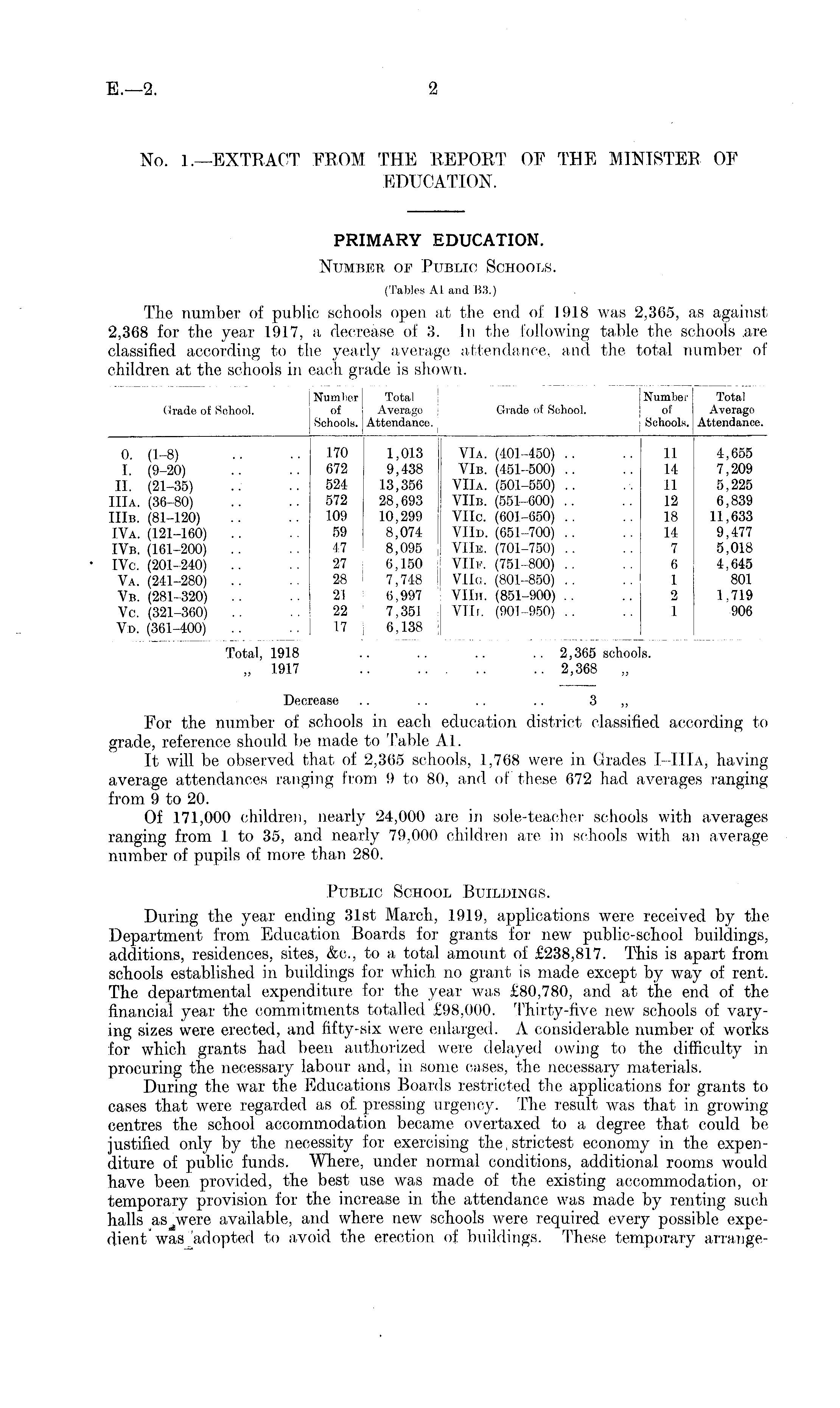 No. I.—EXTRACT FEOM THE REPORT OF THE MINISTER OF EDUCATION. PRIMARY EDUCATION. Number of Public Schools. (Tables Al and 83.) The number of public schools open at the end of 1918 was 2,365, as against 2,368 for the year 1917, a decrease of 3. In the following table the schools .are classified according to the yearly average attendance, and the total number, of children at the schools in each grade is shown.