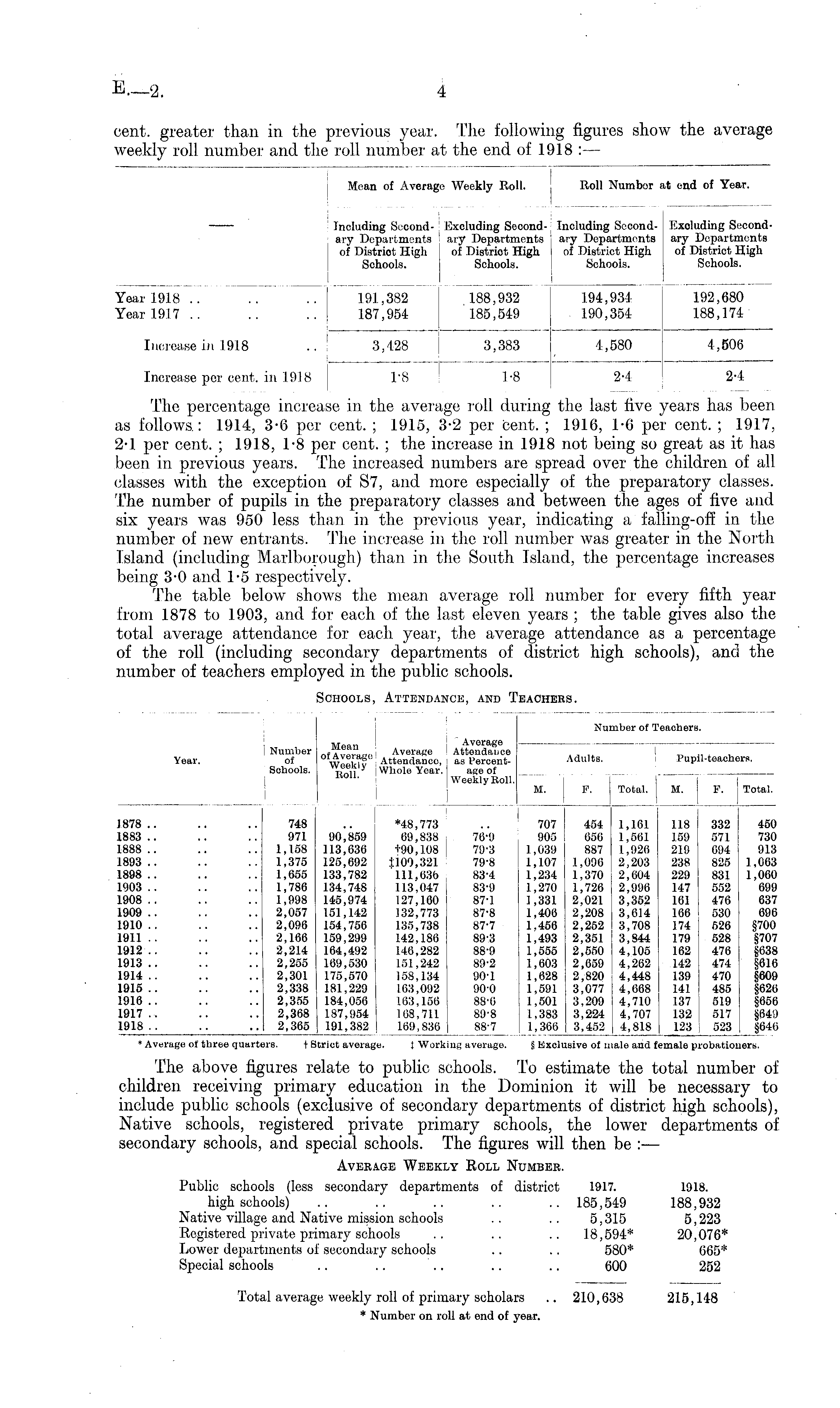 The percentage increase in the average roll during the last five years has been as follows: 1914, 3-6 per cent. ; 1915, 3-2 per cent. ; 1916, 1-6 per cent. ; 1917, 2-1 per cent. ; 1918, 1-8 per cent. ; the increase in 1918 not being so great as it has been in previous years. The increased numbers are spread over the children of all classes with the exception of S7, and more especially of the preparatory classes. The number of pupils in the preparatory classes and between the ages of five and six years was 950 less than in the previous year, indicating a falling-off in the number of new entrants. The increase in the roll number was greater in the North Island (including Marlborough) than in the South Island, the percentage increases being 3-0 and 1-5 respectively. The table below shows the mean average roll number for every fifth year from 1878 to 1903, and for each of the last eleven years ; the table gives also the total average attendance for each year, the average attendance as a percentage of the roll (including secondary departments of district high schools), and the number of teachers employed in the public schools.