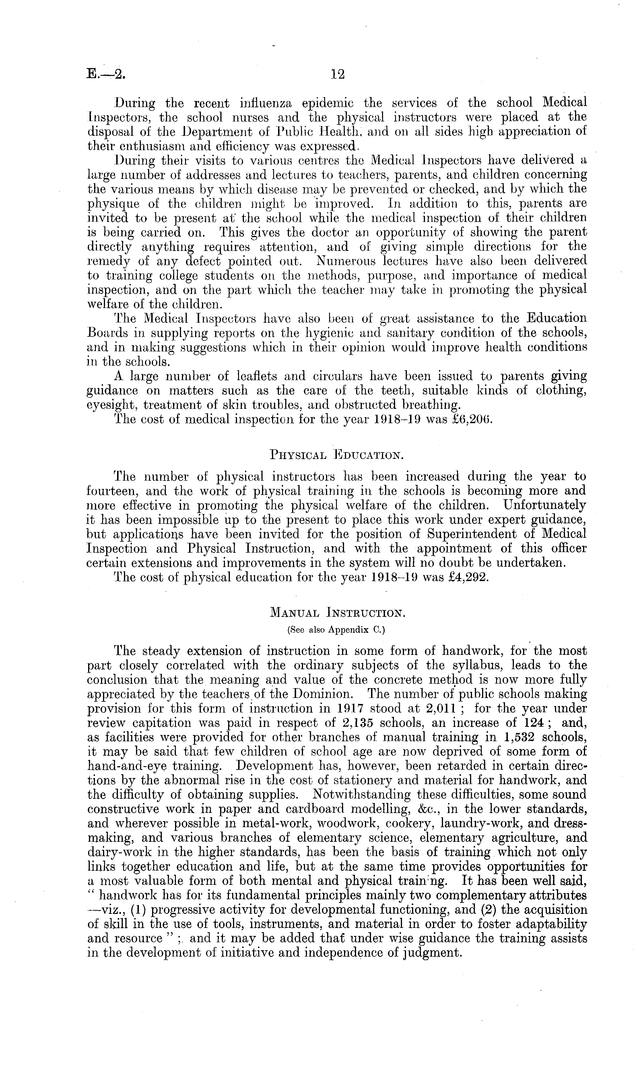 During the recent influenza epidemic the services of the school Medical Inspectors, the school nurses and the physical instructors were placed at the disposal of the Department of Public Health, and on all sides high appreciation of their enthusiasm and efficiency was expressed. During their visits to various centres the Medical Inspectors have delivered a large number of addresses and lectures to teachers, parents, and children concerning the various means by which disease may be prevented or checked, and by which the physique of the children might be improved. In addition to this, parents are invited to be present at" the school while the medical inspection of their children is being carried on. This gives the doctor an opportunity of showing the parent directly anything requires attention, and of giving simple directions for the remedy of any defect pointed out. Numerous lectures have also been delivered to training college students on the methods, purpose, and importance of medical inspection, and on the part which the teacher may take in promoting the physical welfare of the children. The Medical Inspectors have also been of great assistance to the Education Boards in supplying reports on the hygienic and sanitary condition of the schools, and in making suggestions which in their opinion would improve health conditions in the schools. A large number of leaflets and circulars have been issued to parents giving guidance on matters such as the care of the teeth, suitable kinds of clothing, eyesight, treatment of skin troubles, and obstructed breathing. The cost of medical inspection for the year 1918-19 was £6,206. Physical Education. The number of physical instructors has been increased during the year to fourteen, and the work of physical training in the schools is becoming more and more effective in promoting the physical welfare of the children. Unfortunately it has been impossible up to the present to place this work under expert guidance, but applications have been invited for the position of Superintendent of Medical Inspection and Physical Instruction, and with the appointment of this officer certain extensions and improvements in the system will no doubt be undertaken. The cost of physical education for the year 1918-19 was £4,292. Manual Instruction. (See also Appendix C) The steady extension of instruction in some form of handwork, for the most part closely correlated with the ordinary subjects of the syllabus, leads to the conclusion that the meaning and value of the concrete method is now more fully appreciated by the teachers.of the Dominion. The number of public schools making provision for this form of instruction in 1917 stood at 2,011 ; for the year under review capitation was paid in respect of 2,135 schools, an increase of 124 ; and, as facilities were provided for other branches of manual training in 1,532 schools, it may be said that few children of school age are now deprived of some form of hand-and-eye training. Development has, however, been retarded in certain directions by the abnormal rise in the cost of stationery and material for handwork, and the difficulty of obtaining supplies. Notwithstanding these difficulties, some sound constructive work in paper and cardboard modelling, &c, in the lower standards, and wherever possible in metal-work, woodwork, cookery, laundry-work, and dressmaking, and various branches of elementary science, elementary agriculture, and dairy-work in the higher standards, has been the basis of training which not only links together education and life, but at the same time provides opportunities for a most valuable form of both mental and physical train ng. It has been well said, " handwork has for its fundamental principles mainly two complementary attributes —viz., (1) progressive activity for developmental functioning, and (2) the acquisition of skill in the use of tools, instruments, and material in order to foster adaptability and resource " ;. and it may be added that under wise guidance the training assists in the development of initiative and independence of judgment.