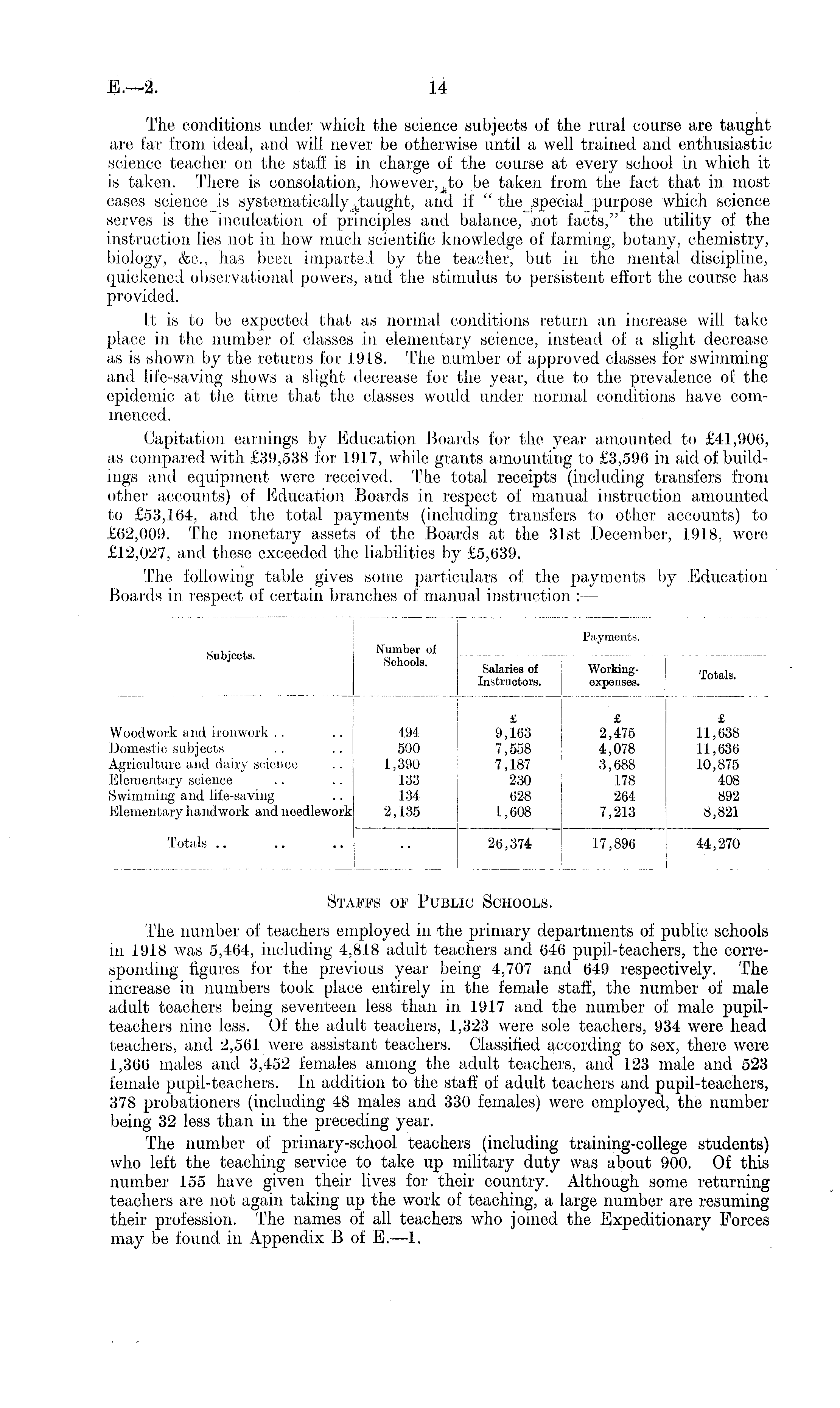 Payments. Subjects. Number of Schools. Salaries of Instructors. Workingexpenses. Totals. . Woodwork and ironwork Domestic subjects Agriculture and dairy science Elementary science Swimming and life-saving Elementary handwork and needlework 494 500 1,390 133 134 2,135 £ 9,163 7,558 7,187 230 628 1,608 £ 2,475 4,078 3,688 178 264 7,213 £ 11,638 11,636 10,875 408 892 8,821 Totals 26,374 17,896 44,270