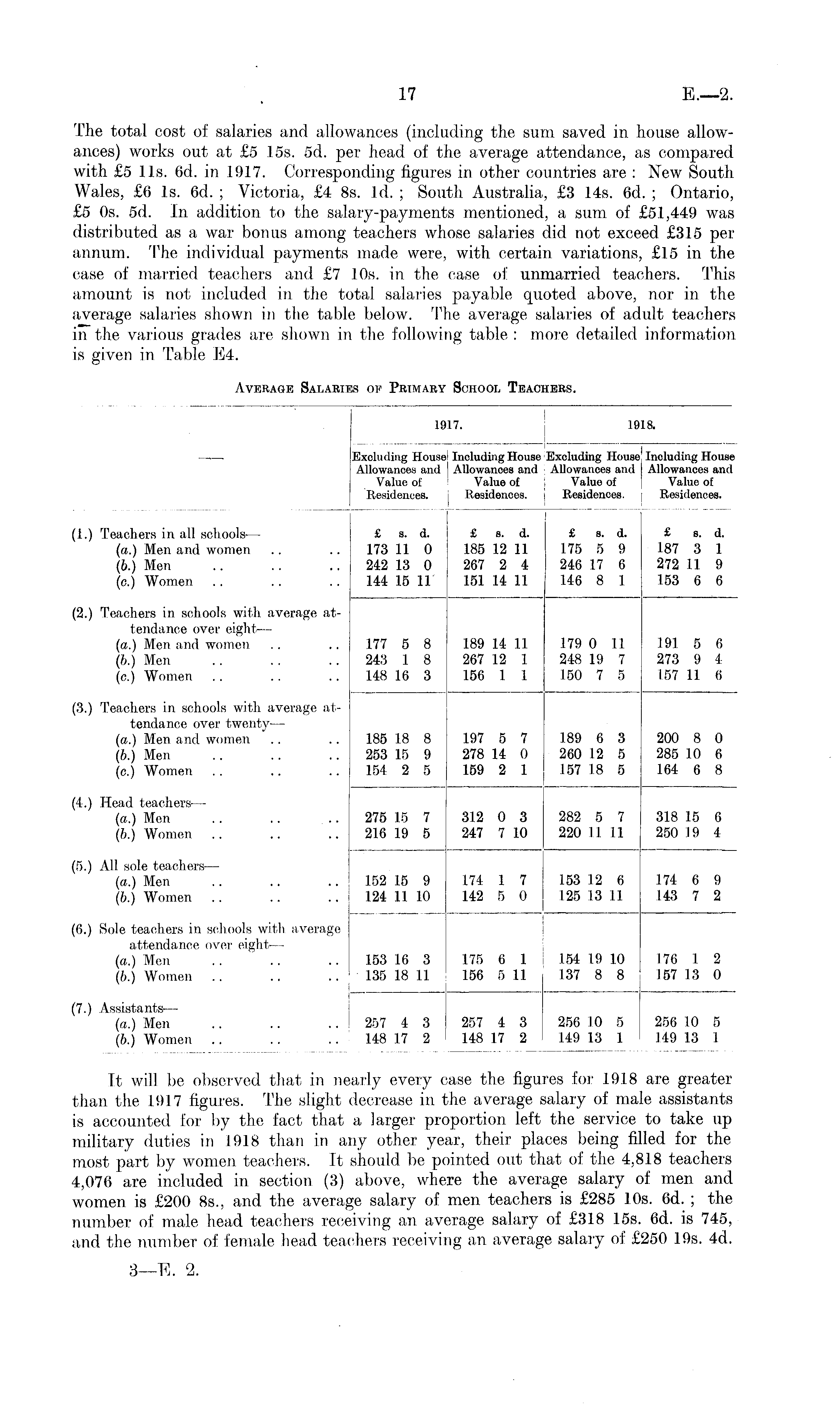 It will be observed that in nearly every case the figures for 1918 are greater than the 1917 figures. The slight decrease in the average salary of male assistants is accounted for by the fact that a larger proportion left the service to take up military duties in 1918 than in any other year, their places being filled for the most part by women teachers. It should be pointed out that of the 4,818 teachers 4,076 are included in section (3) above, where the average salary of men and women is £200 Bs., and the average salary of men teachers is £285 10s. 6d. ; the number of male head teachers receiving an average salary of £318 15s. 6d. is 745, and the number of female head teachers receiving an average salary of £250 19s. 4d.
