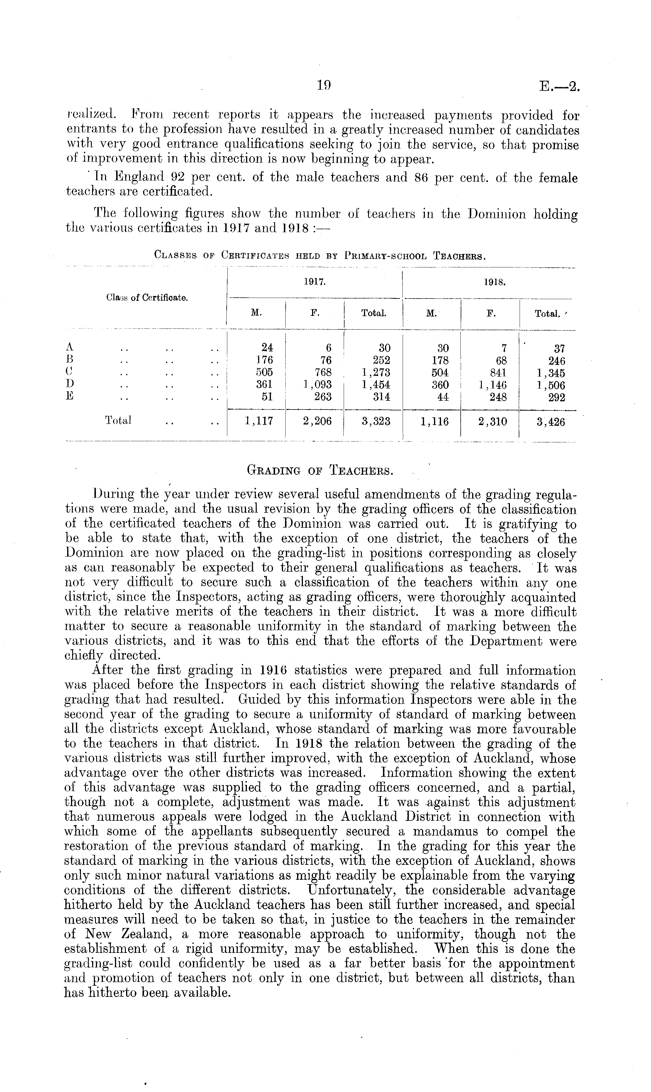 Grading of Teachers. During the year under review several useful amendments of the grading regulations were made, and the usual revision by the grading officers of the classification of the certificated teachers of the Dominion was carried out. It is gratifying to be able to state that, with the exception of one district, the teachers of the Dominion are now placed on the grading-list in positions corresponding as closely as can reasonably be expected to their general qualifications as teachers. It was not very difficult to secure such, a classification of the teachers within any one district, since the Inspectors, acting as grading officers, were thoroughly acquainted with the relative merits of the teachers in. their district. It was a more difficult matter to secure a reasonable uniformity in the standard of marking between the various districts, and it was to this end that the efforts of the Department were chiefly directed. After the first grading in 1916 statistics were prepared and full information was placed before the Inspectors in each district showing the relative standards of grading that had resulted. Guided by this information. Inspectors were able in the second, year of the grading to secure a uniformity of standard of marking between all the districts except Auckland, whose standard of marking was more favourable to the teachers in that district. In 1918 the relation between the grading of the various districts was still further improved, with the exception of Auckland, whose advantage over the other districts was increased. Information showing the extent of this advantage was supplied to the grading officers concerned, and a partial, though not a complete, adjustment was made. It was .against this adjustment that numerous appeals were lodged in the Auckland District in connection with which some of the appellants subsequently secured a mandamus to compel the restoration of the previous standard of marking. In the grading for this year the standard of marking in the various districts, with the exception of Auckland, shows only such minor natural variations as might readily be explainable from the varying conditions of the different districts. Unfortunately, the considerable advantage hitherto held by the Auckland teachers has been still further increased, and special measures will need to be taken so that, in justice to the teachers in the remainder of New Zealand, a more reasonable approach to uniformity, though not the establishment of a rigid uniformity, may be established. When this is done the grading-list could confidently be used as a far better basis 'for the appointment and promotion of teachers not only in one district, but between all districts, than has hitherto been available.