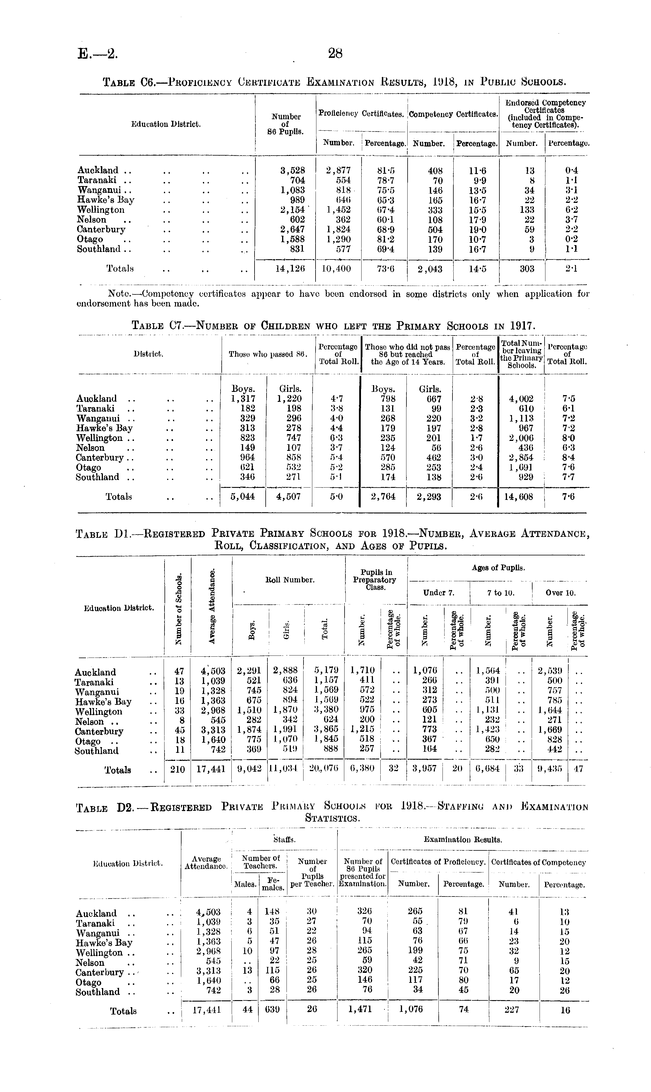 Distriot. Those wlic s passed S6. Percentage of Total Boll. Those who - S6 but i the Age ol did not pass .cached 1 14 Yoars. 1 not pass .died 4 Yoars. 98 Percentage of Total Boll. Total K umber leaving the Primary Schools. Percentage of Total Boll. Auokland .. Taranaki Wanganui .. Hawke's Bay Wellington .. Nelson Canterbury .. Otago Southland .. Boys. 1,317 182 329 313 823 149 964 621 346 Girls. 1,220 198 296 278 747 107 858 532 271 4-7 3-8 4-0 4-4 6-3 3-7 5-4 5-2 5-1 Boys. 798 131 268 179 235 124 570 285 174 Girls. 667 99 220 197 201 56 462 253 138 Girls. 667 99 220 197 201 56 462 253 138 2-8 2-3 3-2 2-8 1-7 2-6 3-0 2-4 2-6 4,002 610 1,113 967 2,006 436 2,854 I ,691 929 7-5 6-1 7-2 7-2 8-0 6-3 8-4 7-0 7-7 Totals 5,044 4,507 2,293 2-6 5-0 2,704 14,608 I 7-6