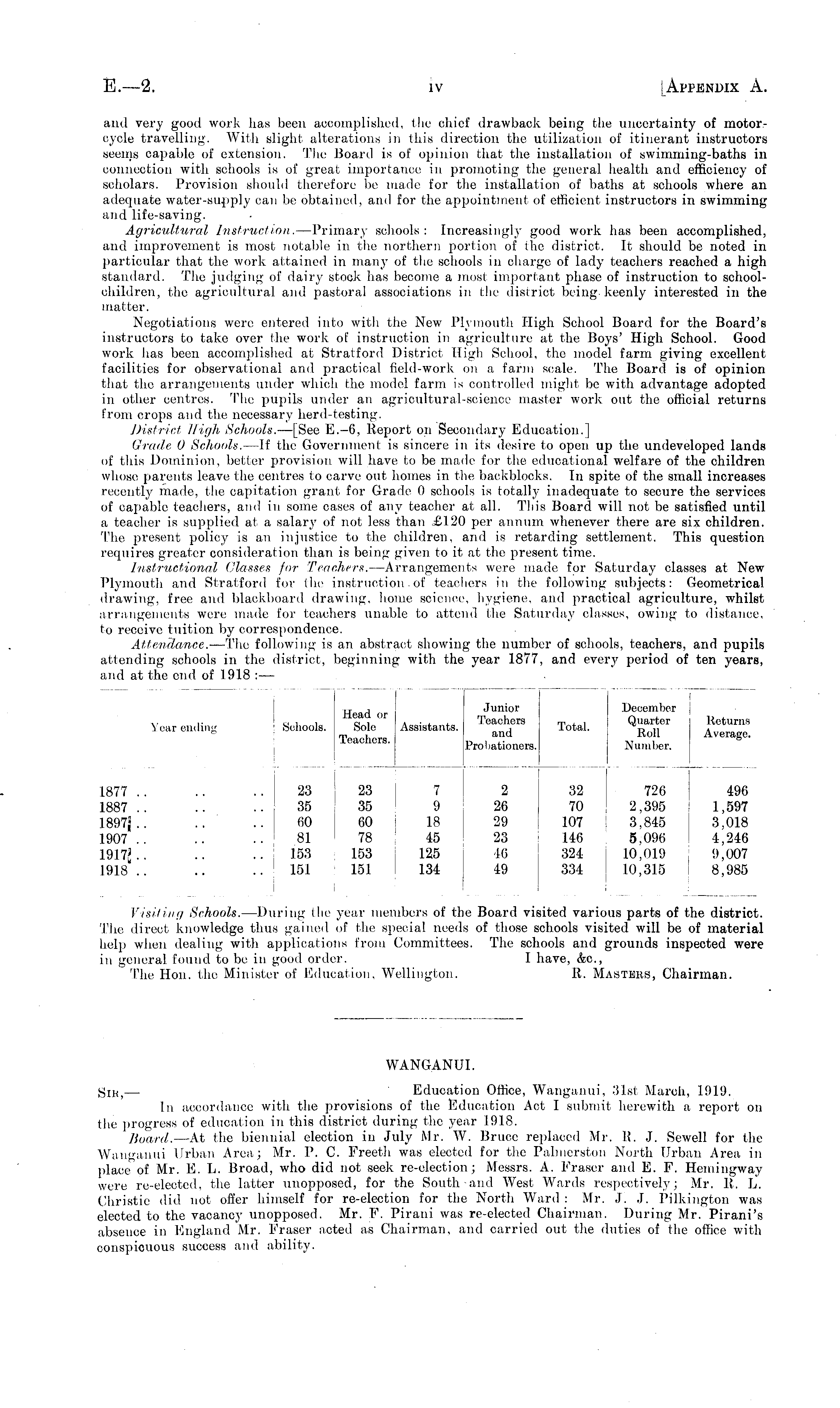 WANGANUI. Sik, — Education Office, Wanganui, 31st March, 1919. In accordance with the provisions of the Education Act I submit herewith a report on the progress of education in this district during the year 1918. Hoard. —At the biennial election in July Mr. W. Bruce replaced Mr. li. J. Sewell for the Wanganui Urban Area; Mr. P. C. Freeth was elected for the Palnierston North Urban Area in place of Mr. E. L. Broad, who did not seek re-election; Messrs. A. Eraser and E. F. Hemingway were re-elected, the latter unopposed, for the South and West Wards respectively; Mr. R. L. Christie did not offer himself for re-election for the North Ward : Mr. J. J. Pilkington was elected to the vacancy unopposed. Mr. F. Pirani was re-elected Chairman. During Mr. Pirani's absence in England Mr. Eraser acted as Chairman, and carried out the duties of the office with conspicuous success and ability.