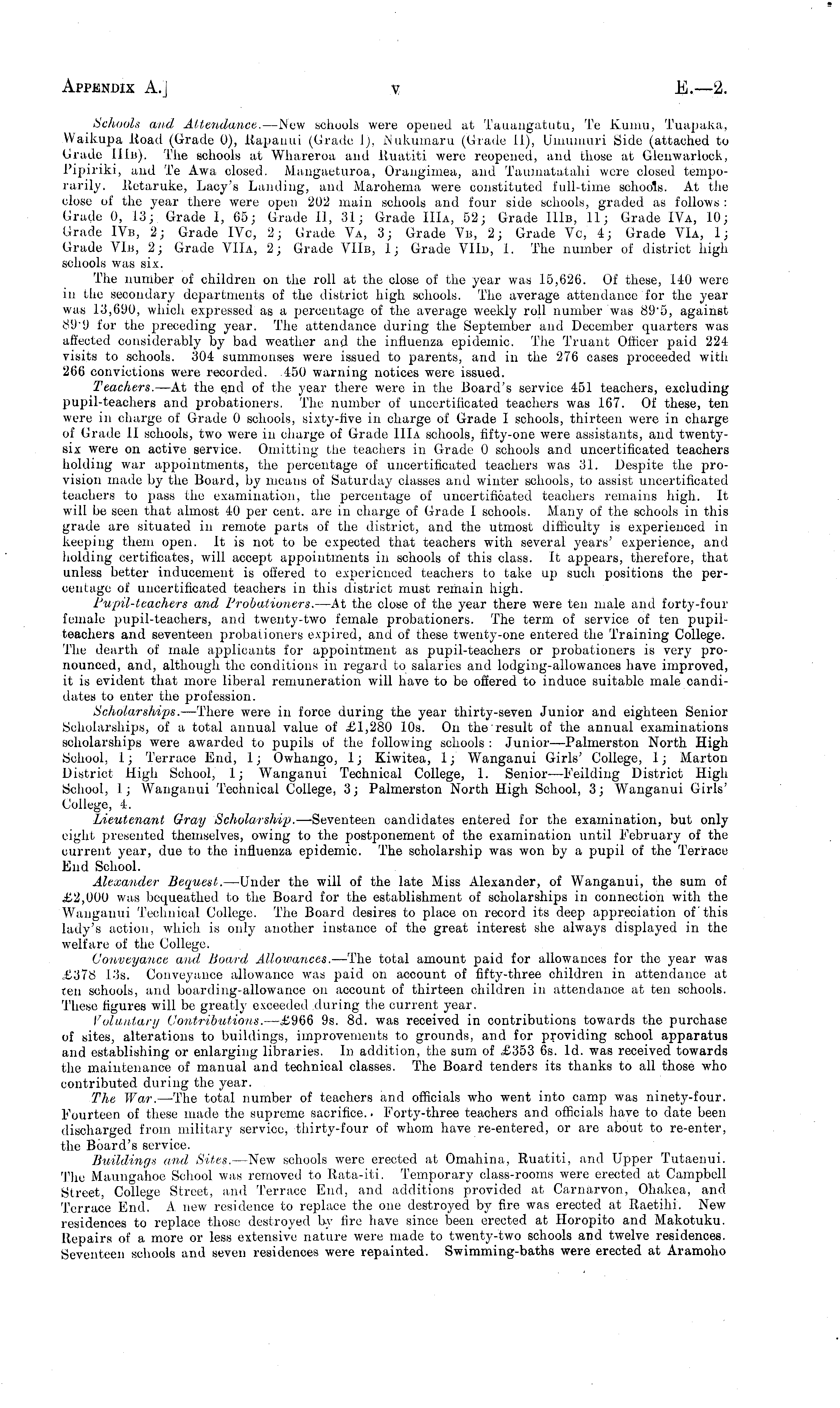 Schools and Attendance. —New schools were opened at Tauangatutu, Te Kurou, Tuapaka, Waikupa Road (Grade 0), llapanui (Grade 1), jNukumaru (Grade 11), Umumuri Side (attached to Grade IIIb). The schools at Whareroa and Ruatiti were reopened, and those at Glenwarlock, Pipiriki, and Te Awa closed. Mangaeturoa, Orangimea, and Taumatatahi were closed temporarily. Retaruke, Lacy's Landing, and Marohema were constituted full-time schools. At the close of the year there were open 202 main schools and four side schools, graded as follows : Grade 0, 13; Grade I, 65; Grade 11, 31; Grade IIIa, 52; Grade 111b, .11; Grade IVa, 10; Grade IVb, 2; Grade IVc, 2; Grade Va, 3; Grade Vb, 2; Grade Vo, 4; Grade VLa, 1; Grade Vln, 2; Grade VUa, 2; Grade VIIb, 1; Grade Vlln, 1. The number of district high schools was six. The number of children on the roll at the close of the year was 15,626. Of these, 140 were in the secondary departments of the district high schools. The average attendance for the year was 13,690, which expressed as a percentage of the average weekly roll number was 895, against 89"9 for the preceding year. The attendance during the September and December quarters was affected considerably by bad weather and the influenza epidemic. The Truant Officer paid 224 visits to schools. 304 summonses were issued to parents, and in the 276 cases proceeded with 266 convictions were recorded. 450 warning notices were issued. Teachers. —At the end of the 3-ear there were in the Board's service 451 teachers, excluding pupil-teachers and probationers. The number of uncertificated teachers was 167. Of these, ten were in charge of Grade 0 schools, sixty-live in charge of Grade 1 schools, thirteen were in charge of Grade II schools, two were in charge of Grade IIIa schools, fifty-one were assistants, and twentysix were on active service. Omitting the teachers in Grade 0 schools and uncertificated teachers holding war appointments, the percentage of uncertificated teachers was 31. Despite the provision made by the Board, by means of Saturday classes and winter schools, to assist uncertificated teachers to pass the examination, the percentage of uncertificated teachers remains high. It will be seen that almost 40 per cent, are in charge of Grade I schools. Many of the schools in this grade are situated in remote parts of the district, and the utmost difficulty is experienced in keeping them open. It is not to be expected that teachers with several years' experience, and holding certificates, will accept appointments in schools of this class. It appears, therefore, that unless better inducement is offered to experienced teachers to take up such positions the percentage of uncertificated teachers in this district must remain high. Pupil-teachers and Probationers. —At the close of the year there were ten male and forty-four female pupil-teachers, and twenty-two female probationers. The term of service of ten pupilteachers and seventeen probationers expired, and of these twenty-one entered the Training College. The dearth of male applicants for appointment as pupil-teachers or probationers is very pronounced, and, although the conditions in regard to salaries and lodging-allowances have improved, it is evident that more liberal remuneration will have to be offered to induce suitable male candidates to enter the profession. Scholarships. —There were in force during the year thirty-seven Junior and eighteen Senior Scholarships, of a total annual value of £1,280 10s. On the result of the annual examinations scholarships were awarded to pupils of the following schools : Junior—Palmerston North High School, 1; Terrace End, 1; Owhango, 1; Kiwitea, 1; Wanganui Girls' College, 1; Marton District High School, 1; Wanganui Technical College, 1. Senior —Feilding District High School, 1; Wanganui Technical College, 3; Palmerston North High School, 3; Wanganui Girls' College, 4. Lieutenant Gray Scholarship. —Seventeen candidates entered for the examination, but only eight presented themselves, owing to the postponement of the examination until February of the current year, due to the influenza epidemic. The scholarship was won by a pupil of the Terrace End School. Alexander Bequest. —Under the will of the late Miss Alexander, of Wanganui, the sum of £2,000 was bequeathed to the Board for the establishment of scholarships in connection with the Wanganui Technical College. The Board desires to place on record its deep appreciation of this lady's action, which is only another instance of the great interest she always displayed in the welfare of the College, Conveyance and Board Allowances. —The total amount paid for allowances for the year was £378 13s. Conveyance allowance was paid on account of fifty-three children in attendance at ten schools, and boarding-allowance on account of thirteen children in attendance at ten schools. These figures will be greatly exceeded .during the current year. Voluntary Contributions. —£966 9s. Bd. was received in contributions towards the purchase of sites, alterations to buildings, improvements to grounds, and for providing school apparatus and establishing or enlarging libraries. In addition, the sum of £353 6s. Id. was received towards the maintenance of manual and technical classes. The Board tenders its thanks to all those who contributed during the year. The War. —The total number of teachers and officials who went into camp was ninety-four. Fourteen of these made the supreme sacrifice.. Forty-three teachers and officials have to date been discharged from military service, thirty-four of whom have re-entered, or arc about to re-enter, the Board's service. Buildings and, Sites. —New schools were erected at Omahina, Ruatiti, and Upper Tutaenui. The Maunga'hoe School was removed to Rata-iti, Temporary class-rooms were erected at Campbell Street, College Street, and Terrace End, and additions provided at Carnarvon, Ohakea, and Terrace End. A new residence to replace the