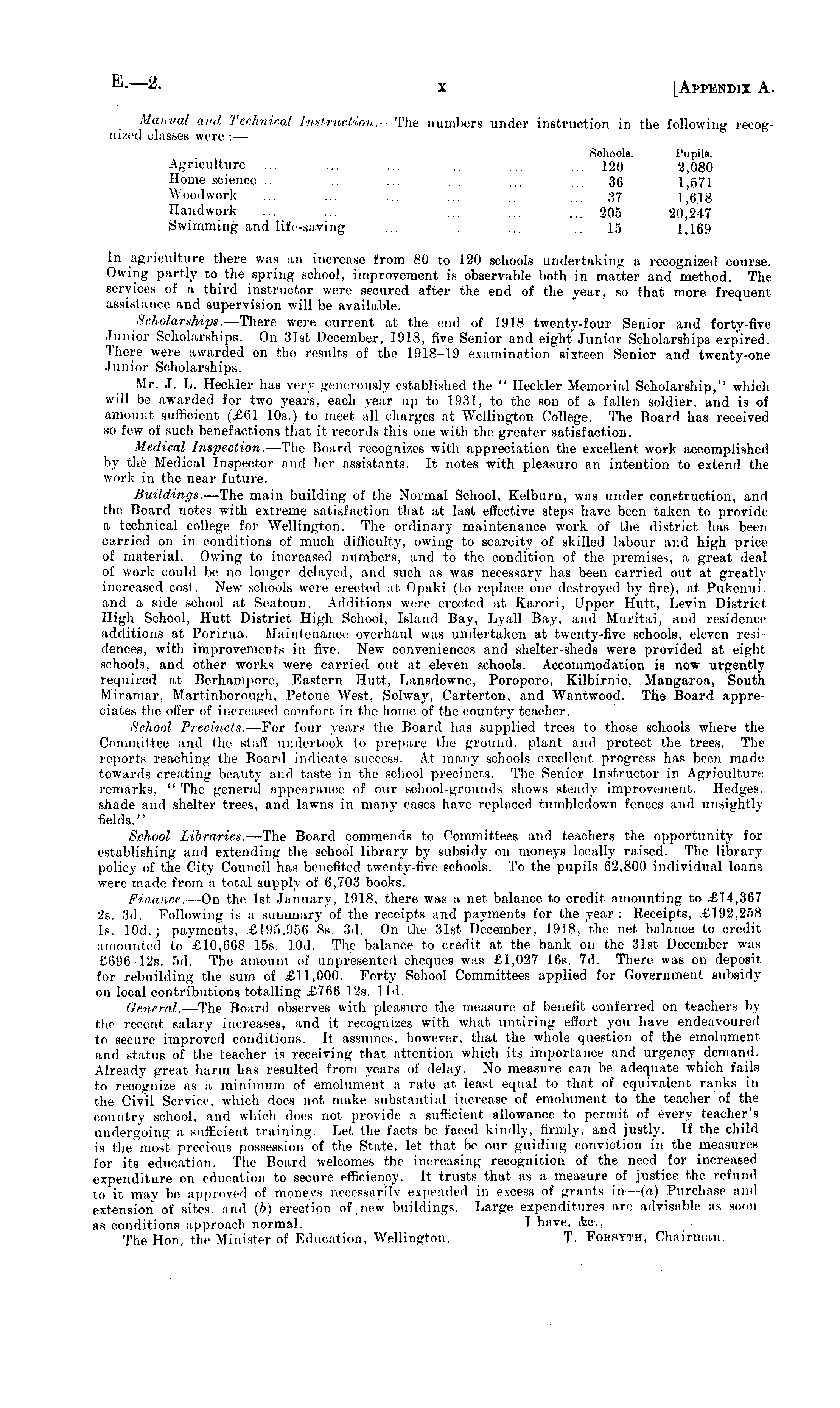 Manual and Technical Instruction. —The numbers under instruction in the following recognized classes were :— Schools. Pupils. Agriculture ... ... ... ... ... ... 120 2,080 Home science ... ... ... ... ... ... 36 1 571 Woodwork ... ... .... ... ... ... 37 1 618 Handwork ... ... ... ... ... 205 20,247 Swimming and life-saving ... ... ... ... 15 1,169 In agriculture there was an increase from 80 to 120 schools undertaking a recognized course. Owing partly to the spring school, improvement is observable both in matter and method. The services of a third instructor were secured after the end of the year, so that more frequent assistance and supervision will be available. Scholarships. —There were current at the end of 1918 twenty-four Senior and forty-five Junior Scholarships. On 31st December, 1918, five Senior and eight Junior Scholarships expired. There were awarded on the results of the 1918-19 examination sixteen Senior and twenty-one Junior Scholarships. Mr. J. L. Heckler has very generously established the " Heckler Memorial Scholarship," which will be awarded for two years, each year up to 1931, to the son of a fallen soldier, and is of amount sufficient (£6l 10s.) to meet all charges at Wellington College. The Board has received so few of such benefactions that it records this one with the greater satisfaction. Medical Inspection. —The Board recognizes with appreciation the excellent work accomplished by the Medical Inspector and her assistants. It notes with pleasure an intention to extend the work in the near future. Buildings. —The main building of the Normal School, Kelburn, was under construction, and the Board notes with extreme satisfaction that at last effective steps have been taken to provide a technical college for Wellington. The ordinary maintenance work of the district has been carried on in conditions of much difficulty, owing to scarcity of skilled labour and high price of material. Owing to increased numbers, and to the condition of the premises, a great deal of work could be no longer delayed, and such as was necessary has been carried out at greatly increased cost. New schools were erected at Opaki (to replace one destroyed by fire), at Pukenui. and a side school at Seatoun. Additions were erected at Karori, Upper Hutt, Levin District High School, Hutt District High School, Island Bay, Lyall Bay, and Muritai, and residence additions at Porirua. Maintenance overhaul was undertaken at twenty-five schools, eleven residences, with improvements in five. New conveniences and shelter-sheds were provided at eight schools, and other works were carried out at eleven schools. Accommodation is now urgently required at Berhampore, Eastern Hutt, Lansdowne, Poroporo, Kilbirnie, Mangaroa, South Miramar, Martinborough, Petone West, Solway, Carterton, and Wantwood. The Board appreciates the offer of increased comfort in the home of the country teacher. School Precincts. —For four years the Board has supplied trees to those schools where the Committee and the staff undertook to prepare the ground, plant and protect the trees. The reports reaching the Board indicate success. At many schools excellent progress has been made towards creating beauty and taste in the school precincts. The Senior Instructor in Agriculture remarks, " The general appearance of our school-grounds shows steady improvement. Hedges, shade and shelter trees, and lawns in many cases have replaced tumbledown fences and unsightly fields." School Libraries. —The Board commends to Committees and teachers the opportunity for establishing and extending the school library by subsidy on moneys locally raised. The library policy of the City Council has benefited twenty-five schools. To the pupils 62.800 individual loans were made from a total supply of 6,703 books. Finance. —On the Ist January, 1918, there was a net balance to credit amounting to £14,367 2s. 3d. Following is a summary of the receipts and payments for the year : Receipts, £192,258 Is. 10d.; payments, £195,956 Bs. 3d. On the 31st December, 1918, the net balance to credit amounted to £10,668 15s. lOd. The balance to credit at the bank on the 31st December was £696 12s. sd. The amount of unpresented cheques was £1,027 16s. 7d. There was on deposit for rebuilding the sum of £11,000. Forty School Committees applied for Government subsidy on local contributions totalling £766 12s. lid. General. —The Board observes with pleasure the measure of benefit conferred on teachers by the recent salary increases, and it recognizes with what untiring effort you have endeavoured to secure improved conditions. It assumes, however, that the whole question of the emolument and status of the teacher is receiving that attention which its importance and urgency demand. Already great harm has resulted from years of delay. No measure can be adequate which fails to recognize as a minimum of emolument a rate at least equal to that of equivalent ranks in the Civil Service, which does not make substantial increase of emolument to the teacher of the country school, and which does not provide a sufficient allowance to permit of every teacher's undergoing a sufficient, training. Let the facts be faced kindly, firmly, and justly. If the child is the most precious possession of the State, let that be our guiding conviction in the measures for its education. The Board welcomes the increasing recognition of the need for increased expenditure on education to secure efficiency. It trusts that as a measure of justice the refund to it may be approved of moneys necessarily expended in excess of grants in— (a) Purchase and extension of sites, and (b) erection of new buildings. Large expenditures are advisable as soon as conditions approach normal. I have, &c, The Hon, the Minister of Education, Wellington, T. Forsyth, Chairman.