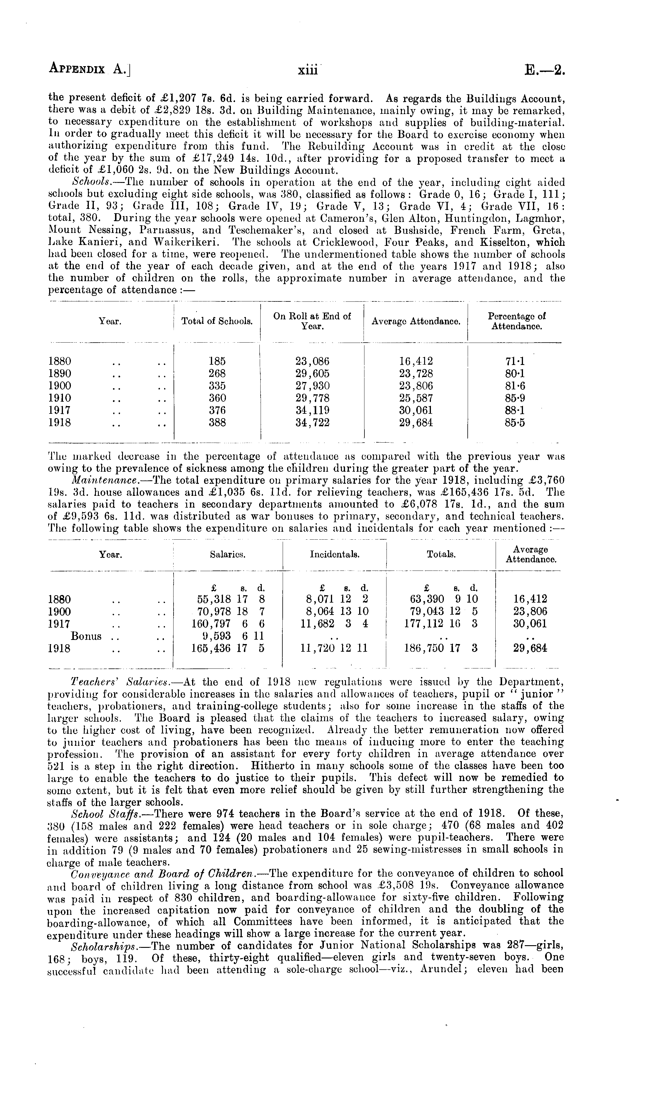 The marked decrease in the percentage of attendance as compared with the previous year was owing to the prevalence of sickness among the children during the greater part of the year. Maintenance. —The total expenditure on primary salaries for the year 1918, including £3,760 19s. 3d. house allowances and £1,035 6s. lid. for relieving teachers, was £165,436 17s. sd. The salaries paid to teachers in secondary departments amounted to £6,078 17s. Id., and the sum of £9,593 6s. lid. was distributed as war bonuses to primary, secondary, and technical teachers. The following table shows the expenditure on salaries and incidentals for each year mentioned : —