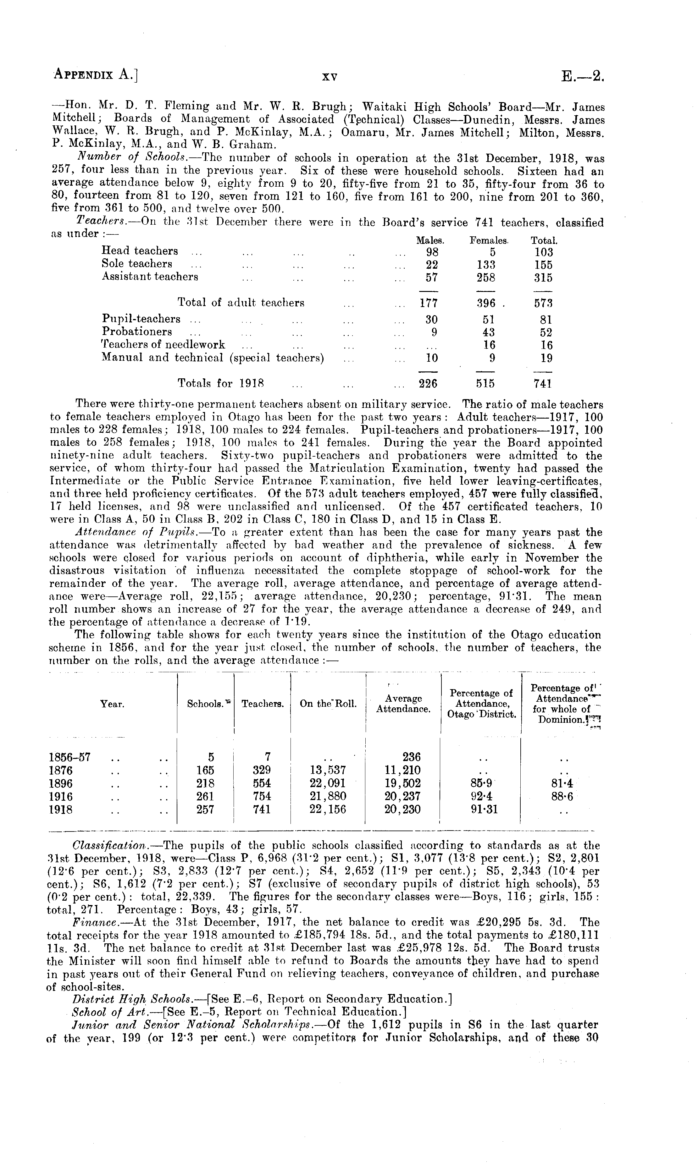 —Hon. Mr. D. T. Fleming and Mr. W. It. Brugh; Waitaki High Schools' Board—Mr. James Mitchell; Boards of Management of Associated (Technical) Classes—Dunedin, Messrs. James Wallace, W. R. Brugh, and P. McKinlay, M.A.; Oamaru, Mr. James Mitchell; Milton, Messrs. P. McKinlay, M.A., and W. B. Graham. Number of Schools. —The number of schools in operation at the 31st December, 1918, was 257, four less than in the previous year. Six of these were household schools. Sixteen had an average attendance below 9, eighty from 9 to 20, fifty-five from 21 to 35, fifty-four from 36 to 80, fourteen from 81 to 120, seven from 121 to 160, five from 161 to 200, nine from 201 to 360, five from 361 to 500, and twelve over 500. Teachers. —On the 31st December there were in the Board's service 741 teachers, classified as under :— .. . _ . ■_ , , Males. Females. Total. Head teachers ... ... ... .. ... 98 5 103 Sole teachers ... ... ... ... ... 22 133 155 Assistant teachers ... ... ... ... 57 258 315 Total of adult teachers ... ... 177 396 . 573 Pupil-teachers ... ... ... 30 51 81 Probationers ... ... ... ... ... 9 43 52 Teachers of needlework ... ... ... 16 16 Manual and technical (special teachers) ... ... 10 9 19 Totals for 1918 ... ... ... 226 515 741 There were thirty-one permanent teachers absent on military service. The ratio of male teachers to female teachers employed in Otago has been for the past two years : Adult teachers —1917, 100 males to 228 females; 1918, 100 males to 224 females. Pupil-teachers and probationers—l9l7, 100 males to 258 females; 1918, 100 males to 241 females. During the year the Board appointed ninety-nine adult teachers. Sixty-two pupil-teachers and probationers were admitted to the service, of whom thirty-four had passed the Matriculation Examination, twenty had passed the Intermediate or the Public Service Entrance Examination, five held lower leaving-certificates, and three held proficiency certificates. Of the 573 adult teachers employed, 457 were fully classifier], 17 held licenses, and 98 were unclassified and unlicensed. Of the 457 certificated teachers, 10 were in Class A, 50 in Class B, 202 in Class C, 180 in Class D, and 15 in Class E. Attendance of Pupils. —To a, greater extent than has been the case for many years past the attendance was detrimentally affected by bad weather and the prevalence of sickness. A few schools were closed for various periods on account of diphtheria, while early in November the disastrous visitation of influenza necessitated the complete stoppage of school-work for the remainder of the year. The average roll, average attendance, and percentage of average attendance were —Average roll, 22,155; average attendance, 20,230; percentage, 91*31. The mean roll number shows an increase of 27 for the year, the average attendance a decrease of 249, and the percentage of attendance a decrease of I*l9. The following table shows for each twenty years since the institution of the Otago education scheme in 1856, and for the year just closed, the number of schools, the number of teachers, the number on the rolls, and the average attendance :—