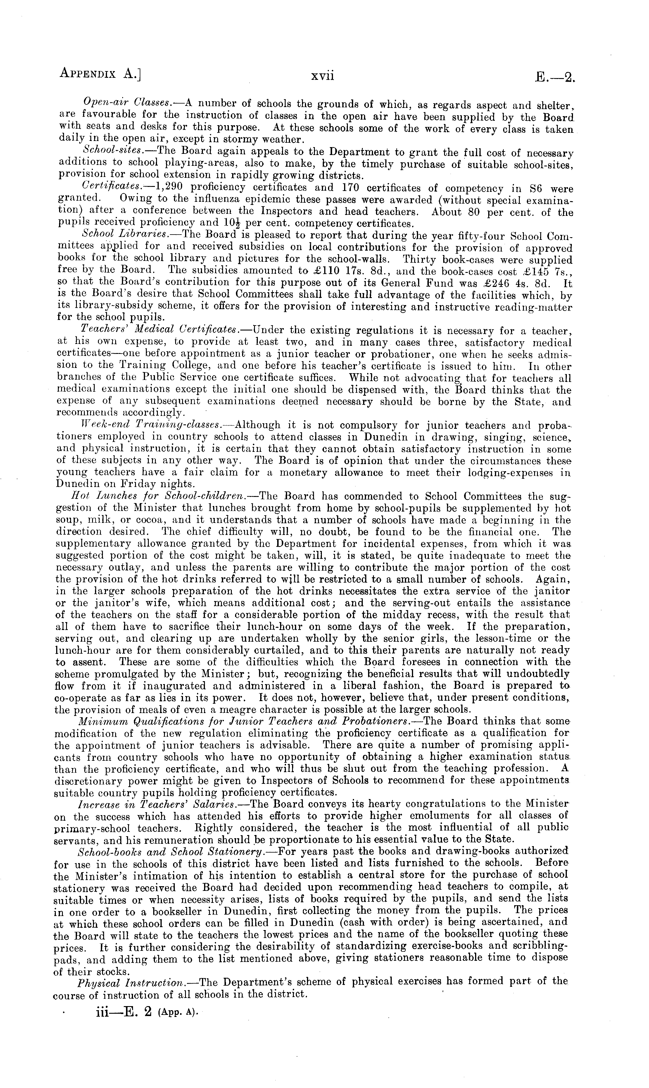 Ope?i-atr Classes.—A number of schools the grounds of which, as regards aspect and shelter, are favourable for the instruction of classes in the open air have been supplied by the Board with seats and desks for this purpose. At these schools some of the work of every class is taken daily in the open air, except in stormy weather. School-sites. —The Board again appeals to the Department to grant the full cost of necessary additions to school playing-areas, also to make, by the timely purchase of suitable school-sites, provision for school extension in rapidly growing districts. Certificates. —1,290 proficiency certificates and 170 certificates of competency in S6 were granted. to the influenza epidemic these passes were awarded (without special examination) after a conference between the Inspectors and head teachers. About 80 per cent, of the pupils received proficiency and 10| per cent, competency certificates. School Libraries. —The Board is pleased to report that during the year fifty-four School Committees applied for and received subsidies on local contributions for the provision of approved books for the school library and pictures for the school-walls. Thirty book-cases were supplied free by the Board. The subsidies amounted to £110 17s. Bd., and the book-cases cost £145 75., so that the Board's contribution for this purpose out of its General Fund was £246 4s. Bd. It is the Board's desire that School Committees shall take full advantage of the facilities which, by its library-subsidy scheme, it offers for the provision of interesting and instructive reading-matter for the school pupils. Teachers' Medical Certificates. —Under the existing regulations it is necessary for a teacher, at his own expense, to provide at least two, and in many cases three, satisfactory medical certificates —one before appointment as a junior teacher or probationer, one when he seeks admission to the Training College, and one before his teacher's certificate is issued to him. In other branches of the Public Service one certificate suffices. While not advocating that for teachers all medical examinations except the initial one should be dispensed with, the IJoard thinks that the expense of any subsequent examinations deemed necessary should be borne by the State, and recommends accordingly. Week-end Training-classes. —Although it is not compulsory for junior teachers and probationers employed in country schools to attend classes in Dunedin in drawing, singing, science, and physical instruction, it is certain that they cannot obtain satisfactory instruction in some of these subjects in any other way. The Board is of opinion that under the circumstances these young teachers have a fair claim for a monetary allowance to meet their lodging-expenses in Dunedin on Friday nights. Hot, Lunches for School-children. —The Board has commended to School Committees the suggestion of the Minister that lunches brought from home by school-pupils be supplemented by hot soup, milk, or cocoa, and it understands that a number of schools have made a beginning in the direction desired. The chief difficulty will, no doubt, be found to be the financial one. The supplementary allowance granted by the Department for incidental expenses, from which it was. suggested portion of the cost might be taken, will, it is stated, be quite inadequate to meet the necessary outlay, and unless the parents are willing to contribute the major portion of the cost the provision of the hot drinks referred to wjll be restricted to a small number of schools. Again, in the larger schools preparation of the hot drinks necessitates the extra service of the janitor or the janitor's wife, which means additional cost; and the serving-out entails the assistance of the teachers on the staff for a considerable portion of the midday recess, with the result that all of them have to sacrifice their lunch-hour on some days of the week. If the preparation, serving out, and clearing up are undertaken wholly by the senior girls, the lesson-time or the lunch-hour are for them considerably curtailed, and to this their parents are naturally not ready to assent. These are some of the difficulties which the Board foresees in connection with the scheme promulgated by the Minister; but, recognizing the beneficial results that will undoubtedly flow from it if inaugurated and administered in a liberal fashion, the Board is prepared to co-operate as far as lies in its power. It does not, however, believe that, under present conditions, the provision of meals of even a meagre character is possible at the larger schools. Minimum Qualifications for Junior Teachers and, Probationers. —The Board thinks that some modification of the new regulation eliminating the proficiency certificate as a qualification for the appointment of junior teachers is advisable. There are quite a number of promising applicants from country schools who have no opportunity of obtaining a higher examination status than the proficiency certificate, and who will thus be shut out from the teaching profession. A discretionary power might be given to Inspectors of Schools to recommend for these appointments suitable country pupils holding proficiency certificates. Increase in Teachers' Salaries. —The Board conveys its hearty congratulations to the Minister on the success which has attended his efforts to provide higher emoluments for all classes of primary-school teachers. Rightly considered, the teacher is the most influential of all public servants, and his remuneration should be proportionate to his essential value to the State. School-books and School Stationery. —For years past the books and drawing-books authorized for use in the schools of this district have been listed and lists furnished to the schools. Before the Minister's intimation of his intention to establish a central store for the purchase of school stationery was received the Board had decided upon recommending head teache