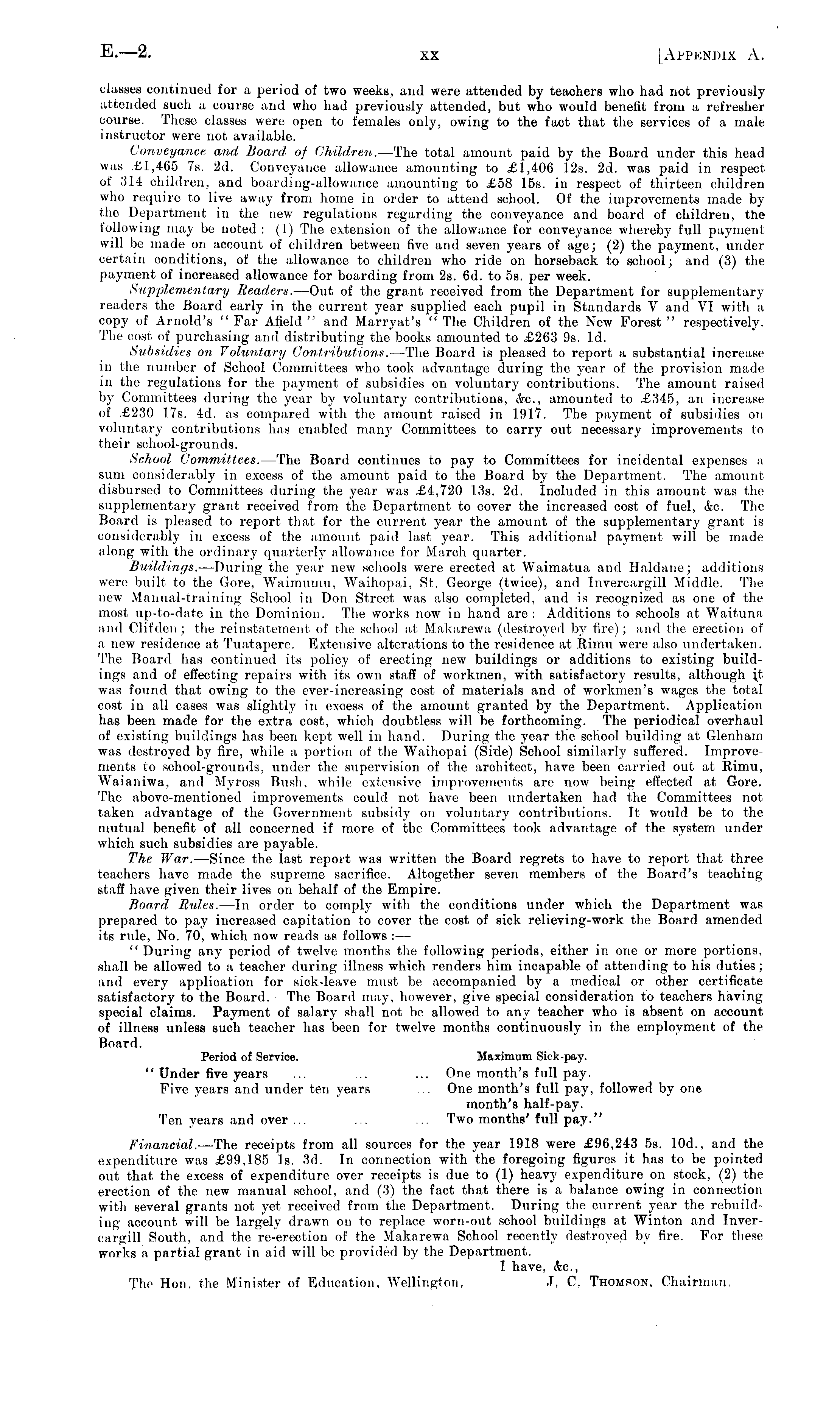 classes continued for a period of two weeks, and were attended by teachers who had not previously attended such a course and who had previously attended, but who would benefit from a refresher course. These classes were open to females only, owing to the fact that the services of a male instructor were not available. Conveyance and Board of Children. —The total amount paid by the Board under this head was £1,465 7s. 2d. Conveyance allowance amounting to £1,406 12s. 2d. was paid in respect of 314 children, and boarding-allowance amounting to £58 15s. in respect of thirteen children who require to live away from home in order to attend school. Of the improvements made by the Department in the new regulations regarding the conveyance and board of children, the following may be noted : (1) The extension of the allowance for conveyance whereby full payment will be made on account of children between five and seven years of age; (2) the payment, under certain conditions, of the allowance to children who ride on horseback to school; and (3) the payment of increased allowance for boarding from 2s. 6d. to ss. per week. Supplementary Readers. —Out of the grant received from the Department for supplementary readers the Board early in the current year supplied each pupil in Standards V and VI with a copy of Arnold's "Far Afield" and Marryat's "The Children of the New Forest" respectively. The cost of purchasing and distributing the books amounted to £263 9s. Id. Subsidies on Voluntary Contributions. —The Board is pleased to report a substantial increase in the number of School Committees who took advantage during the year of the provision made in the regulations for the payment of subsidies on voluntary contributions. The amount raised by Committees during the year by voluntary contributions, &c, amounted to £345, an increase of £230 17s. 4d. as compared with the amount raised in 1917. The payment of subsidies on voluntary contributions has enabled many Committees to carry out necessary improvements to their school-grounds. School Committees. —The Board continues to pay to Committees for incidental expenses a sum considerably in excess of the amount paid to the Board by the Department. The amount disbursed to Committees during the year was £4,720 13s. 2d. Included in this amount was the supplementary grant received from the Department to cover the increased cost of fuel, &c. The Board is pleased to report that for the current year the amount of the supplementary grant is considerably in excess of the amount paid last year. This additional payment will be made along with the ordinary quarterly allowance for March quarter. Buildings. —During the year new schools were erected at Waimatua and Haldane; additions were built to the Gore, Waimumu, Waihopai, St. George (twice), and Invercargill Middle. The new Manual-training School in Don Street was also completed, and is recognized as one of the most, up-to-date in the Dominion. The works now in hand are: Additions to schools at Waituna and Clifden ; the reinstatement of the school at Makarewa (destroyed by fire); and the erection of a new residence at Tuatapere. Extensive alterations to the residence at Rimu were also undertaken. The Board has continued its policy of erecting new buildings or additions to existing buildings and of effecting repairs with its own staff of workmen, with satisfactory results, although it was found that owing to the ever-increasing cost of materials and of workmen's wages the total cost in all cases was slightly in excess of the amount granted by the Department. Application has been made for the extra cost, which doubtless will be forthcoming. The periodical overhaul of existing buildings has been kept well in hand. During the year the school building at Glenham was destroyed by fire, while a portion of the Waihopai (Side) School similarly suffered. Improvements to school-grounds, under the supervision of the architect, have been carried out at Rimu, Waianiwa, and Myross Bush, while extensive improvements are now being effected at Gore. The above-mentioned improvements could not have been undertaken had the Committees not taken advantage of the Government subsidy on voluntary contributions. Tt would be to the mutual benefit of all concerned if more of the Committees took advantage of the system under which such subsidies are payable. The War. —Since the last report was written the Board regrets to have to report that three teachers have made the supreme sacrifice. Altogether seven members of the Board's teaching staff have given their lives on behalf of the Empire. Board Rules. —In order to comply with the conditions under which the Department was prepared to pay increased capitation to cover the cost of sick relieving-work the Board amended its rule, No. 70, which now reads as follows :— " During any period of twelve months the following periods, either in one or more portions, shall be allowed to a teacher during illness which renders him incapable of attending to his duties ; and every application for sick-leave must be accompanied by a medical or other certificate satisfactory to the Board. The Board may, however, give special consideration to teachers having special claims. Payment of salary shall not be allowed to any teacher who is absent on account of illness unless such teacher has been for twelve months continuously in the employment of the Board. Period of Servioe. Maximum Sick-pay. " Under five years ... ... ... One month's full pay. Five years and under ten years ... One month's full pay, followed by ons month's half-pay. Ten years and over ... ... ... Two months' full pay." Financial. —The receipts from all sources for the year 1918 were £96,243 ss. 10d., and the expenditure was £99,185 Is. 3d. In connection with the foregoing figures it has to be pointed out that the excess of expenditure over receipts is due to (1) heavy expenditure on stock, (2) the erection of the new manual school,
