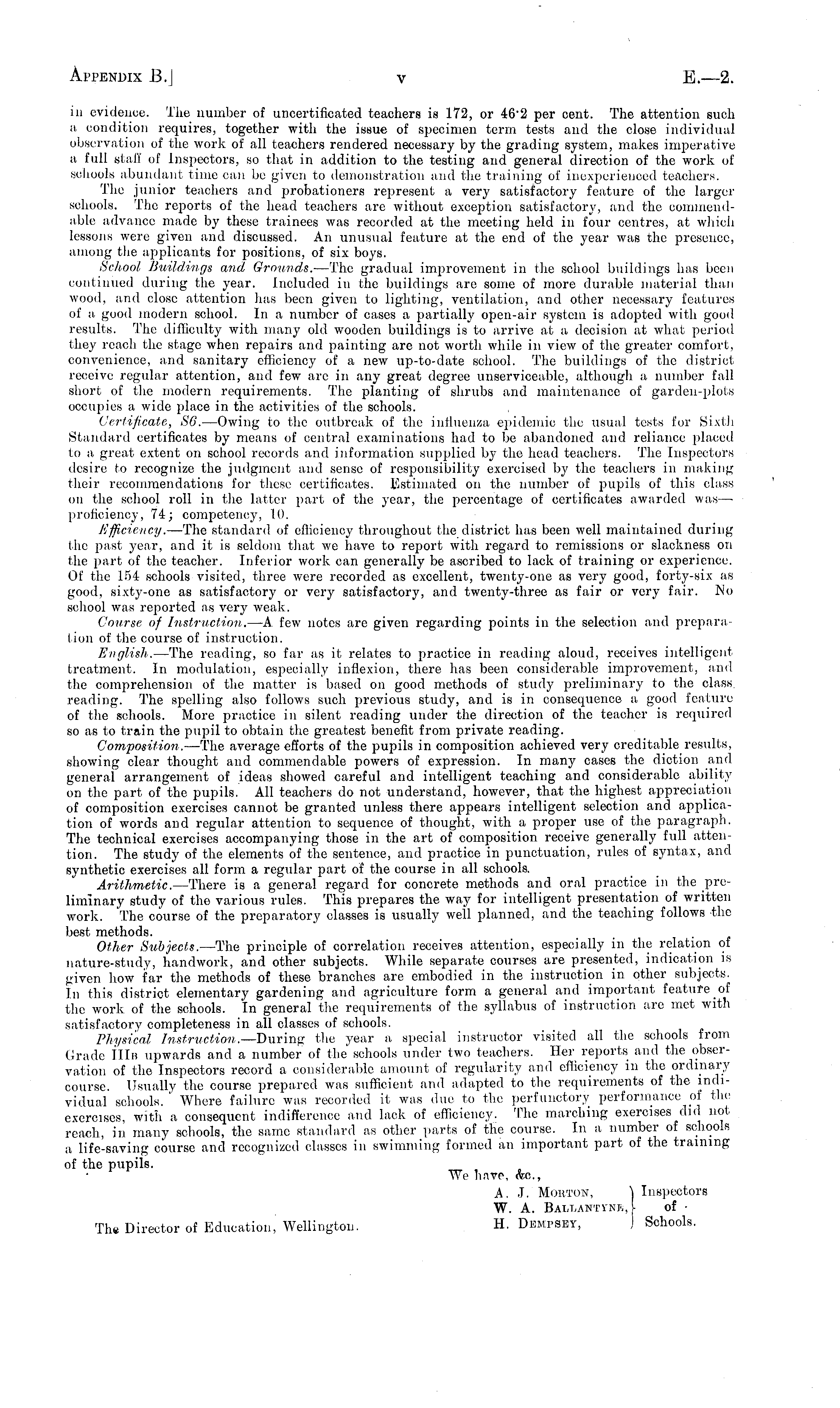 iii evidence. The number of uncertificated teachers is 172, or 46 - 2 per cent. The attention such a condition requires, together with the issue of specimen term tests and the close individual observation of the work of all teachers rendered necessary by the grading system, makes imperative a full stall' of Inspectors, so that in addition to the testing and general direction of the work of schools abundant time can be given to demonstration and the training of inexperienced teachers. The junior teachers and probationers represent a very satisfactory feature of the larger schools. The reports of the head teachers are without exception satisfactory, and the commendable advance made by these trainees was recorded at the meeting held in four centres, at which lessons were given and discussed. An unusual feature at the end of the year was the presence, among the applicants for positions, of six boys. School Buildings and Grounds.- —The gradual improvement in the school buildings has been continued during the year. Included in the buildings are some of more durable material than wood, and close attention has been given to lighting, ventilation, and other necessary features of a, good modern school. In a number of cases a partially open-air system is adopted with good results. The difficulty with many old wooden buildings is to arrive at a decision at what period they reach the stage when repairs and painting are not worth while in view of the greater comfort, convenience, and sanitary efficiency of a new up-to-date school. The buildings of the district receive regular attention, and few arc in any great degree unserviceable, although a number fall short of the modern requirements. The planting of shrubs and maintenance of garden-plots occupies a wide place in the activities of the schools. Certificate, S6. —Owing to the outbreak of the influenza epidemic the usual tests for Sixth Standard certificates by means of central examinations had to be abandoned and reliance placed to a, great extent on school records and information supplied by the head teachers. The Inspectors desire to recognize the judgment and sense of responsibility exercised by the teachers in making their recommendations for these certificates. Estimated on the number of pupils of this class on the school roll in the latter part of the year, the percentage of certificates awarded was —• proficiency, 74; competency, 10. Efficiency. —The standard of efficiency throughout the district has been well maintained during the past year, and it is seldom that we have to report with regard to remissions or slackness on the part of the teacher. Inferior work can generally be ascribed to lack of training or experience. Of the 154 schools visited, three were recorded as excellent, twenty-one as very good, forty-six as good, sixty-one as satisfactory or very satisfactory, and twenty-three as fair or very fair. No school was reported as very weak. Course of Instruction. —A few notes are given regarding points in the selection and preparation of the course of instruction. English. —The reading, so far as it relates to practice in reading aloud, receives intelligent treatment. In modulation, especially inflexion, there has been considerable improvement, and the comprehension of the matter is based on good methods of study preliminary to the class, reading. The spelling also follows such previous study, and is in consequence a good feature of the schools. More practice in silent reading under the direction of the teacher is required so as to train the pupil to obtain the greatest benefit from private reading. Composition, —The average efforts of the pupils in composition achieved very creditable results, showing clear thought and commendable powers of expression. In many cases the diction and. general arrangement of ideas showed careful and intelligent teaching and considerable ability on the part of the pupils. All teachers do not understand, however, that the highest appreciation of composition exercises cannot be granted unless there appears intelligent selection and application of words and regular attention to sequence of thought, with a proper use of the paragraph. The technical exercises accompanying those in the art of composition receive generally full attention. The study of the elements of the sentence, and practice in punctuation, rules of syntax, and synthetic exercises all form a regular part of the course in all schools. Arithmetic. —There is a general regard for concrete methods and oral practice in the preliminary study of the various rules. This prepares the way for intelligent presentation of written work. The course of the preparatory classes is usually well planned, and the teaching follows the best methods. Other Subjects. —The principle of correlation receives attention, especially in the relation of nature-study, handwork, and other subjects. While separate courses are presented, indication is given how far the methods of these branches are embodied in the instruction in other subjects. In this district elementary gardening and agriculture form a general and important feature of the work of the schools. In general the requirements of the syllabus of instruction are met with satisfactory completeness in all classes of schools. Physical Instruction. —During the .year a special instructor visited all the schools from Grade IIIb upwards and a number of the schools under two teachers. Her reports and the observation of the Inspectors record a considerable amount of regularity and efficiency in the ordinary course. Usually the course prepared was sufficient and adapted to the requirements of the individual schools. ' Where failure was recorded it was due to the perfunctory performance of the exercises, with a consequent indifference and lack of efficiency. The marching exercises did not reach, in many schools, the same standard as other parts of the course. In a number of schools a life-saving course and re