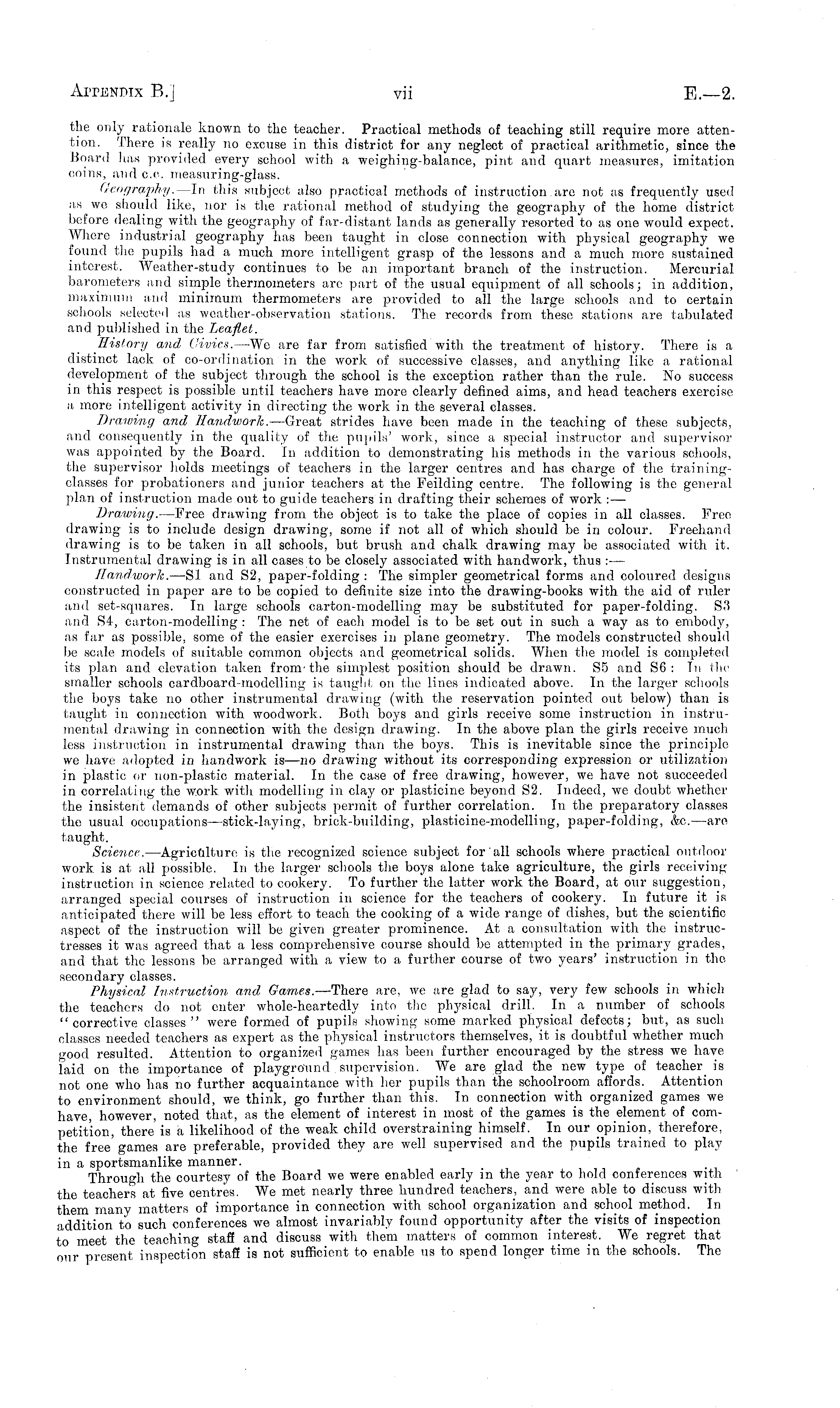 the only rationale known to the teacher. Practical methods of teaching still require more attention. There is really no excuse in this district for any neglect of practical arithmetic, since the Board has provided every school with a weighing-balance, pint and quart measures, imitation coins, and cc. measuring-glass. Geography. —ln this subject also practical methods of instruction arc not as frequently used as we. should like, nor is the rational method of studying the geography of the home district before dealing with the geography of far-distant lands as generally resorted to as one would expect. Where industrial geography has been taught in close connection with physical geography wo found the pupils had a much more intelligent grasp of the lessons and a much more sustained interest. Weather-study continues to be an important brancli of the instruction. Mercurial barometers and simple thermometers are part of the usual equipment of all schools; in addition, maximum and minimum thermometers are provided to all the large schools and to certain schools selected as weather-observation stations. The records from these stations are tabulated and published in the Leaflet. History and Civics. —We are far from satisfied with the treatment of history. There is a distinct lack of co-ordination in the work of successive classes, and anything like a rational development of the subject through the school is the exception rather than the rule. No success in this respect is possible until teachers have more clearly defined aims, and head teachers exercise a more intelligent activity in directing the work in the several classes. Drawing and Handwork.— Great strides have been made in the teaching of these subjects, and consequently in the quality of the pupils' work, since a special instructor and supervisor was appointed by the Board. In addition to demonstrating his methods in the various schools, the supervisor holds meetings of teachers in the larger centres and has charge of the trainingclasses for probationers and junior teachers at the Feilding centre. The following is the general plan of instruction made out to guide teachers in drafting their schemes of work :— Drawing. —Free drawing from the object is to take the place of copies in all classes. Free drawing is to include design drawing, some if not all of which should be in colour. Freehand drawing is to be taken in all schools, but brush and chalk drawing may be associated with it. Instrumental drawing is in all cases to be closely associated with handwork, thus : — Handwork. —SI and S2, paper-folding : The simpler geometrical forms and coloured designs constructed in paper are to be copied to definite size into the drawing-books with the aid of ruler and set-squares. In large schools carton-modelling may be substituted for paper-folding. S3 and S4, carton-modelling : The net of each model is to be set out in such a way as to embody, as far as possible, some of the easier exercises in plane geometry. The models constructed should be scale models of suitable common objects and geometrical solids. AVhen the model is completed its plan and elevation taken from-the simplest position should be drawn. S5 and S6 :Tn the smaller schools cardboard-modelling is taught on the lines indicated above. In the larger schools the boys take no other instrumental drawing (with the reservation pointed out below) than is taught in connection with woodwork. Both boys and girls receive some instruction in instrumental drawing in connection with the design drawing. In the above plan the girls receive much less instruction in instrumental drawing than the boys. This is inevitable since the principle we have adopted in handwork is—no drawing without its corresponding expression or utilization in plastic or non-plastic material. In the case of free drawing, however, we have not succeeded in correlating the work with modelling in clay or plasticine beyond S2. Indeed, we doubt whether the insistent demands of other subjects permit of further correlation. In the preparatory classes the usual occupations —stick-laying, brick-building, plasticine-modelling, paper-folding, &c— arc taught. Science, —Agriculture is the recognized science subject for all schools where practical outdoor work is at all possible. In the larger schools the boys alone take agriculture, the girls receiving instruction in science related to cookery. To further the latter work the Board, at our suggestion, arranged special courses of instruction in science for the teachers of cookery. In future it is anticipated there will be less effort to teach the cooking of a wide range of dishes, but the scientific aspect of the instruction will be given greater prominence. At a consultation with the instructresses it was agreed that a less comprehensive course should be attempted in the primary grades, and that the lessons be arranged with a view to a further course of two years' instruction in the secondary classes. Physical Instruction and Games. —There are, we are glad to say, very few schools in which the teachers do not enter whole-heartedly into the physical drill. In a number of schools "corrective classes" were formed of pupils showing some marked physical defects; but, as such classes needed teachers as expert as the physical instructors themselves, it is doubtful whether much good resulted. Attention to organized games has been further encouraged by the stress we have laid on the importance of playground supervision. We are glad the new type of teacher_ is not one who has no further acquaintance with her pupils than the schoolroom affords. Attention to environment should, we think, go further than this. In connection with organized games we have, however, noted that, as the element of interest in most of the games is the element of competition, there is a likelihood of the weak child overstraining himself. In our opinion, therefore, the free' games are preferable, provided they