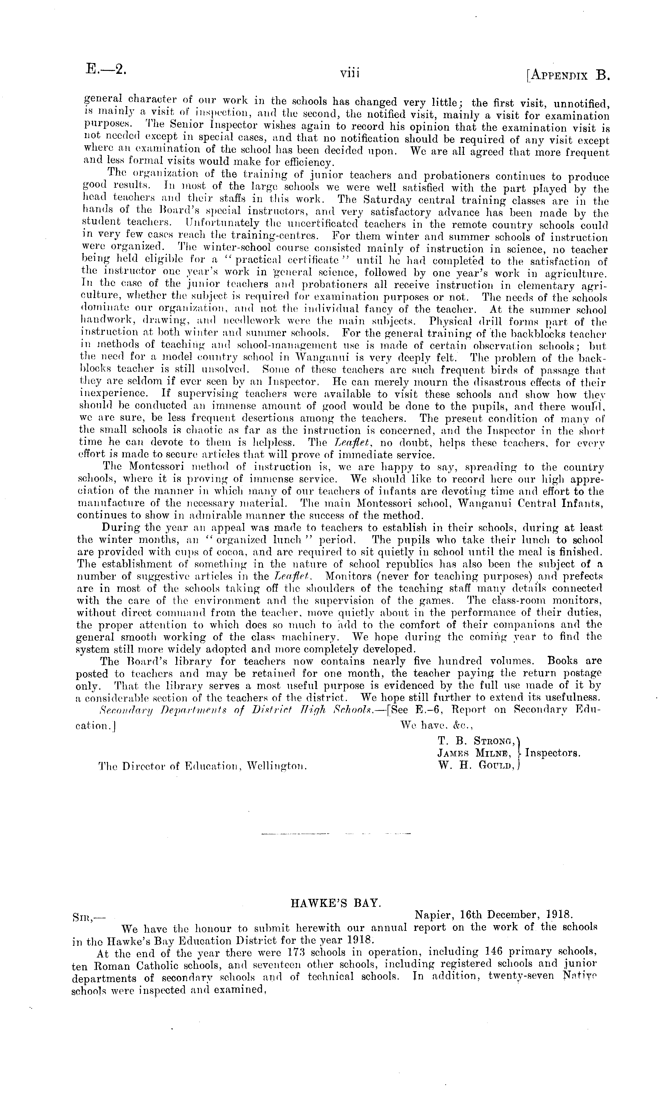 HAWKE'S BAY. g II{ Napier, 16th December, 1918. We have the honour to submit herewith our annual report on the work of the schools in tho Hawke's Bay Education District for the year 1918. At the end of the year there were 173 schools in operation, including 146 primary schools, ten Roman Catholic schools, and seventeen other schools, including registered schools and junior departments of secondary schools and of technical schools. In addition, twenty-seven Natiye schools were inspected and examined,
