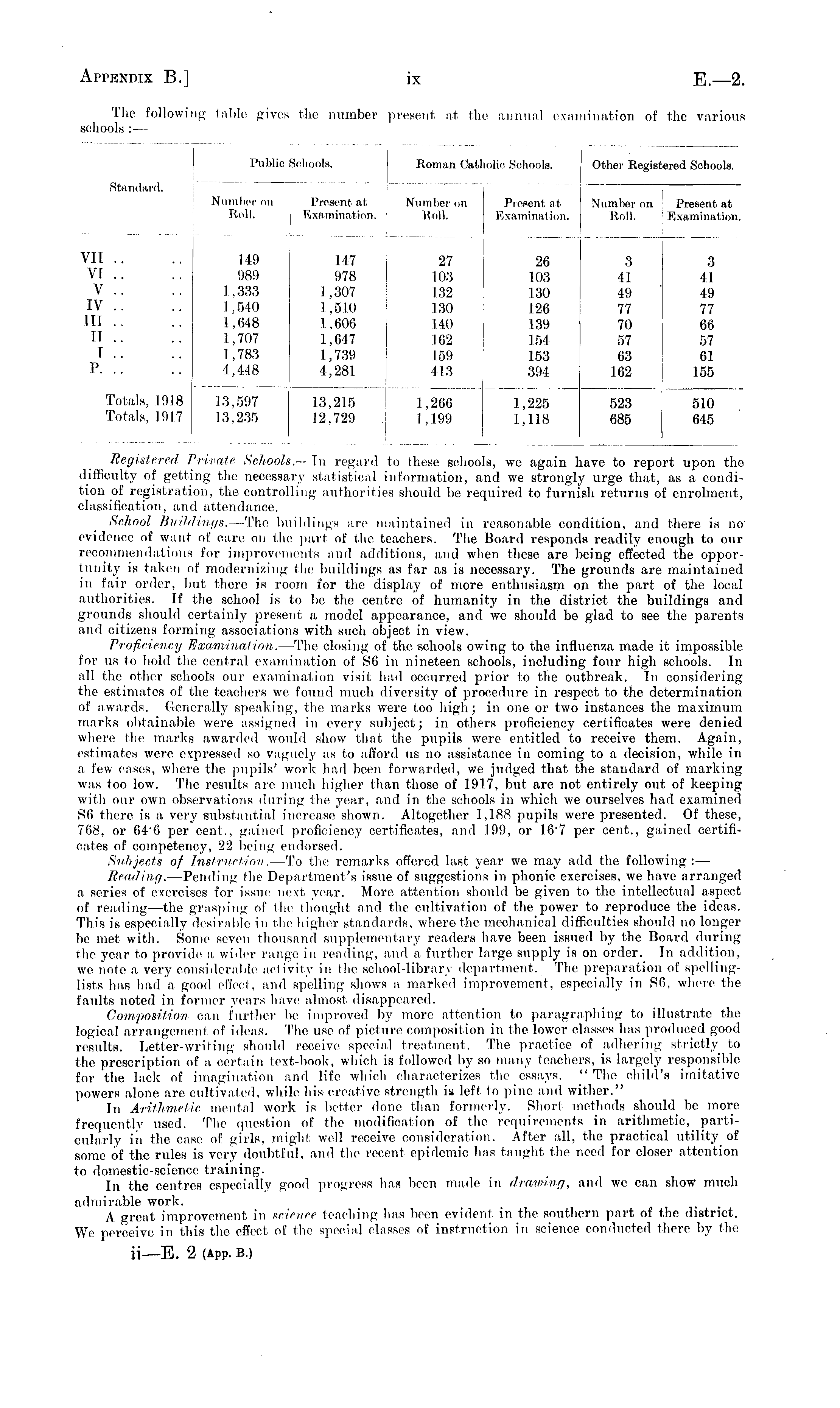 Registered Private Schools. —ln regard to these schools, we again have to report upon the difficulty of getting the necessary statistical information, and we strongly urge that, as a condition of registration, the controlling authorities should be required to furnish returns of enrolment, classification, and attendance. School Buildings. —The buildings are maintained in reasonable condition, and there is noevidence of want of care on the part of the teachers. The Board responds readily enough to our recommendations for improvements and additions, and when these are being effected the opportunity is taken of modernizing the buildings as far as is necessary. The grounds are maintained in fair order, but there is room for the display of more enthusiasm on the part of the local authorities. If the school is to be the centre of humanity in the district the buildings and grounds should certainly present a model appearance, and we should be glad to see the parents and citizens forming associations with such object in view. Proficiency Examination. —The closing of the schools owing to the influenza made it impossible for us to hold the central examination of S6 in nineteen schools, including four high schools. In all the other schools our examination visit had occurred prior to the outbreak. In considering the estimates of the teachers we found much diversity of procedure in respect to the determination of awards. Generally speaking, the marks were too high; in one or two instances the maximum marks obtainable were assigned in every subject; in others proficiency certificates were denied where the marks awarded would show that the pupils were entitled to receive them. Again, estimates were expressed so vaguely as to afford us no assistance in coming to a decision, while in a few cases, where the pupils' work had been forwarded, we judged that the standard of marking was too low. The results are much higher than those of 1917, but are not entirely out of keeping with our own observations during the .year, and in the schools in which we ourselves had examined S6 there is a very substantial increase shown. Altogether 1,188 pupils were presented. Of these, 768, or 646 per cent., gained proficiency certificates, and 199, or 167 per cent., gained certificates of competency, 22 being endorsed. Subjects of Instruction. —To the remarks offered last year we may add the following:— Reading. —Pending the Department's issue of suggestions in phonic exercises, we have arranged a series of exercises for issue next year. More attention should be given to the intellectual aspect of reading—the grasping of the thought and the cultivation of the power to reproduce the ideas. Tin's is especially desirable in the higher standards, where the mechanical difficulties should no longer be met with. Some seven thousand supplementary readers have been issued by the Board during the year to provide a wider range in reading, and a further large supply is on order. In addition, we note a very considerable activity in the school-library department. The preparation of spellinglists has had a good effect, and spelling shows a marked improvement, especially in S6, where the faults noted in former years have almost disappeared. Composition can further be improved by more attention to paragraphing to illustrate the logical arrangement of ideas. The use of picture composition in the lower classes has produced good results. Letter-writing should receive special treatment. The practice of adhering strictly to the prescription of a certain text-book, which is followed by so many teachers, is largely responsible for the lack of imagination and life which characterizes the essays. " The child's imitative powers alone are cultivated, while his creative strength is left to pine and wither." In Arithmetic mental work is better done than formerly. Short methods should be more frequently used. The question of the modification of the requirements in arithmetic, particularly in the case of girls, might well receive consideration. After all, the practical utility of some of the rules is very doubtful, and the recent epidemic has taught the need for closer attention to domestic-science training. In the centres especially good progress has been made in drawing, and we can show much admirable work. A great improvement in science teaching has been evident in the southern part of the district. We perceive in this the effect of the special classes of instruction in science conducted there by the