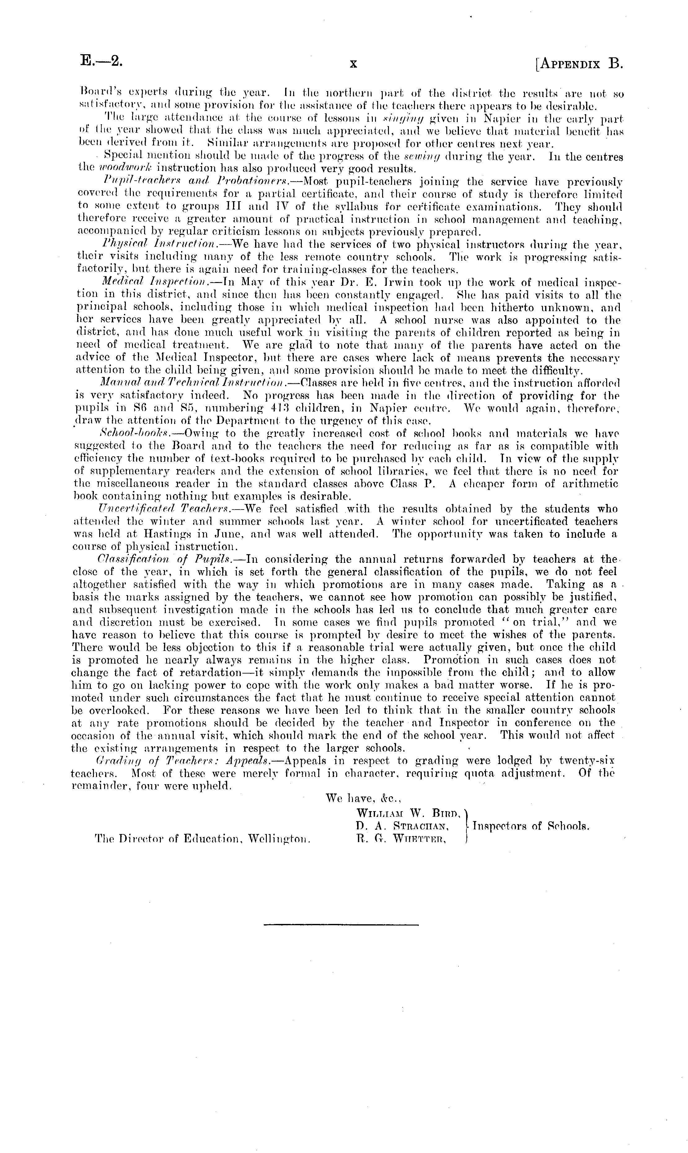 Board's experts during the year. In the northern part of the distriot the results are not so satisfactory, and some provision for the assistance of the teachers there appears to be desirable. The large attendance at the course of lessons in singing given in Napier in the early part of the year showed that the class was much appreciated, anil we believe that material benefit lias been derived from it. Similar arrangements are proposed for other centres next year. Special mention should be made of the progress of the seining during the year. In the centres the woodwork instruction has also produced very good results. Iii pit-teachers and, Probationers. —Most pupil-teachers joining the service have previously covered the requirements for a partial certificate, and their course of study is therefore limited to some extent to groups 111 and IV of the syllabus for certificate examinations. They should therefore receive a greater amount of practical instruction in school management and teaching, accompanied by regular criticism lessons on subjects previously prepared. Physical Instruction. —We have had the services of two physical instructors during the year, their visits including many of the less remote country schools. The work is progressing satisfactorily, but there is again need for training-classes for the teachers. Medical Inspection, —ln May of this year Dr. E. Irwin took up the work of medical inspection in this district, and since then has been constantly engaged. She has paid visits to all the principal sohools, including those in which medical inspection had been hitherto unknown, and her services have been greatly appreciated by all. A school nurse was also appointed to the district, and has done much useful work in visiting the parents of children reported as being in need of medical treatment. We are glad to note that many of the parents have acted on the advice of the Medical Inspector, but there arc cases where lack of means prevents the necessary attention to the child being given, and some provision should be made to meet the difficulty. Manual and Technical Instruction. —Classes are held in five centres, and the instruction afforded is very satisfactory indeed. No progress has been made in the direction of providing for the pupils in S6 and S5, numbering I I ,'S children, in Napier centre. We would again, therefore, draw the attention of the Department to the urgency of this case. School-books. —Owing to the greatly increased cost of school books and materials we have suggested io the Board and to the teachers the need for reducing as far as is compatible with efficiency the number of text-books required to be purchased by each child. Tn view of the supply of supplementary readers and the extension of school libraries, we feel that there is no need for the miscellaneous reader in the standard classes above Class P. A cheaper form of arithmetic book containing nothing but examples is desirable. Uncertificated, Teachers. —We feel satisfied with the results obtained by the students who attended the winter and summer schools last year. A winter school for uncertificated teachers was held at Hastings in June, and was well attended. The opportunity was taken to include a course of physical instruction. Classification of Pupils. —ln considering the annual returns forwarded by teachers at the close of the year, in which is set forth the general classification of the pupils, we do not feel altogether satisfied with the way in which promotions are in many cases made. Taking as a basis the marks assigned by the teachers, we cannot see how promotion can possibly be justified, and subsequent investigation made in the schools has led us to conclude that much greater care and discretion must be exercised. Tn some cases we find pupils promoted "on trial," and we have reason to believe that this course is prompted by desire to meet the wishes of the parents. There would be less objection to this if a reasonable trial were actually given, but once the child is promoted he nearly always remains in the higher class. Promotion in such cases does not change the fact of retardation—it simply demands the impossible from the child; and to allow him to go on lacking power to cope with the work only makes a bad matter worse. If he is promoted under such circumstances the fact that he must continue to receive special attention cannot be overlooked. For these reasons we have been led to think that in the smaller country schools at any rate promotions should be decided by the teacher and Inspector in conference on the occasion of the annual visit, which should mark the end of the school year. This would not affect the existing arrangements in respect to the larger schools. Grading of Teachers: Appeals. —Appeals in respect to grading were lodged by twenty-six teachers. Most of these were merely formal in character, requiring quota adjustment. Of the remainder, four were upheld. We have, <fee, William W. Bird, ] D. A. Straoiian, [inspectors of Schools. The Director of Education, Wellington. R. G. Wiietteii, )