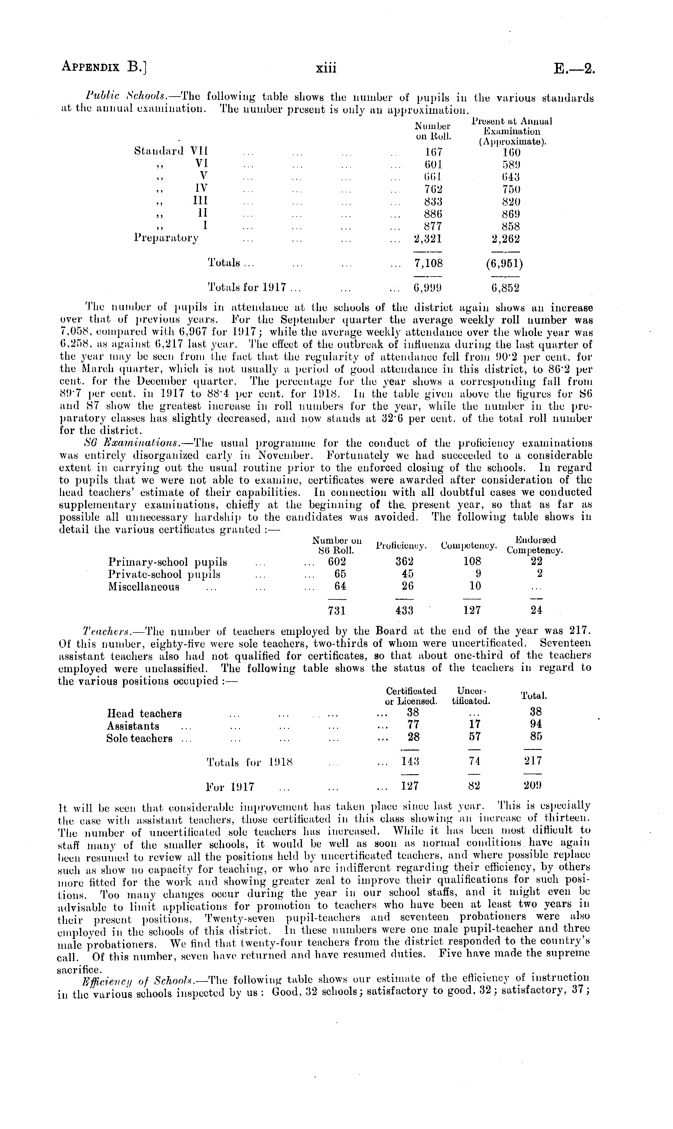 Public Schools. —The following table shows the number of pupils in the various standards at the annual examination. The number present is only an approximation. v, , i „ Present at Annual Number .., . ~ „ ~ ~ Examination on Roll. , . . . . (Approximate). Standard VII ... ... 167 160 VI ... ... ... ... OUT 589 V ... ... ... ... 001 643 IV ... ... ... ... 762 750 111 ... ... ... ... 833 820 II ... ... ... ... 886 869 I ... ... ... ... 877 858 Preparatory ... ... ... ... 2,321 2,262 Totals... ... ... ... 7,108 (6,951) Totals for 1917 ... ... ... 6,999 6,852 The number of pupils in attendance at the schools of the district again shows an increase over that of previous years. For the September quarter the average weekly roll number was 7,058, compared with 6,967 for 1917; while the average weekly attendance over the whole year was 6,258, as against 6,217 last year. The effect of the outbreak of influenza during the last quarter of the year may be seen from the fact that the regularity of attendance fell from 902 per cent, for the March quarter, which is not usually a period of good attendance in this district, to 862 per cent, for the December quarter. The percentage for the year shows a corresponding fall from 89"7 per cent, in 1917 to 884 per cent, for 1918. In the table given above the figures for S6 and S7 show the greatest increase in roll numbers for the year, while the number in the preparatory classes has slightly decreased, and now stands at 326 per cent, of the total roll number for the district. S6 Examinations. —The usual programme for the conduct of the proficiency examinations was entirely disorganized early in November. Fortunately we had succeeded to a considerable extent in carrying out the usual routine prior to the enforced closing of the schools. In regard to pupils that we were not able to examine, certificates were awarded after consideration of the head teachers' estimate of their capabilities. In connection with all doubtful cases we conducted supplementary examinations, chiefly at the beginning of the. present year, so that as far as possible all unnecessary hardship to the candidates was avoided. The following table shows in detail the various certificates granted : — Number on ~ ~ . ~ , Endorsed SIS Roll. Proficiency. Competency. Comi , etenov . Primary-school pupils ... ... 602 362 108 22 Private-school pupils ... ... 65 45 9 2 Miscellaneous ... ... ... 64 26 10 731 433 127 24 Teachers. —The number of teachers employed by the Board at the end of the year was 217. Of this number, eighty-five were sole teachers, two-thirds of whom were uncertificated. Seventeen assistant teachers also had not qualified for certificates, so that about one-third of the teachers employed were unclassified. The following table shows the status of the teachers in regard to the various positions occupied : — Certificated Uneei- ~, . . or Licensed. titieatod. Head teachers ... • ■ • • • • 38 ... 38 Assistants ... ... ... ... ... 77 17 94 Soleteachers ... ... ... ... ■■• 28 57 85 Totals for 1918 ... 143 74 217 For 1917 ... ... ... 127 82 209 It will be seen that considerable improvement has taken place since last year. This is especially the case with assistant teachers, those certificated in this class showing an increase of thirteen. The number of uncertificated sole teachers has increased. While it has been most difficult to staff many of the smaller schools, it would be well as soon as normal conditions have again been resumed to review all the positions held by uncertificated teachers, and where possible replace such as show no capacity for teaching, or who are indifferent regarding their efficiency, by others more fitted for the work and showing greater zeal to improve their qualifications for such positions. Too many changes occur during the year in our school staffs, and it might even be advisable to limit applications for promotion to teachers who have been at least two years in their present positions. Twenty-seven pupil-teachers and seventeen probationers were also employed in the schools of this district. In these numbers were one male pupil-teacher and three male probationers. We find that twenty-four teachers from the district responded to the country's call. Of this number, seven have returned and have resumed duties. Five have made the supreme sacrifice. Efficiency of Schools. —The following table shows our estimate of the efficiency ot instruction in the various schools inspected by us : Good, 32 schools; satisfactory to good, 32; satisfactory, 37;