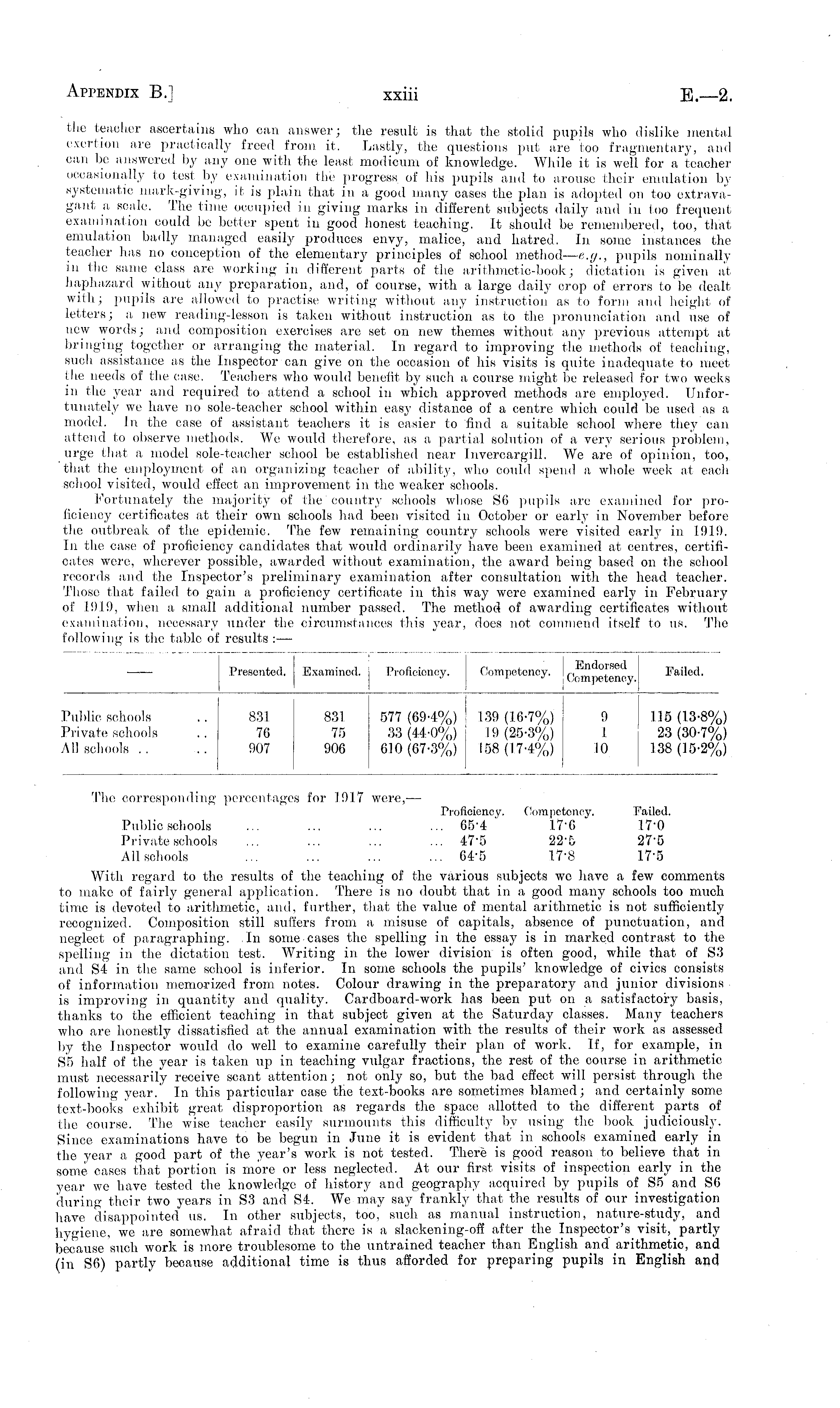 The corresponding percentages for 1917 were, — Proficiency. Competency. Failed. Public schools ... ... ... ... 65-4' 17-6 170 Private schools ... ... ... ... 47*5 225 275 All schools ... ... ... ... 64-5 1.7-8 175 With regard to the results of the teaching of the various subjects wo have a few comments to make of fairly general application. There is no doubt that in a good many schools too much time is devoted to arithmetic, and, further, that the value of mental arithmetic is not sufficiently recognized. Composition still suffers from a misuse of capitals, absence of punctuation, and neglect of paragraphing. In some cases the spelling in the essay is in marked contrast to the spelling in the dictation test. Writing in the lower division" is often good, while that of S3 and S4 in the same school is inferior. In some schools the pupils' knowledge of civics consists of information memorized from notes. Colour drawing in the preparatory and junior divisions is improving in quantity and quality. Cardboard-work has been put on a satisfactory basis, thanks to the efficient teaching in that subject given at the Saturday classes. Many teachers who are honestly dissatisfied at the annual examination with the results of their work as assessed by the Inspector would do well to examine carefully their plan of work. If, for example, in S5 half of the year is taken up in teaching vulgar fractions, the rest of the course in arithmetic must necessarily receive scant attention; not only so, but the bad effect will persist through the following year. In this particular case the text-books are sometimes blamed; and certainly some text-books' exhibit great disproportion as regards the space allotted to the different parts of the course. The wise teacher easily surmounts this difficulty by using the book judiciously. Since examinations have to be begun in June it is evident that in schools examined early in the year a good part of the year's work is not tested. There is good reason to believe that in some cases that portion is more or less neglected. At our first visits of inspection early in the year we have tested the knowledge of history and geography acquired by pupils of S5 and _S6 during their two years in S3 and S4. We may say frankly that the results of our investigation have disappointed us. In other subjects, too, such as manual instruction, nature-study, and hygiene, we are somewhat afraid that there is a slackening-off after the Inspector's visit, _partly because such work is more troublesome to the untrained teacher than English and arithmetic, and (in S6) partly because additional time is thus afforded for preparing pupils in English and