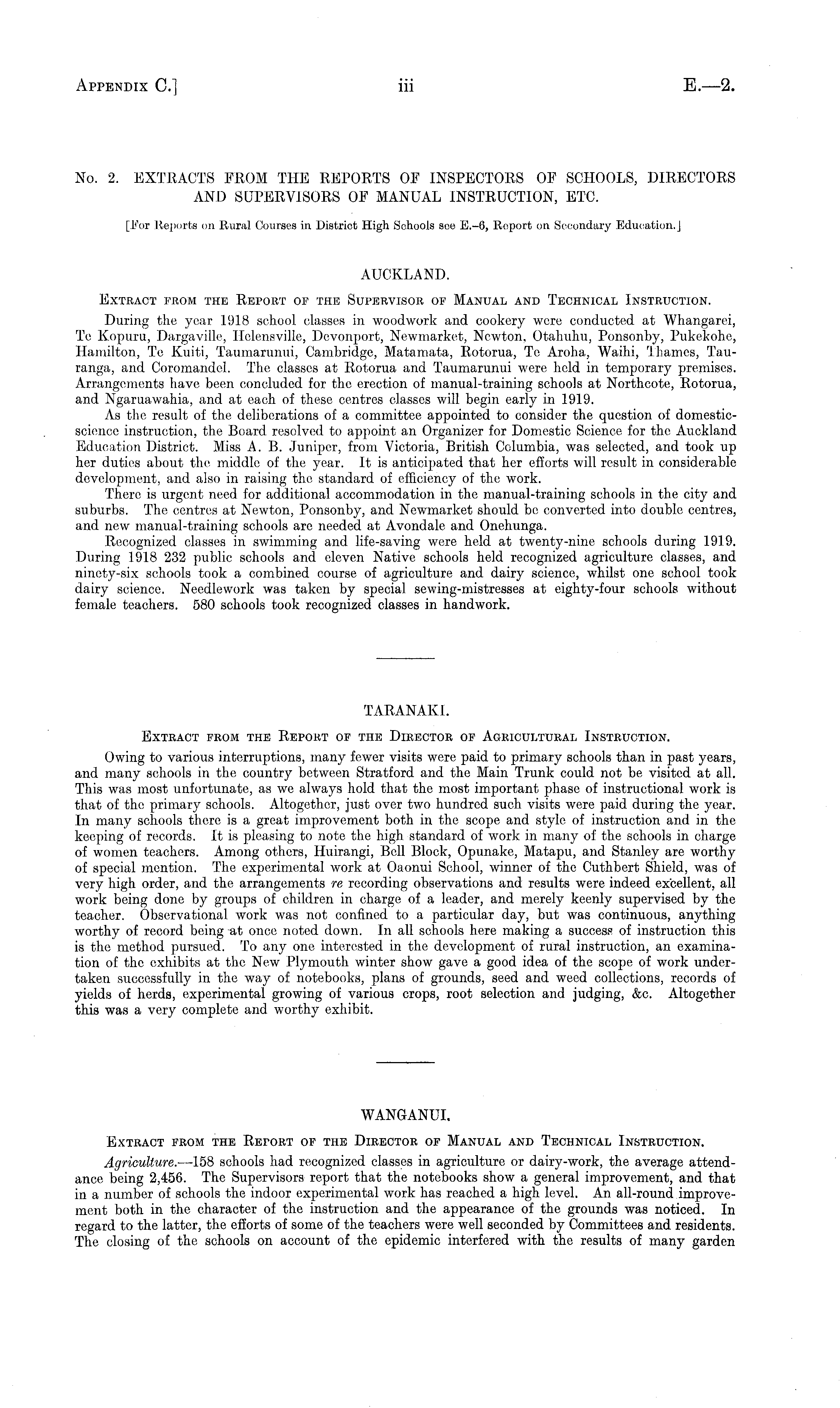 No. 2. EXTRACTS FROM THE REPORTS OF INSPECTORS OF SCHOOLS, DIRECTORS AND SUPERVISORS OF MANUAL INSTRUCTION, ETC. [For Reports on Rural Courses in District High Schools see 8.-6, Report on Secondary Education.] AUCKLAND. Extract from the Report of the Supervisor of Manual and Technical Instruction. During the year 1918 school classes in woodwork and cookery were conducted at Whangarei, Te Kopuru, Dargaville, Helensville, Devonport, Newmarket, Newton, Otahuhu, Ponsonby, Pukekohe, Hamilton, Te Kuiti, Taumarunui, Cambridge, Matamata, Rotorua, Te Aroha, Waihi, Thames, Tauranga, and Coromandel. The classes at Rotorua and Taumarunui were held in temporary premises. Arrangements have been concluded for the erection of manual-training schools at Northcote, Rotorua, and Ngaruawahia, and at each of these centres classes will begin early in 1919. As the result of the deliberations of a committee appointed to consider the question of domesticscience instruction, the Board resolved to apjioint an Organizer for Domestic Science for the Auckland Education District. Miss A. B. Juniper, from Victoria, British Columbia, was selected, and took up her duties about the middle of the year. It is anticipated that her efforts will result in considerable development, and also in raising the standard of efficiency of the work. There is urgent need for additional accommodation in the manual-training schools in the city and suburbs. The centres at Newton, Ponsonby, and Newmarket should bo converted into double centres, and new manual-training schools are needed at Avondale and Onehunga. Recognized classes in swimming and life-saving were held at twenty-nine schools during 1919. During 1918 232 public schools and eleven Native schools held recognized agriculture classes, and ninety-six schools took a combined course of agriculture and dairy science, whilst one school took dairy science. Needlework was taken by special sewing-mistresses at eighty-four schools without female teachers. 580 schools took recognized classes in handwork.
