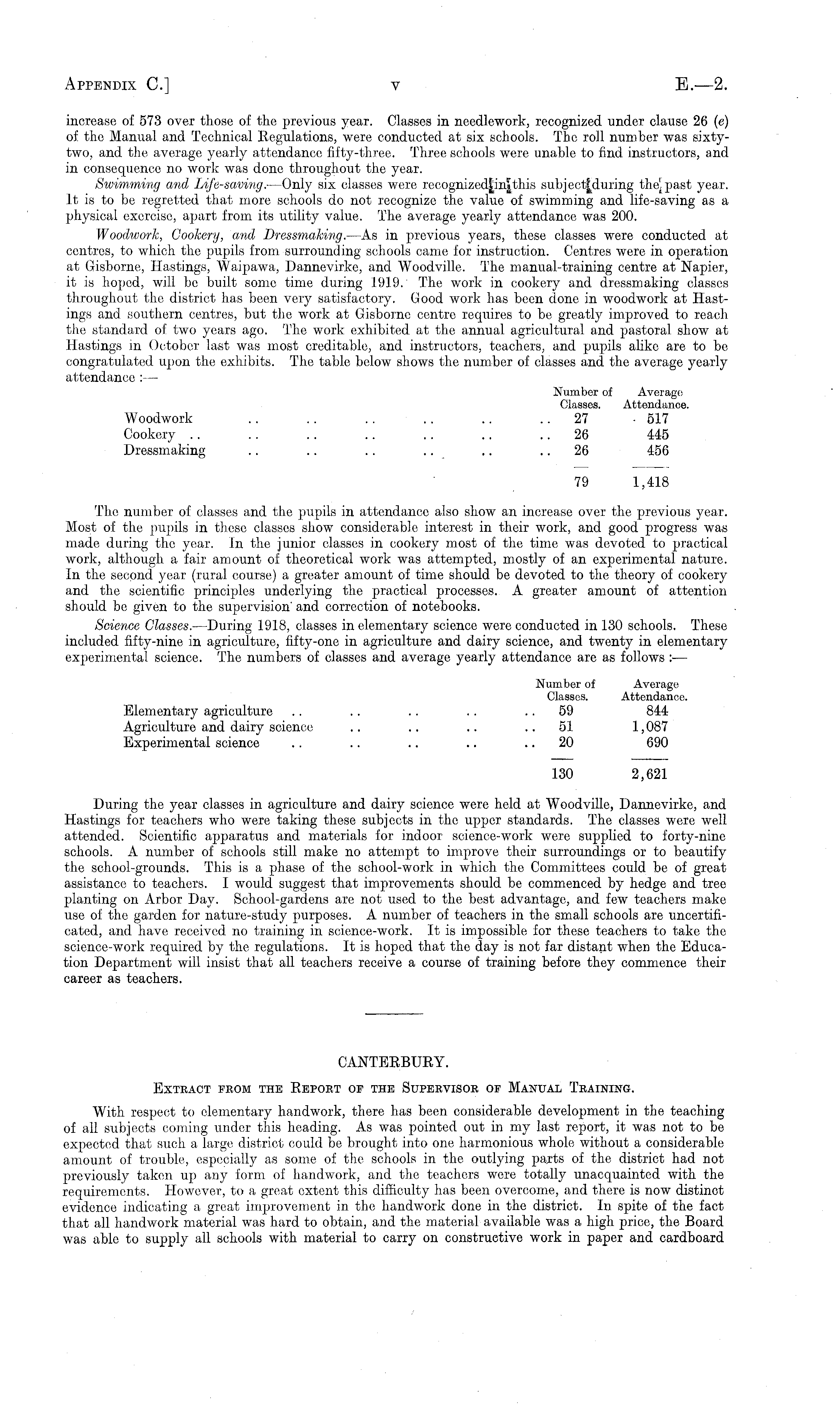 CANTERBURY. Extract from the Report of the Supervisor of Manual Training. With respect to elementary handwork, there has been considerable development in the teaching of all subjects coming under this heading. As was pointed out in my last report, it was not to be expected that such a large district could be brought into one harmonious whole without a considerable amount of trouble, especially as some of the schools in the outlying parts of the district had not previously taken up any form of handwork, and the teachers were totally unacquainted with the requirements. However, to a great extent this difficulty has been overcome, and there is now distinct evidence indicating a great improvement in the handwork done in the district. In spite of the fact that all handwork material was hard to obtain, and the material available was a high price, the Board was able to supply all schools with material to carry on constructive work in paper and cardboard