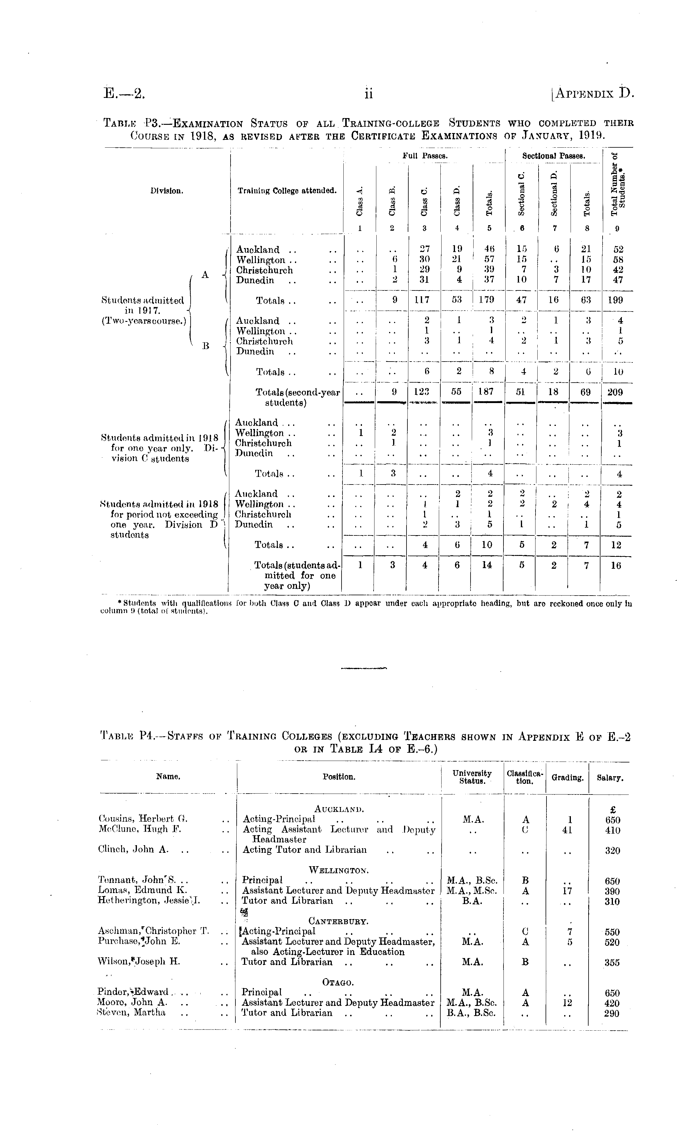 Division. Training College attended. -f, 1 o 1 Full Passes. rf O fl' a ',% % % =5 « d _ o 5 o H 2 3 4 5 Sectional Pai d O 2 a a d .9 .9 CO to 6 7 sses. !/> o E-l o Sa ss a a _J H 8 9 Students admitted \ in 1917. ('Two-yearscourse.) / B I Auckland Wellington Christchurch Dunodin Totals Auckland Wellington Christchurch Dunedin 27 19 ' 46 6 30 21 57 1 29 9 39 2 31 4 37 9 117 53 179 2 1 3 .. 1 .. I 3 I 4 15 6 15 7 i 3 10 7 47 16 2 1 21 15 10 17 63 3 52 58 42 47 199 4 I 5 •2: ■. 3 .. .... Totals 6 2 ' 8 4 2 0 10 Students admitted in 1918 for one year only. Di- - vision C students Totals (second-year students) 9 123 55 | 187 51 18 69 209 • Auckland ... Wellington . . .. 1 Christchurch Dunedin 2 '.'. .. 3 1 .. .. 1 3 1 Totals .. .. 1 3 .. .. 4 4 Students admitted in 1918 for period not exceeding I one year. Division D J students Auckland Wellington Christchurch Dunedin 2 2 ..112 1 .. 1 2 3 5 2 I .. 2 2 1 2 o 4 2 4 1 5 I '.'. i Totals Totals (students ad- 1 mitted for one year only) 4 6 10 3 4 6 14 5 2 5 2 I 2 2 i 7 7 12 16 •Students with qualification column 9 (total of students!. is for both Class C and Class 1) appci ir undoi each a.] tpropriato heading, but ire recki med oin only in